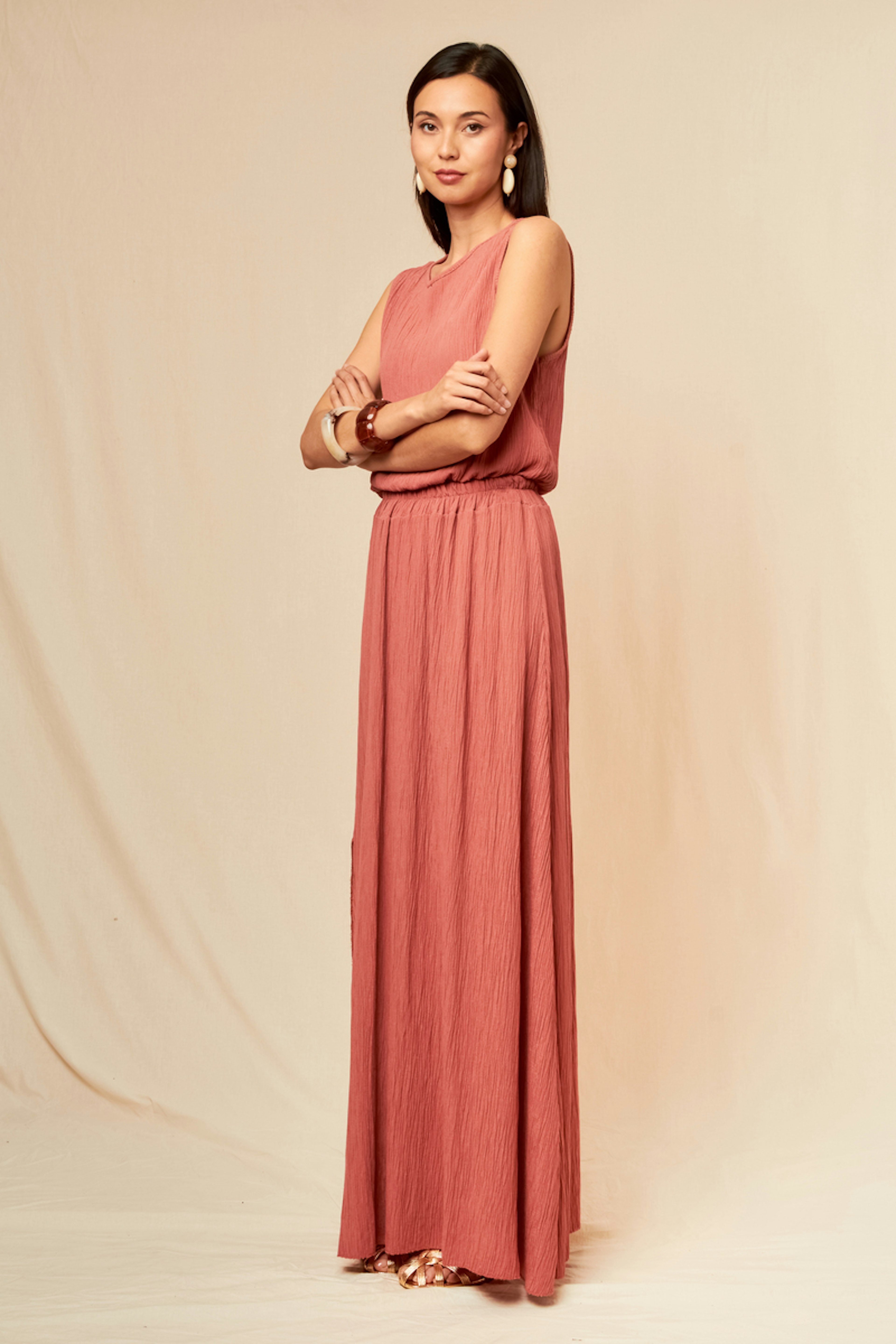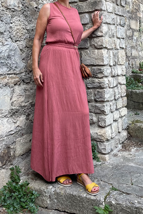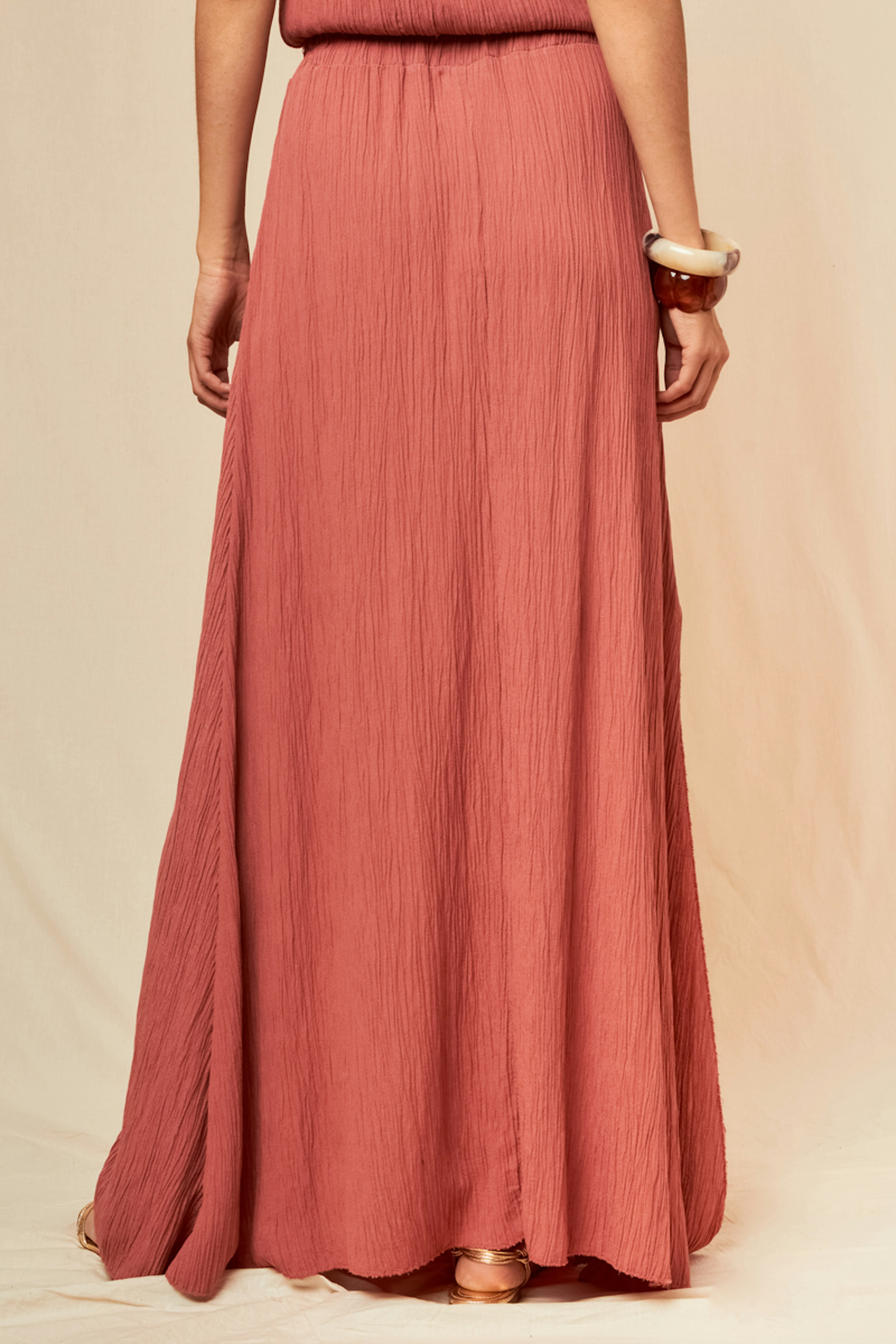 Associez cette jupe fluide à un haut léger et des sandales dorées pour un look estival aérien. Ajoutez des boucles d'oreilles pendantes pour la touche finale ! • Jupe longue fluide • Taille élastique confortable • Tissu plissé élégant • Fente discrète • Couleur rose séduisante