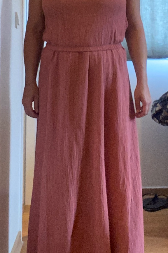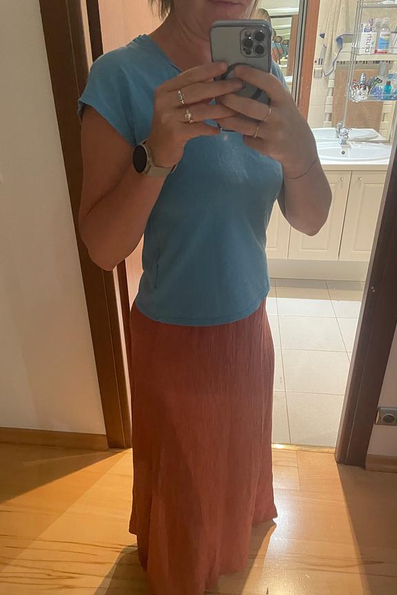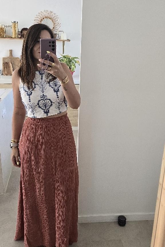 “Cette jupe taille un peu grand, elle est assez longue mais en enroulant sur lui-même l'élastique à la taille et en cachant tout ça par le haut coordonné ça allait et donnait un effet robe. Matière agréable et jolie.”