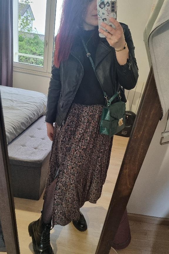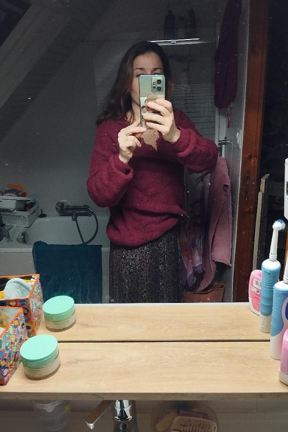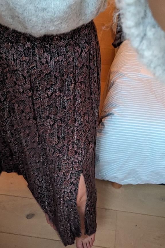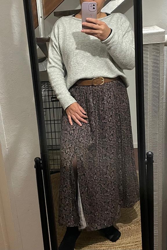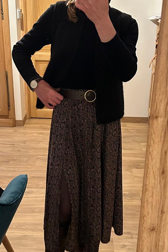 “Jupe sympa. Le motif contient des fils irisés. Le tissu est plutôt fin et la fente s'ouvrait beaucoup. Pas gênant parce que la fente n'est pas trop profonde, mais on voyait tout le temps l'envers du tissu.”