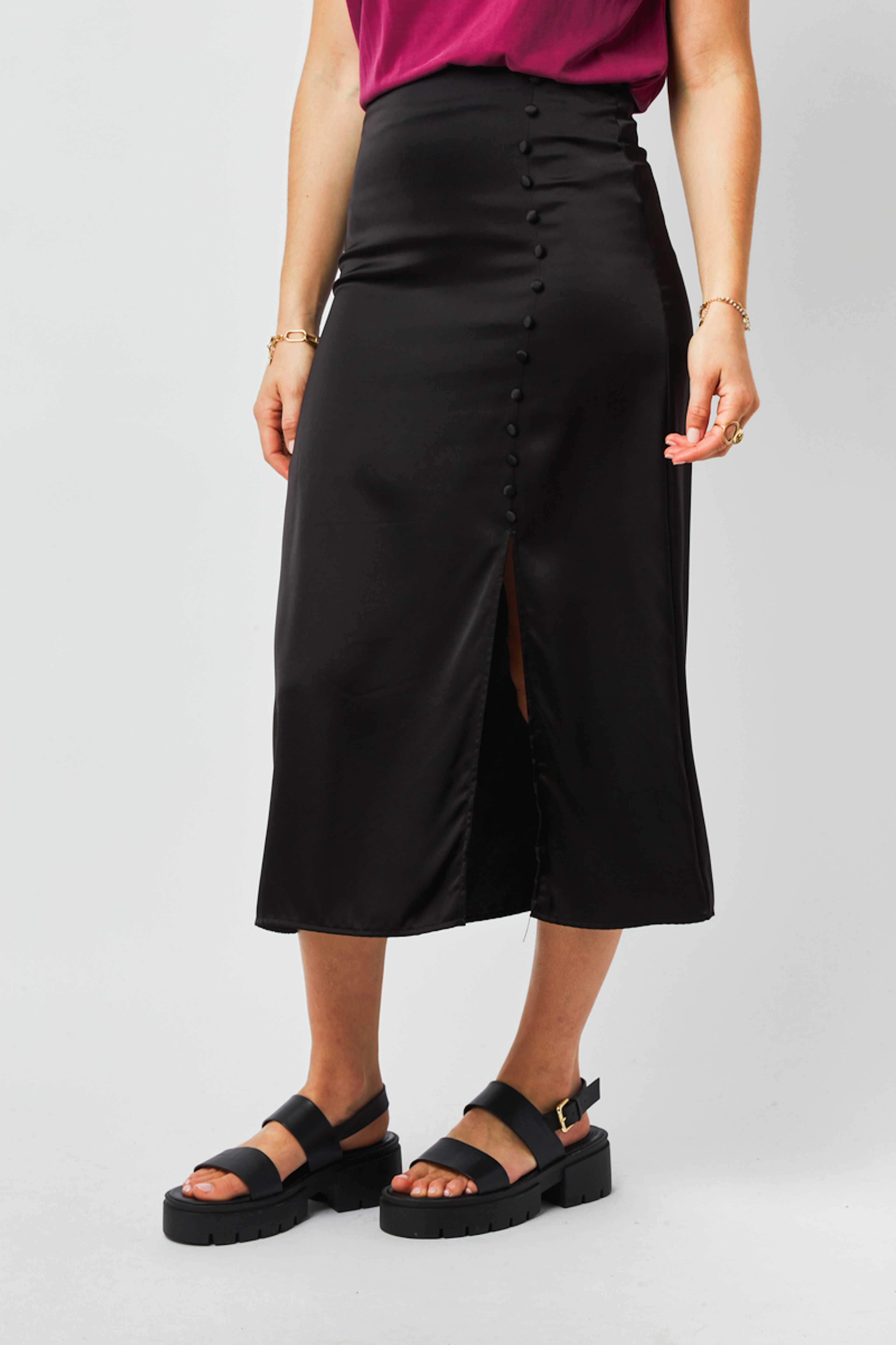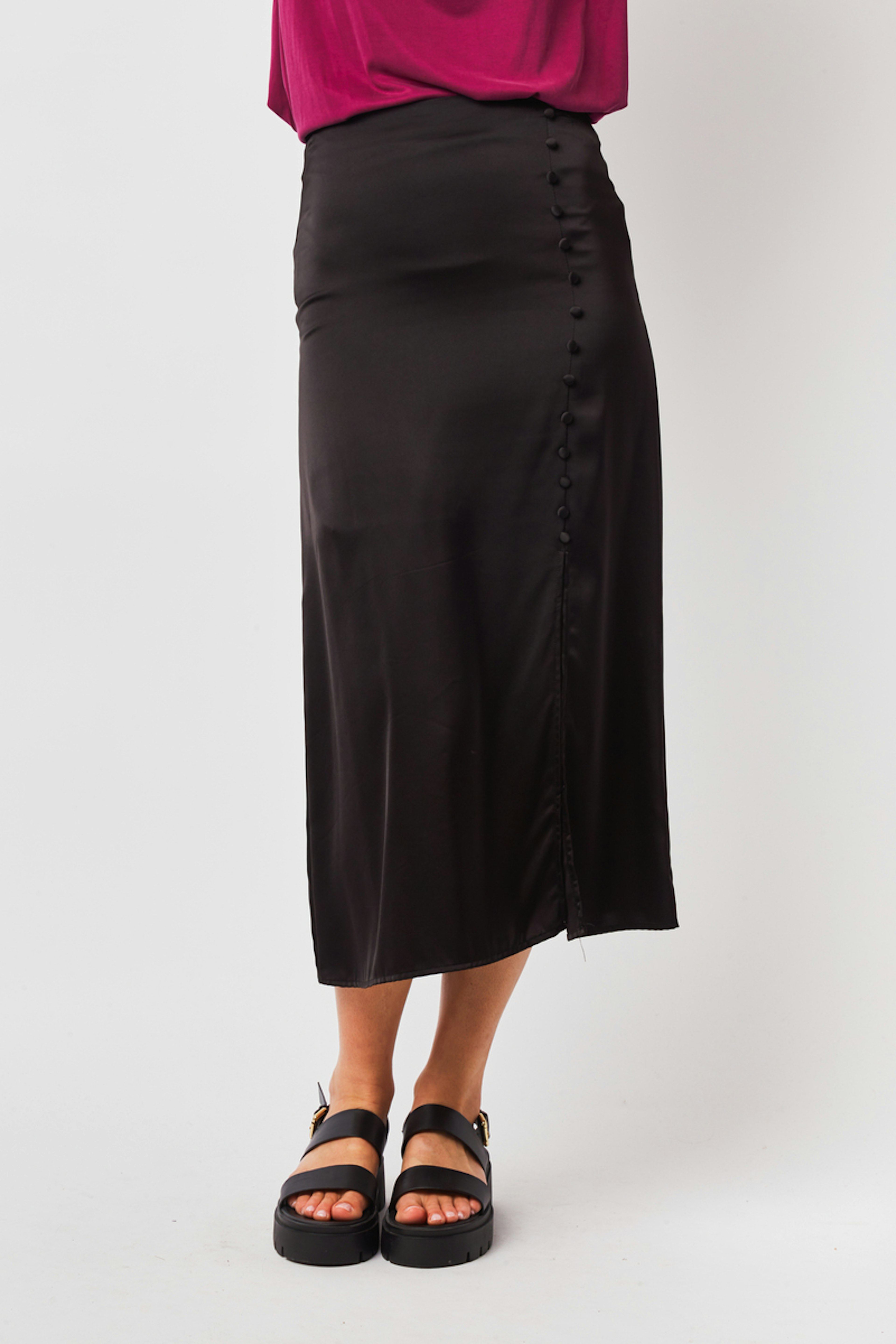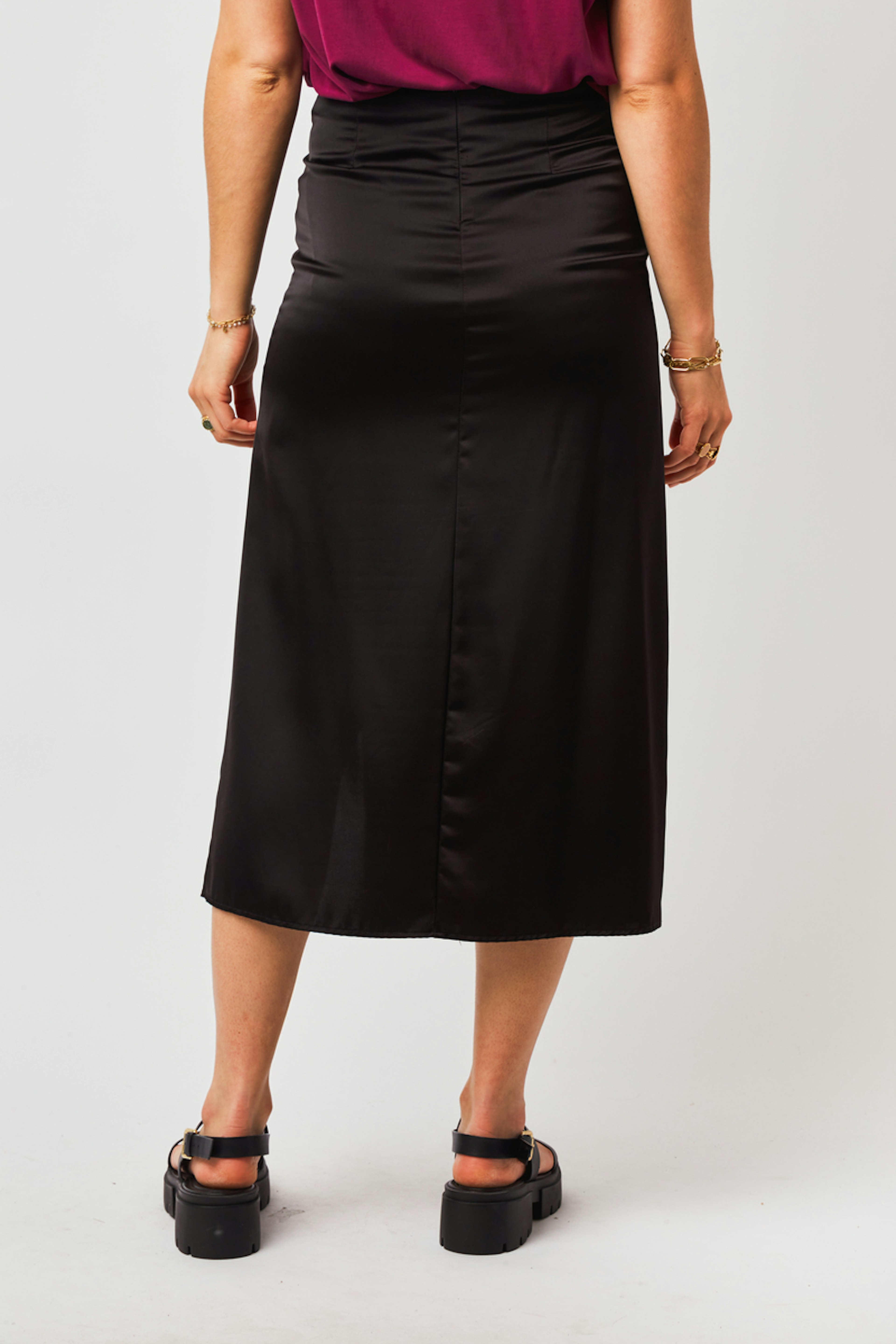 โข Jupe Macie โข Couleur unie โข Longueur : mi-longue โข Fente sur le cรดtรฉ โข Taille resserรฉe