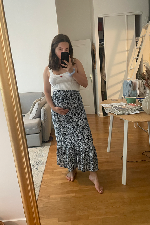 โข Jupe longues aux imprimรฉs floraux blancs et noirs โข Taille รฉlastiquรฉe โข Coupe fluide et รฉvasรฉe โข Volants sur le bas de la jupe โข Une jupe qui s'adapte parfaitement ร votre ventre en pleine croissance !