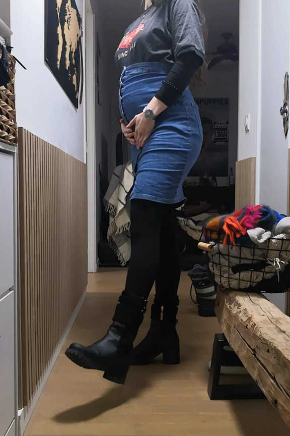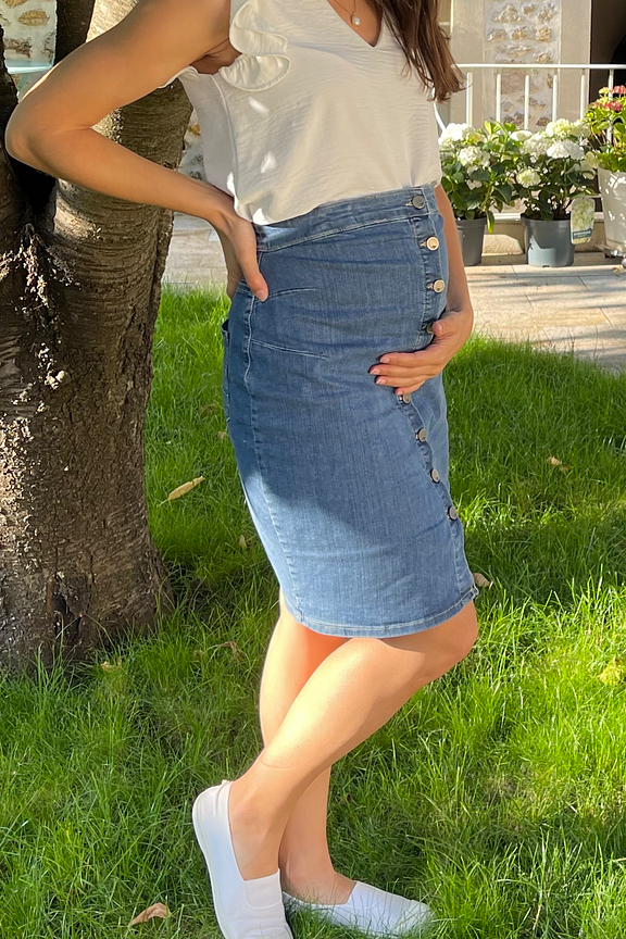 Envolez-vous vers l'รฉlรฉgance confortable avec cette jupe en jean maternitรฉ. Associez-la ร un top fluide pour un look dรฉcontractรฉ-chic. โข Jupe maternitรฉ mi longue en denim โข Taille ajustable haute โข Deux poches plaquรฉes derriรจre โข Fermeture centrale boutonnรฉes โข Deux pinces sur les cรดtรฉs