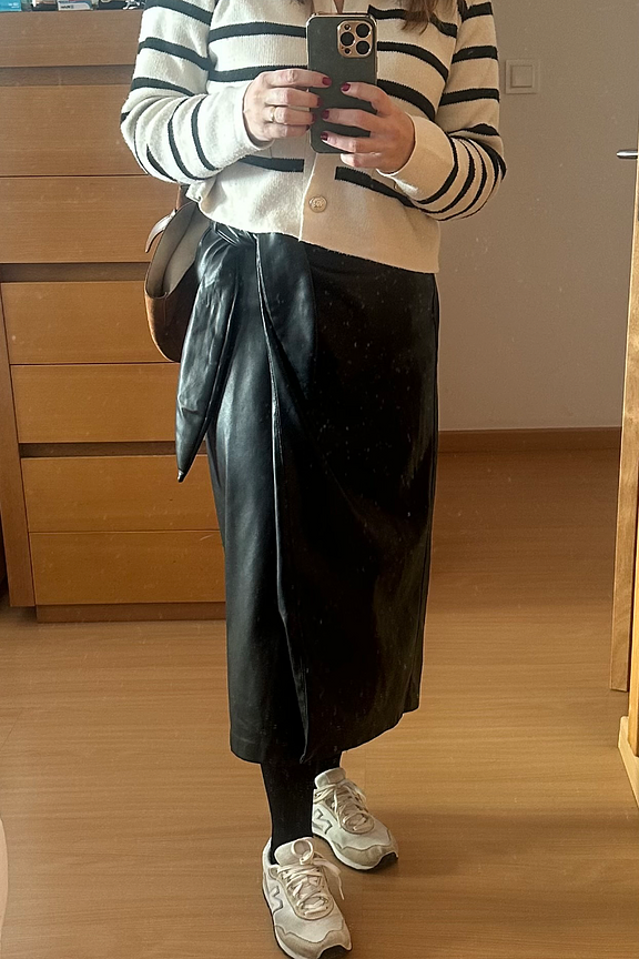 Associez cette jupe avec un pull en cachemire pour un look chic et confortable cet hiver. • Jupe mi-longue simili cuir • Coupe portefeuille • Fermeture nouée à la taille • Fente subtile à l'avant • Noir intemporel