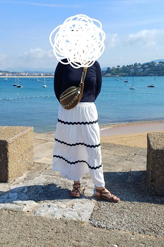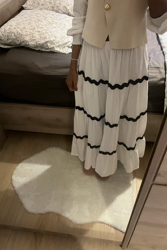 Ajoutez un top pastel et des sandales dorées pour un look estival parfait! • Jupe maxi en coton-lin • Taille élastique pour confort • Volants superposés • Motif contrasté noir • Coupe aérienne et fluide