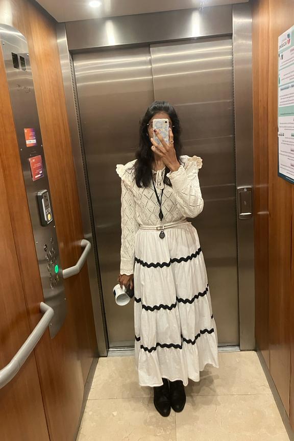 “Coup de ❤️ ! Peu de plis, tissu de belle tenue. Elle est chic et affine la silhouette malgré mon petit ventre 🤗”