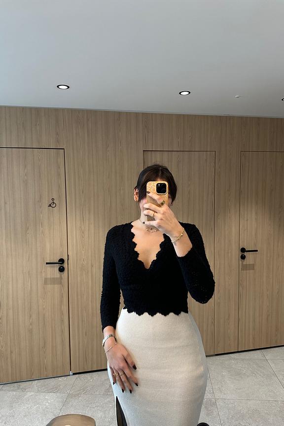 Associez cette jupe en maille écrue avec un pull ample et des bottes hautes pour un look hivernal chic et confortable. • Jupe en maille près du corps • Coupe ajustée • Longueur mi-mollet • Fente élégante • Texture côtelée