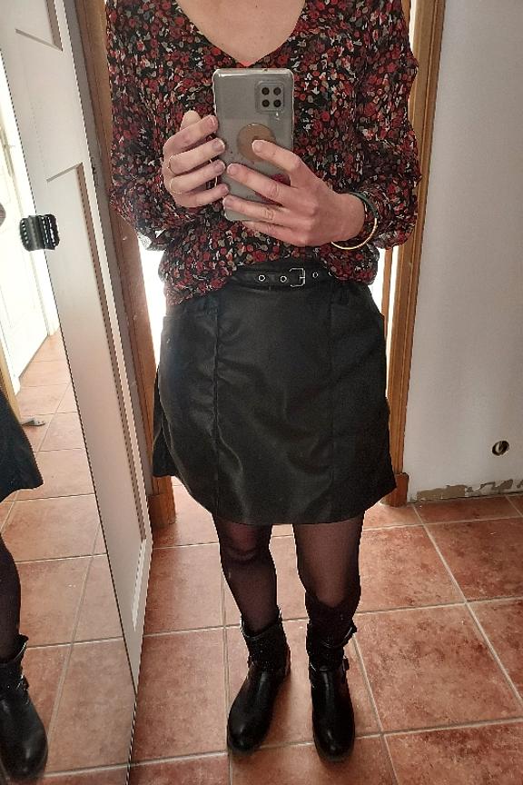 โข Jupe en simili-cuir โข Taille รฉlastiquรฉe โข Poches devant โข Ceinture ร la taille