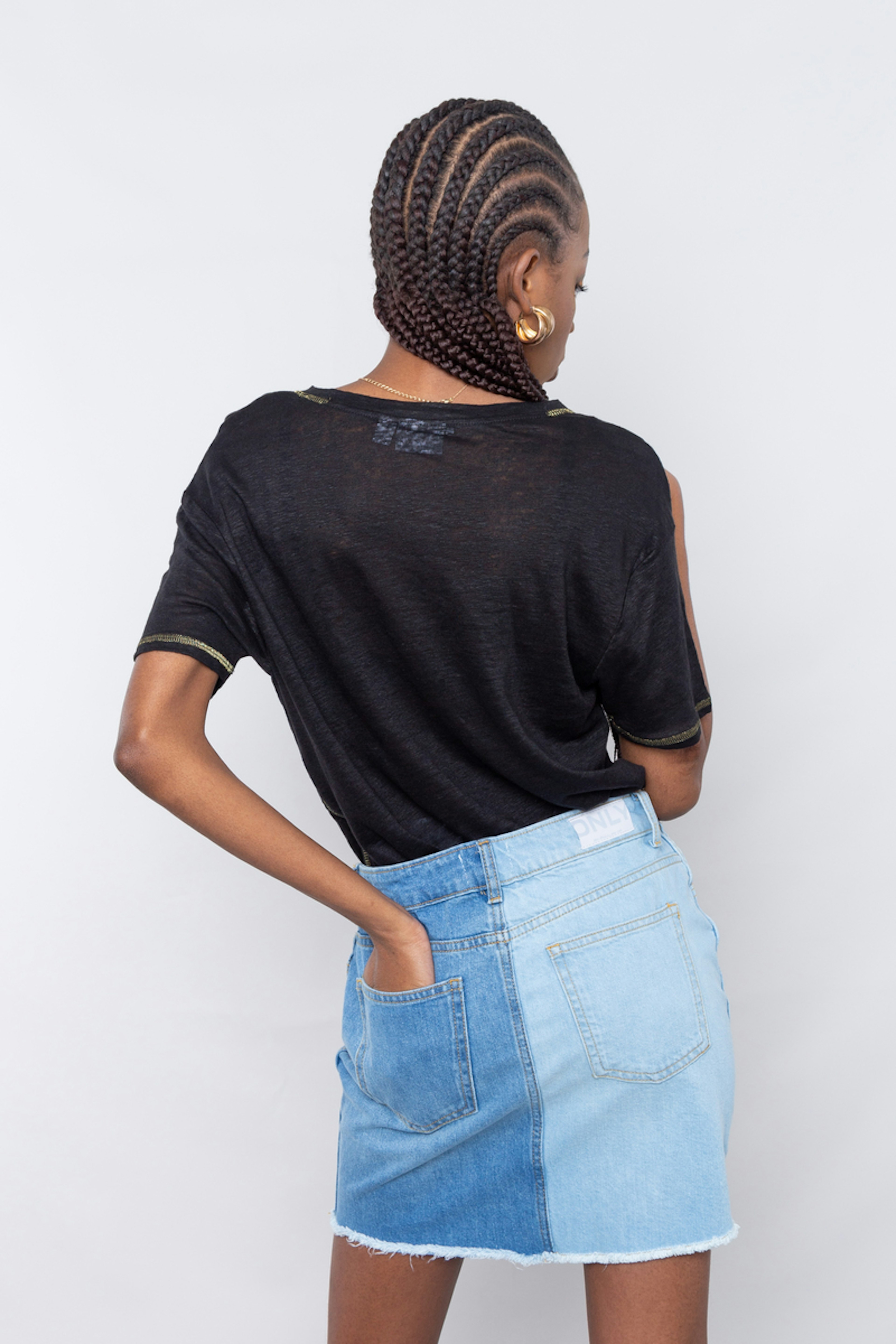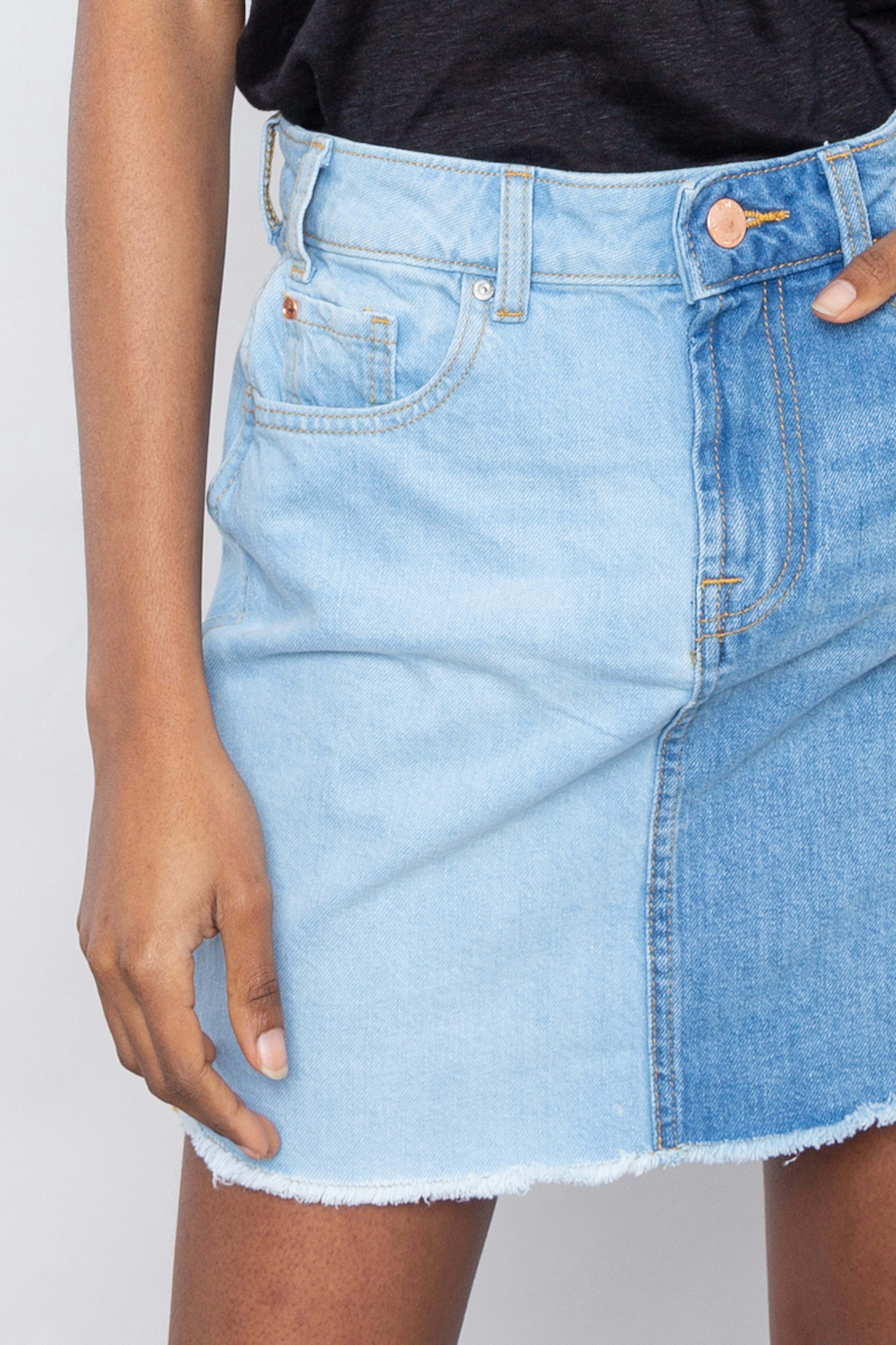 โข Jupe courte en denim bicolore โข Bord brut โข Longueur au-dessus du genou