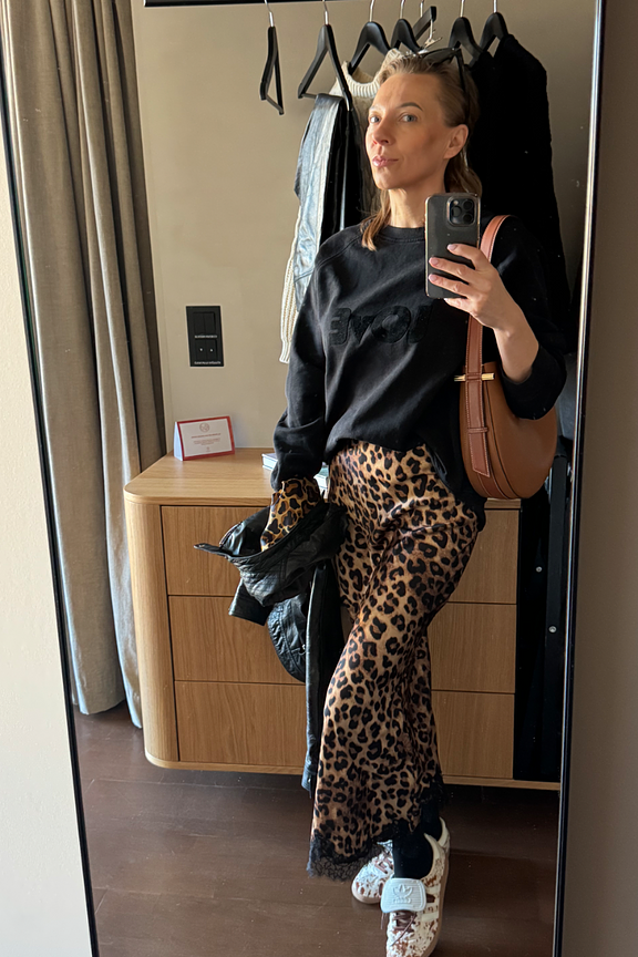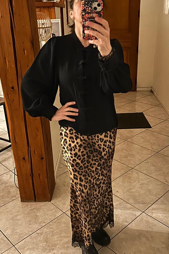 Ajoutez une touche chic avec un pull en cachemire et des bottines en cuir pour un look sophistiqué cet hiver. • Jupe longue • Coupe fluide • Taille élastique • Motif léopard • Ourlet en dentelle
