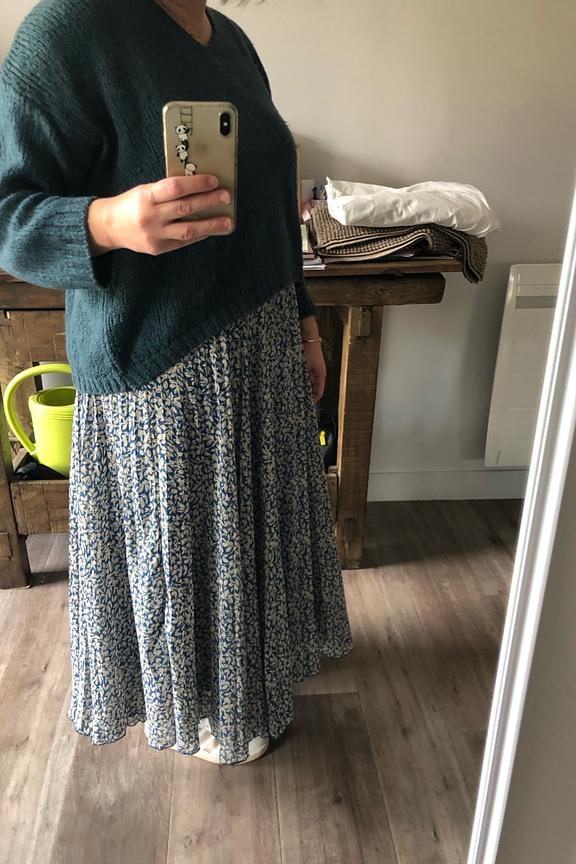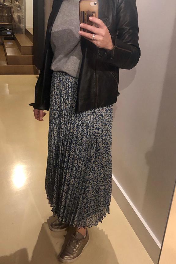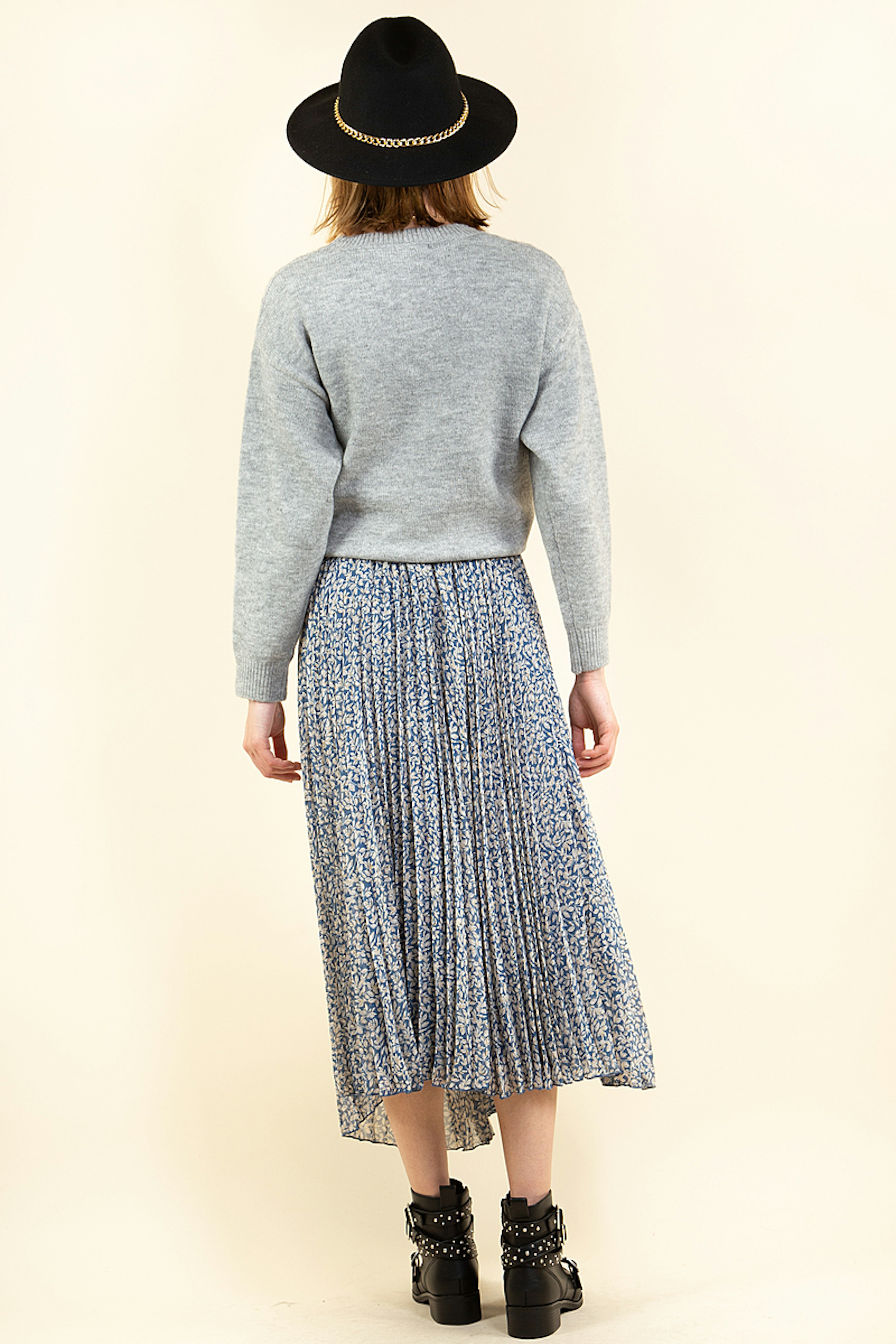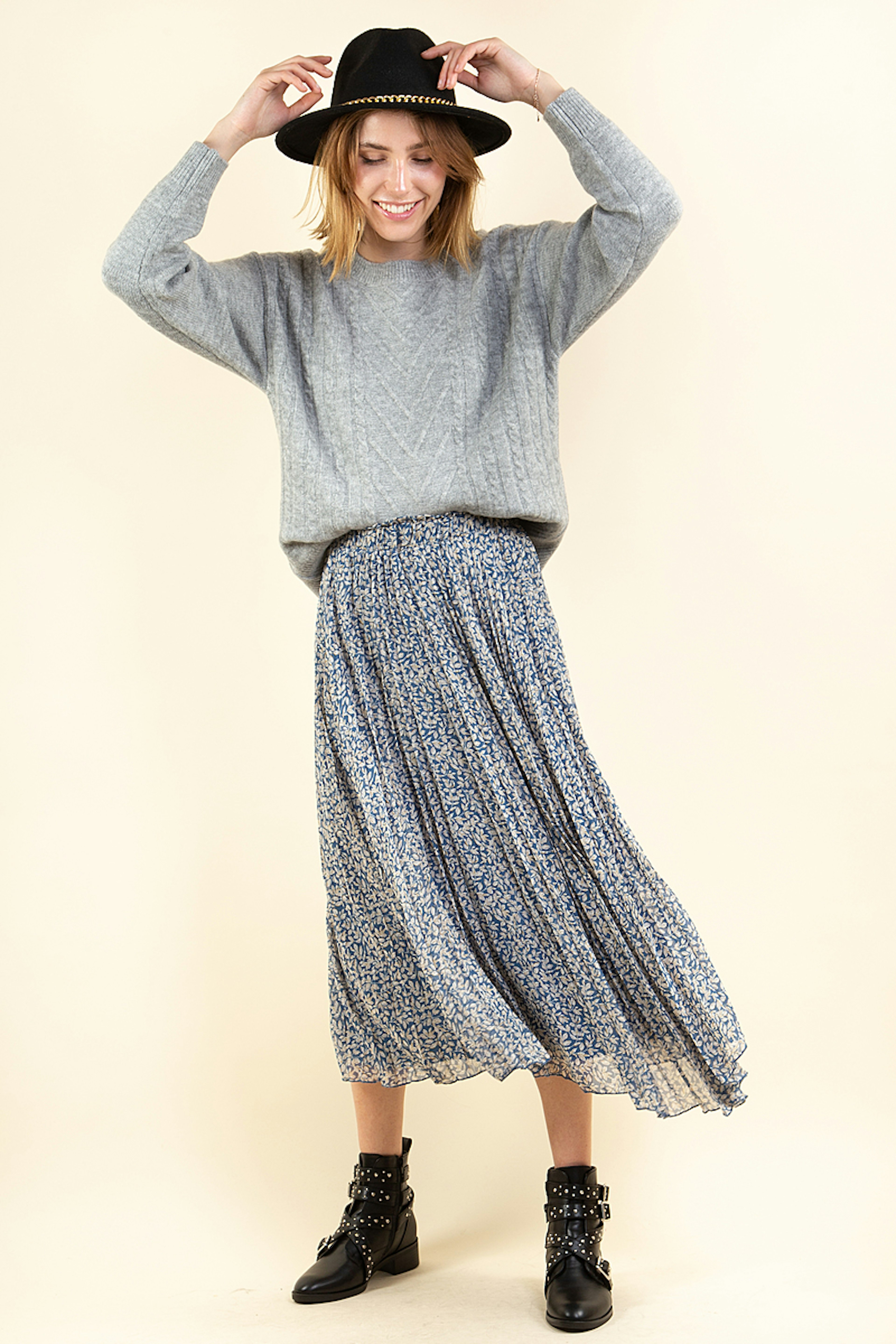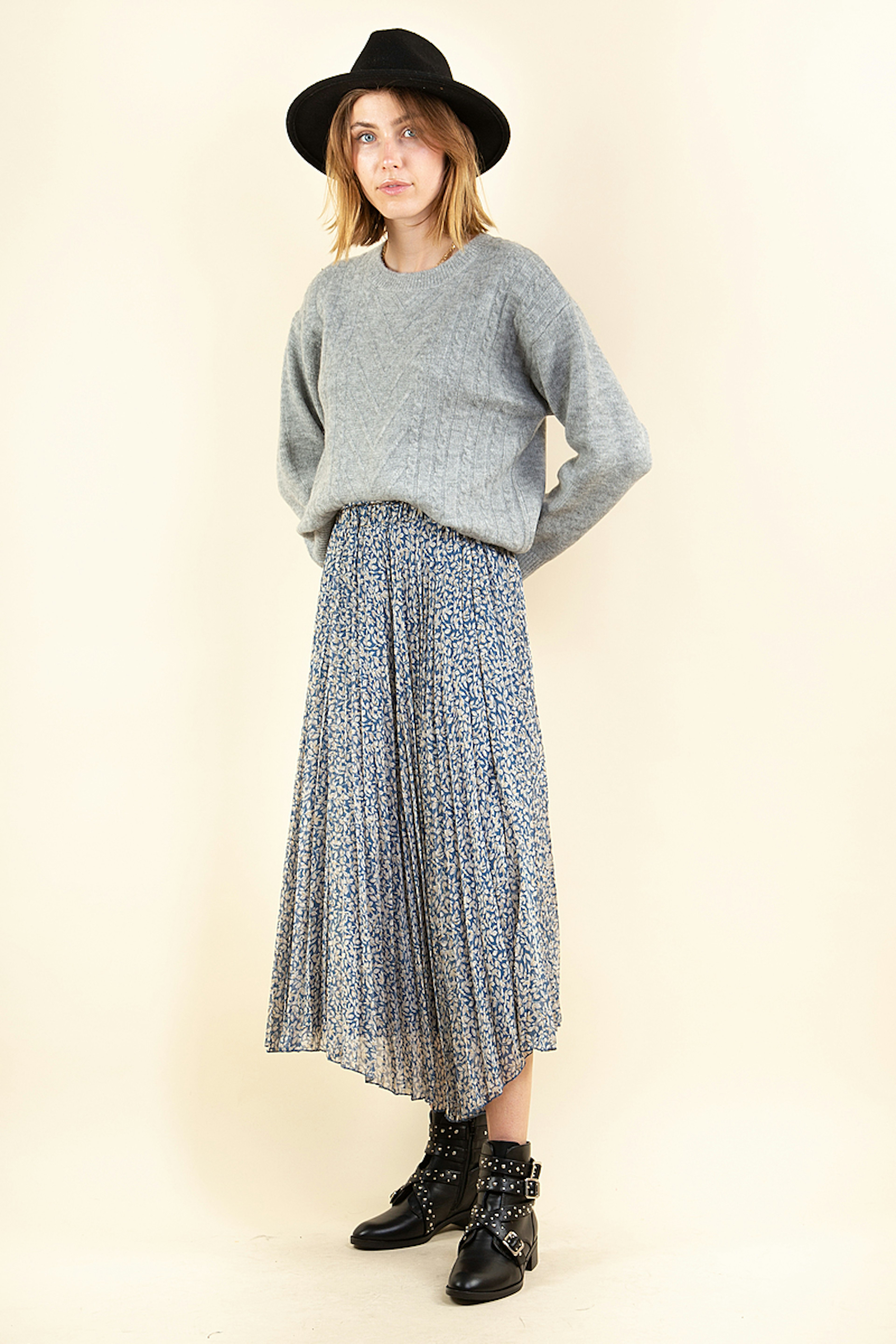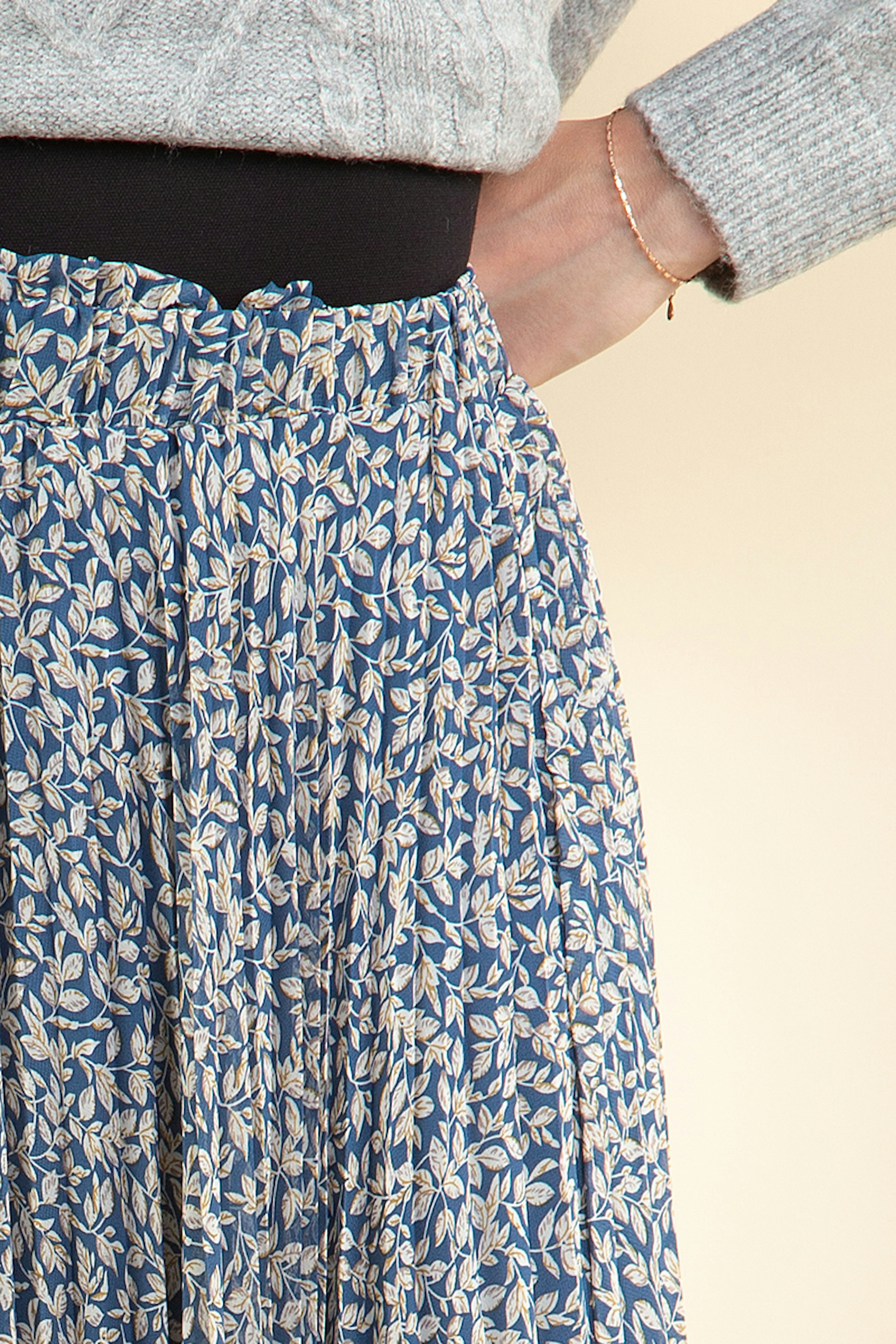 Roy est une jupe plissรฉe imprimรฉe qui se porte aussi bien l'รฉtรฉ avec un top que l'hiver avec une grosse maille. โข Jupe plissรฉe bleue ร la taille รฉlastiquรฉe โข Motif fleuri โข Longueur midi โข Coupe asymรฉtrique sur le devant