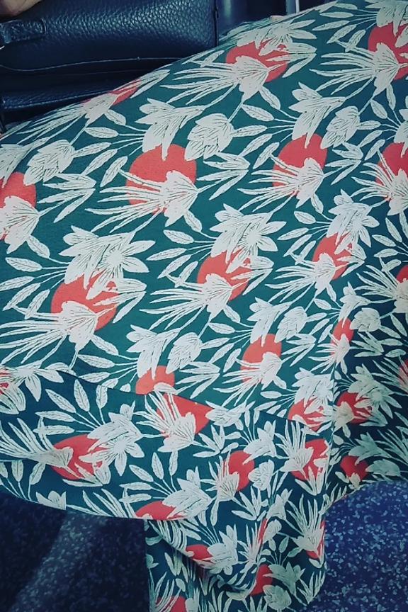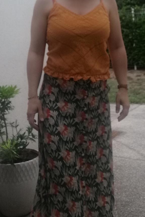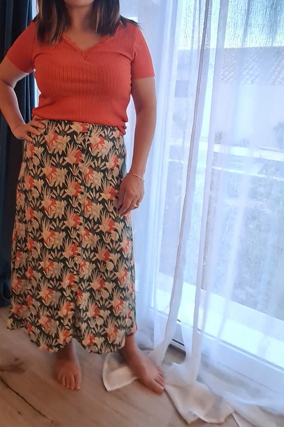 โข Jupe midi imprimรฉe โข Tissu en viscose imprimรฉ tropical vert, orange et beige โข Boutons le long de la jupe โข Longueur midi