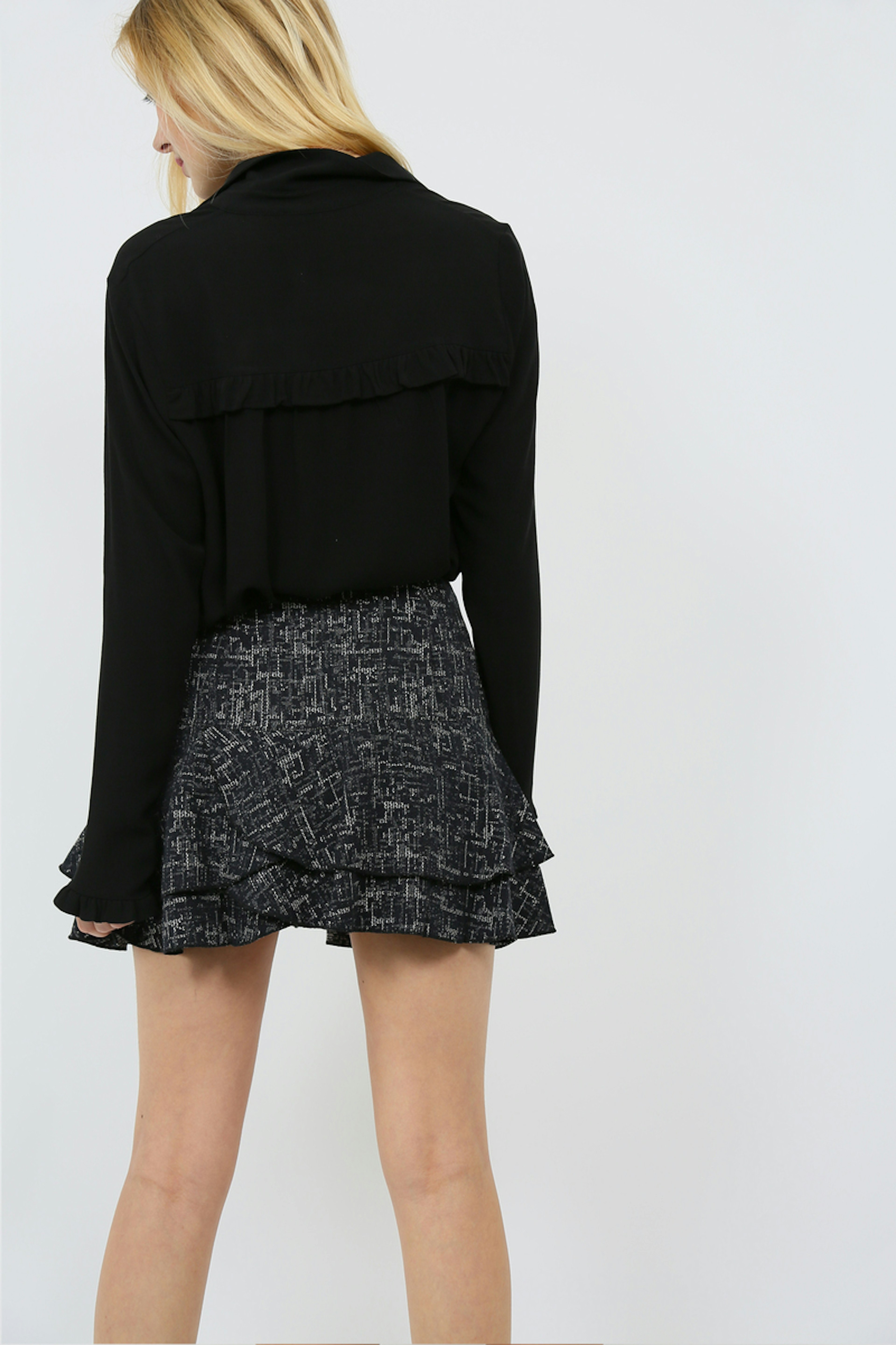 Jupe ร volants imprimรฉ graphique. <b>Tailles:</b> S, M, L <b>Couleur:</b> Fond noir avec imprimรฉ gris et blanc