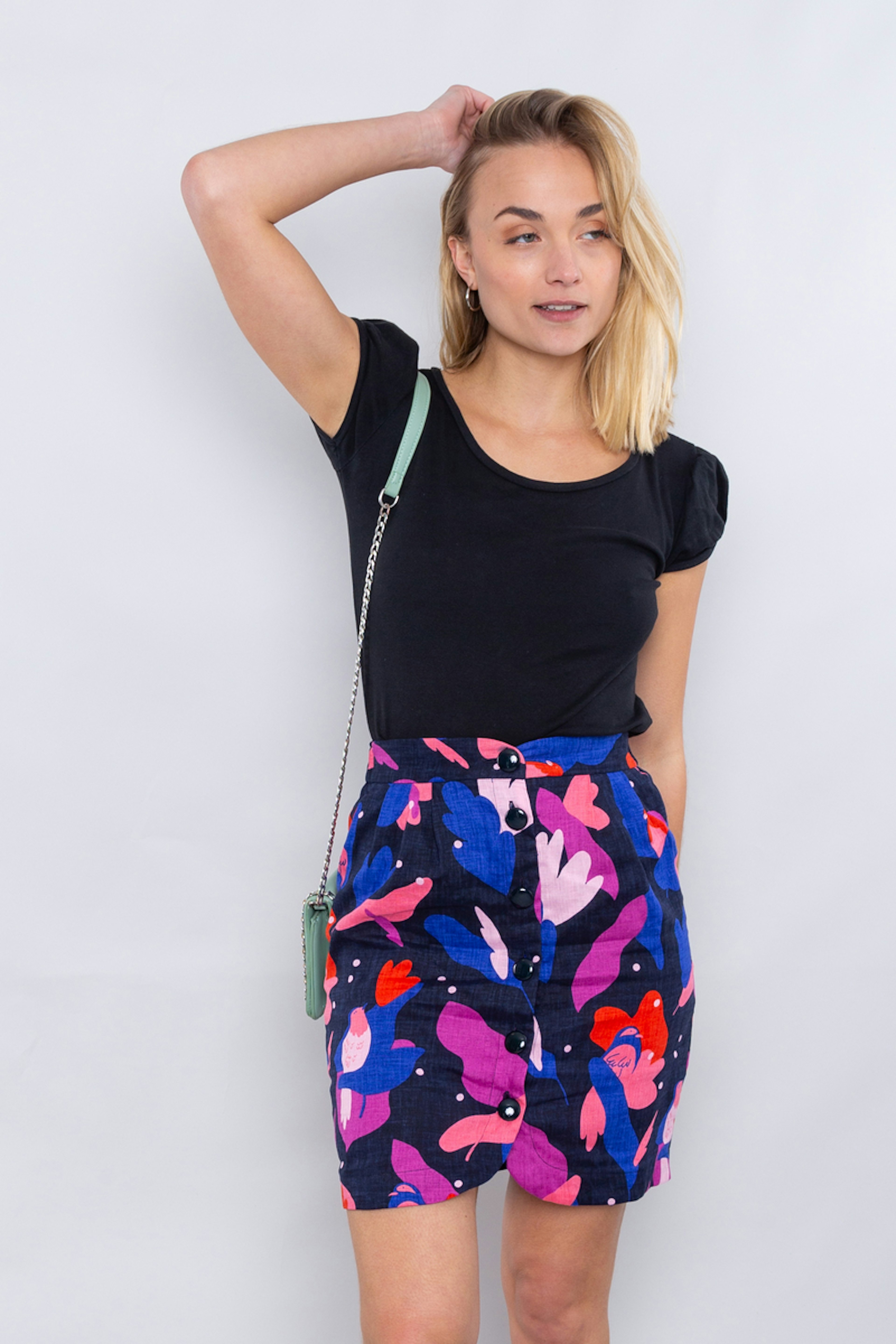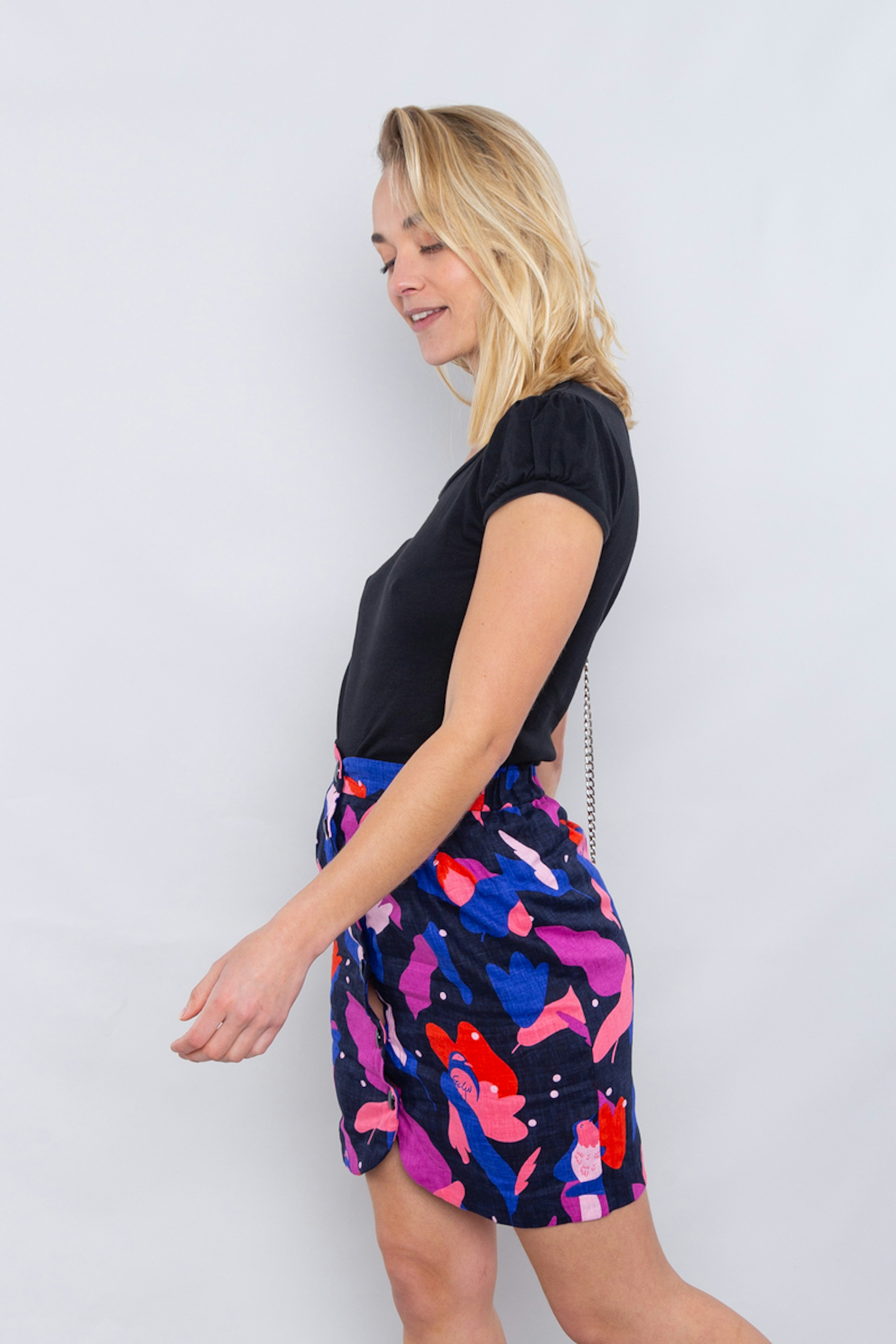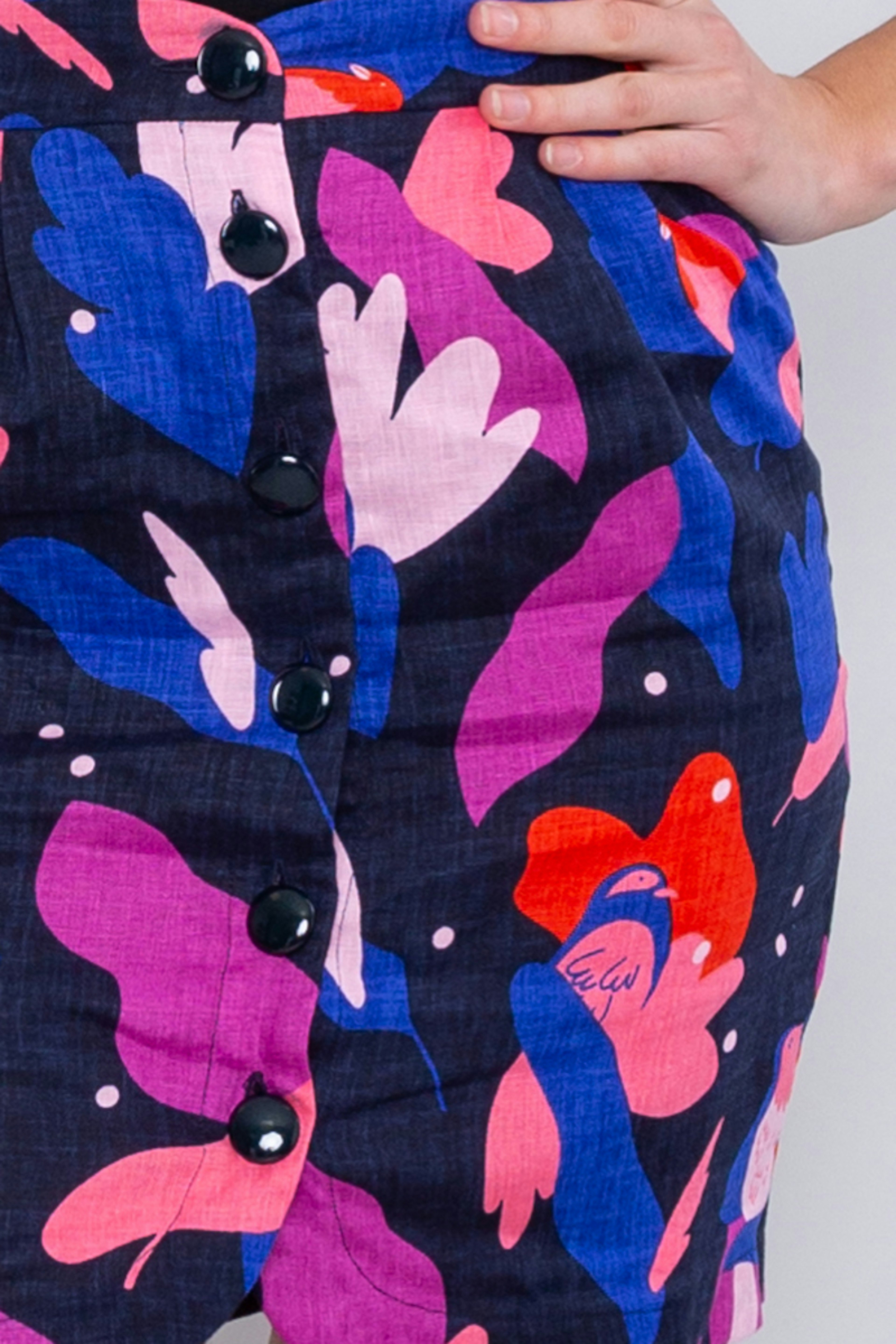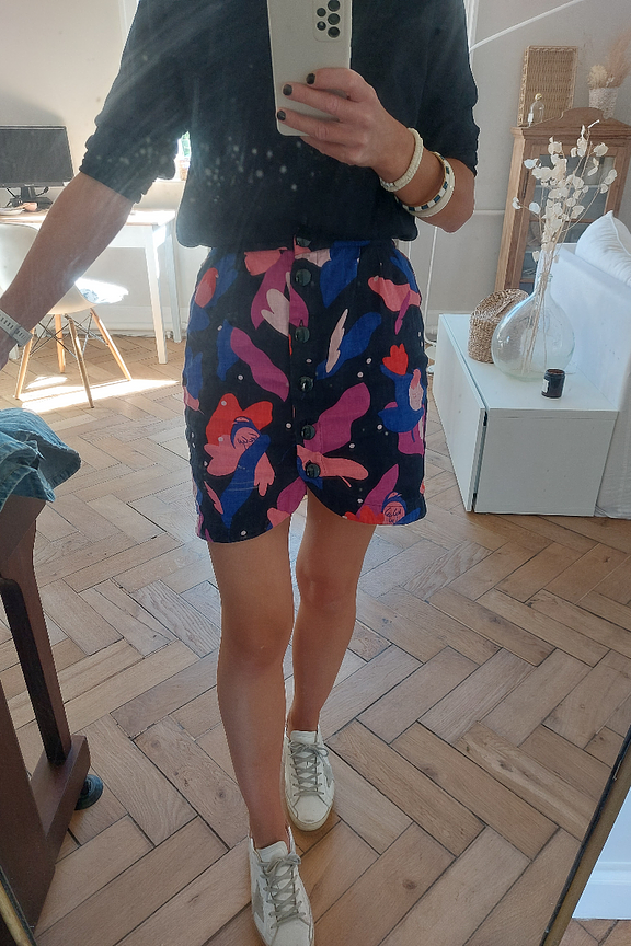 โข Jupe courte imprimรฉe colorรฉe sur fond noir โข Entiรจrement boutonnรฉe sur le milieu devant โข Tissu en lin agrรฉable ร porter l'รฉtรฉ