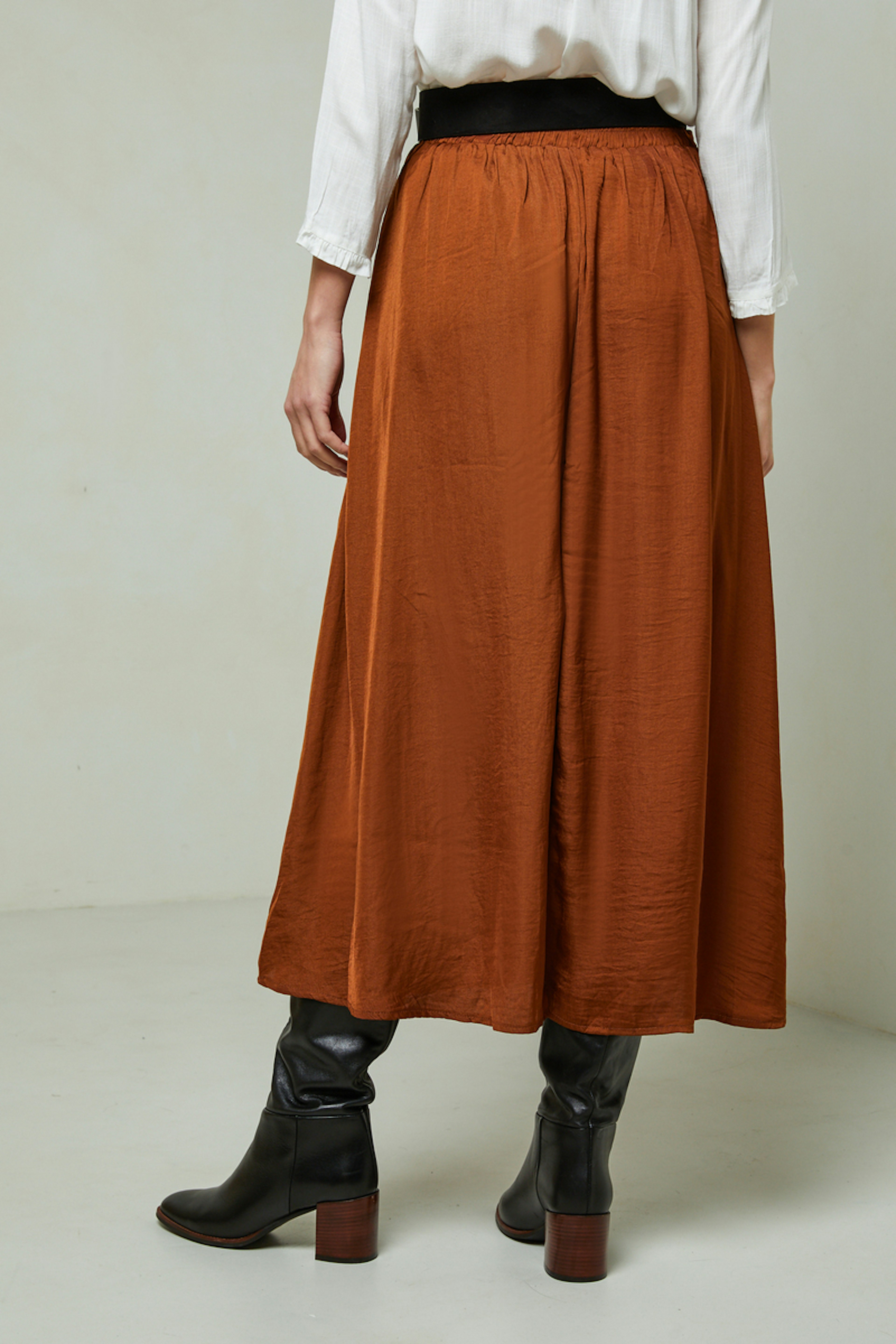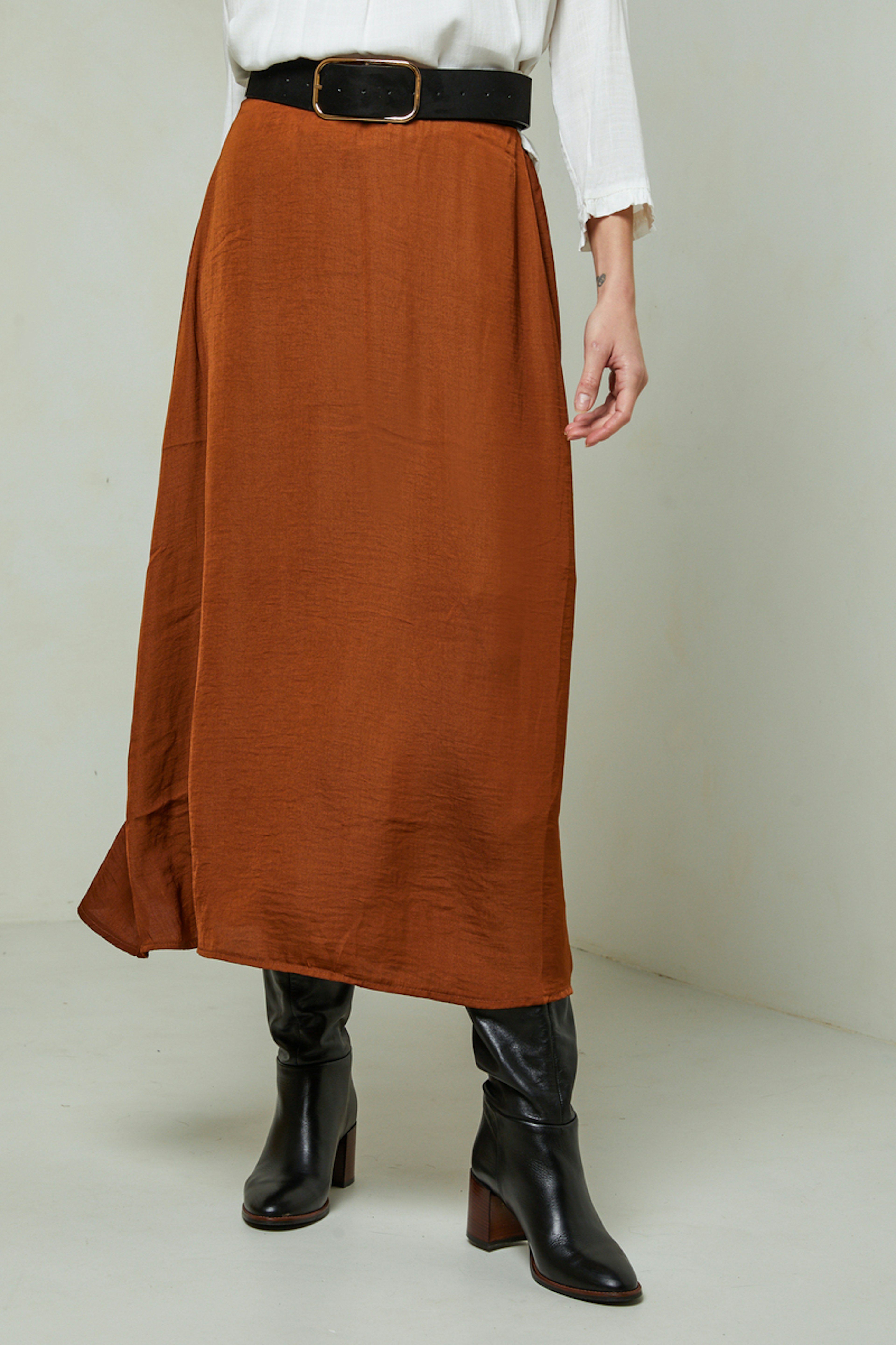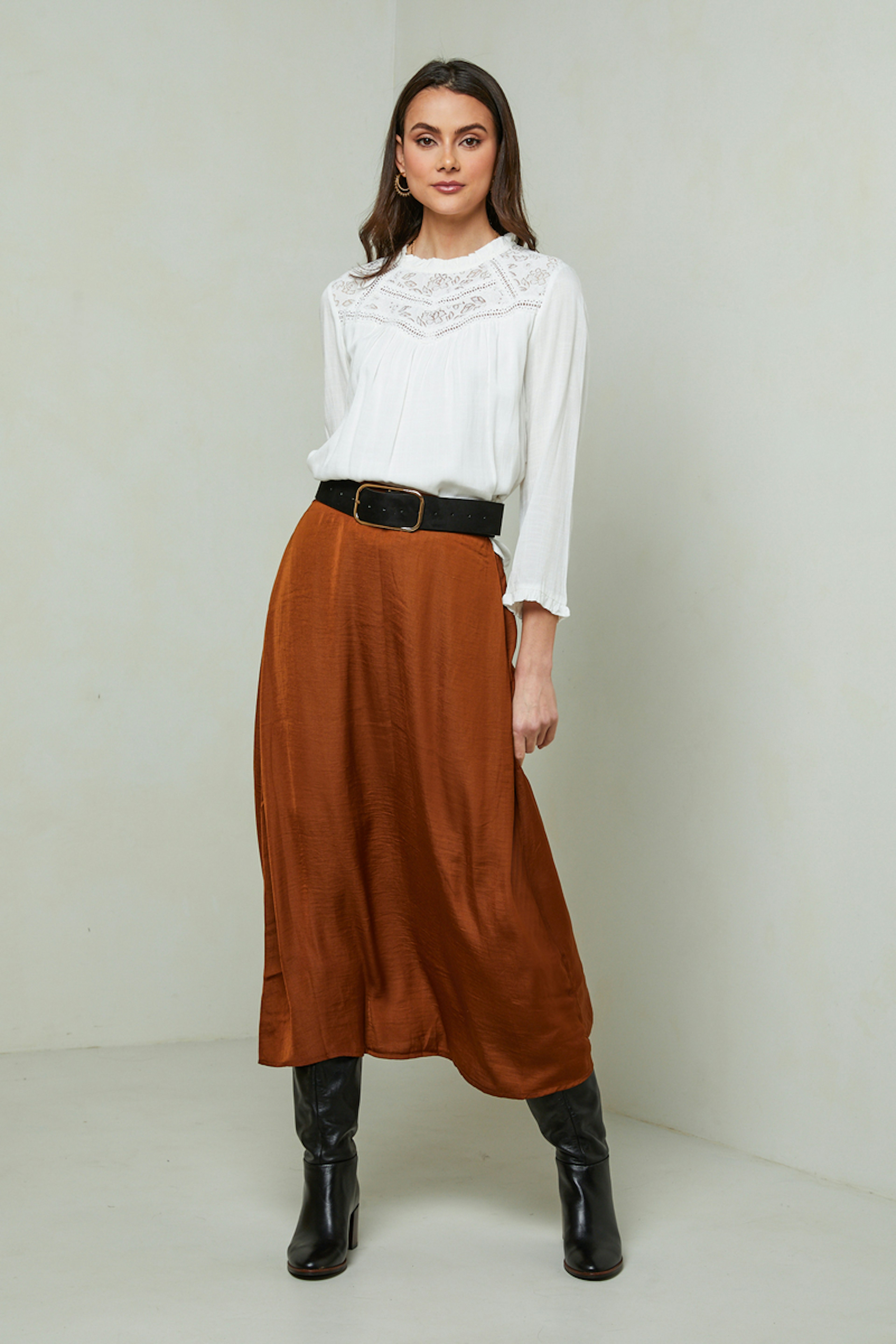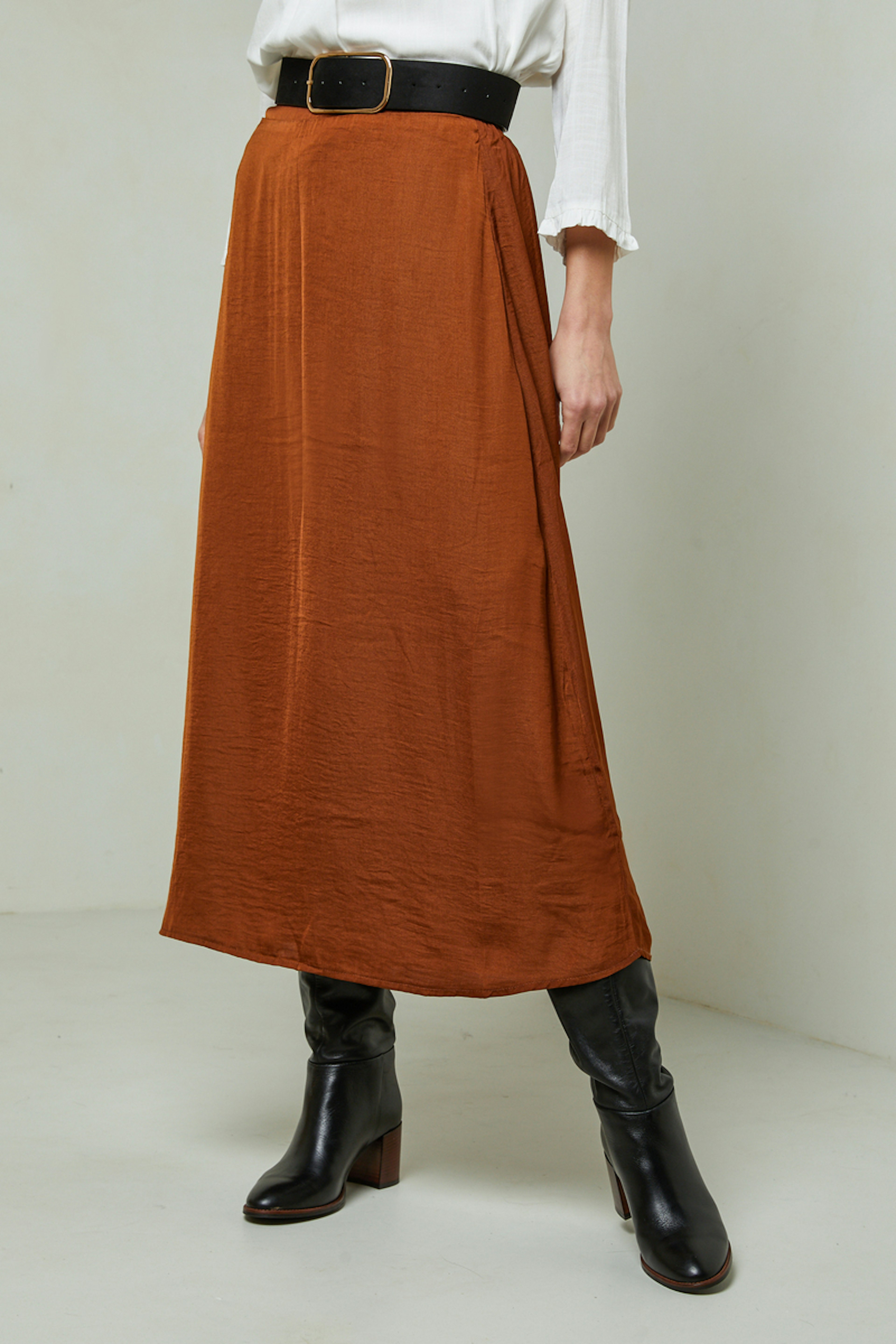 Fluide et lรฉgรจre, cette jupe en satin mat sublime la silhouette et apporte de la fรฉminitรฉ ร un look. Elle sโadapte ร tous les styles, casual ou habillรฉ. Une piรจce tendance ร porter en journรฉe comme en soirรฉe. - Jupe longue รฉvasรฉe satinรฉ camel mat - Ceinture taille รฉlastique