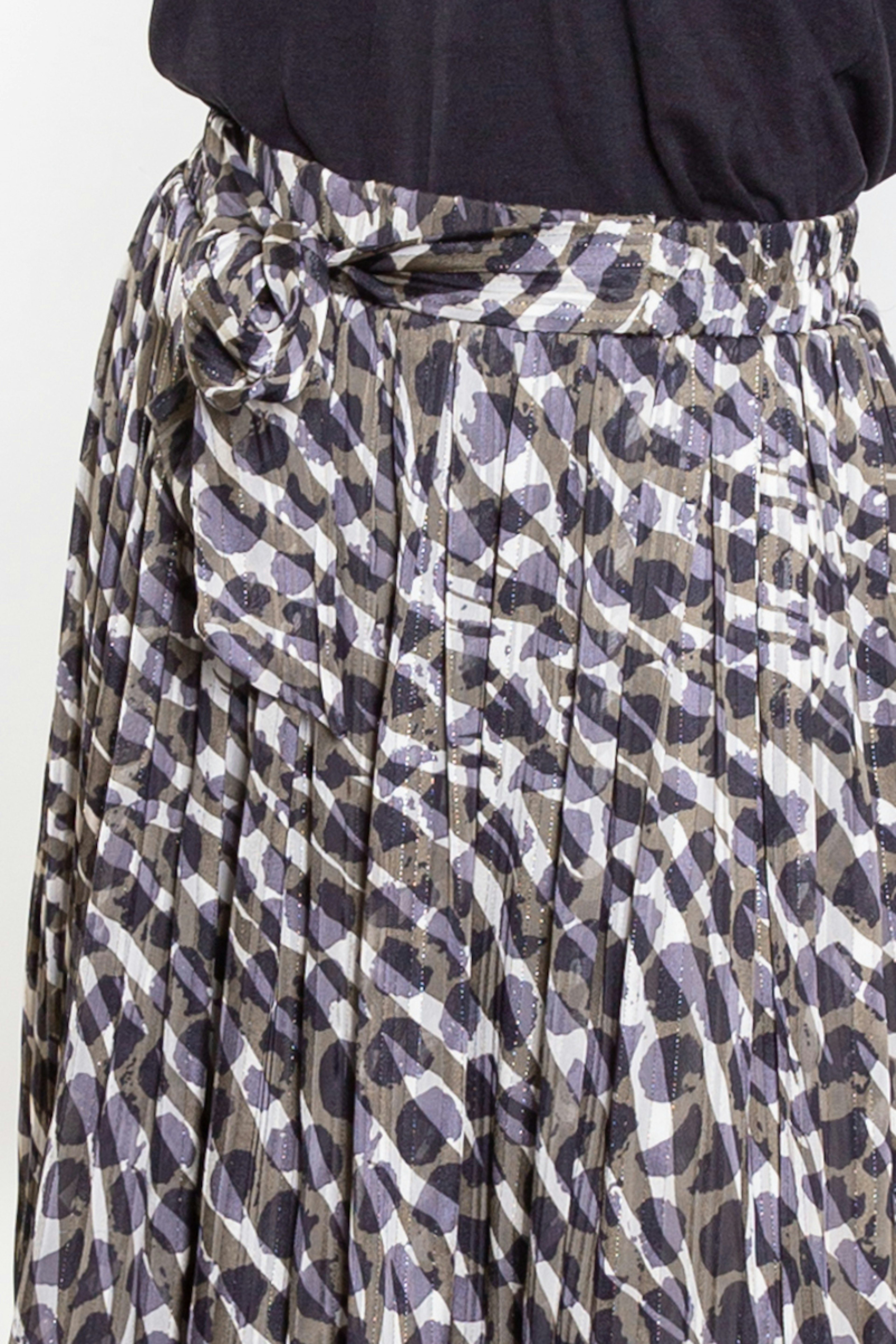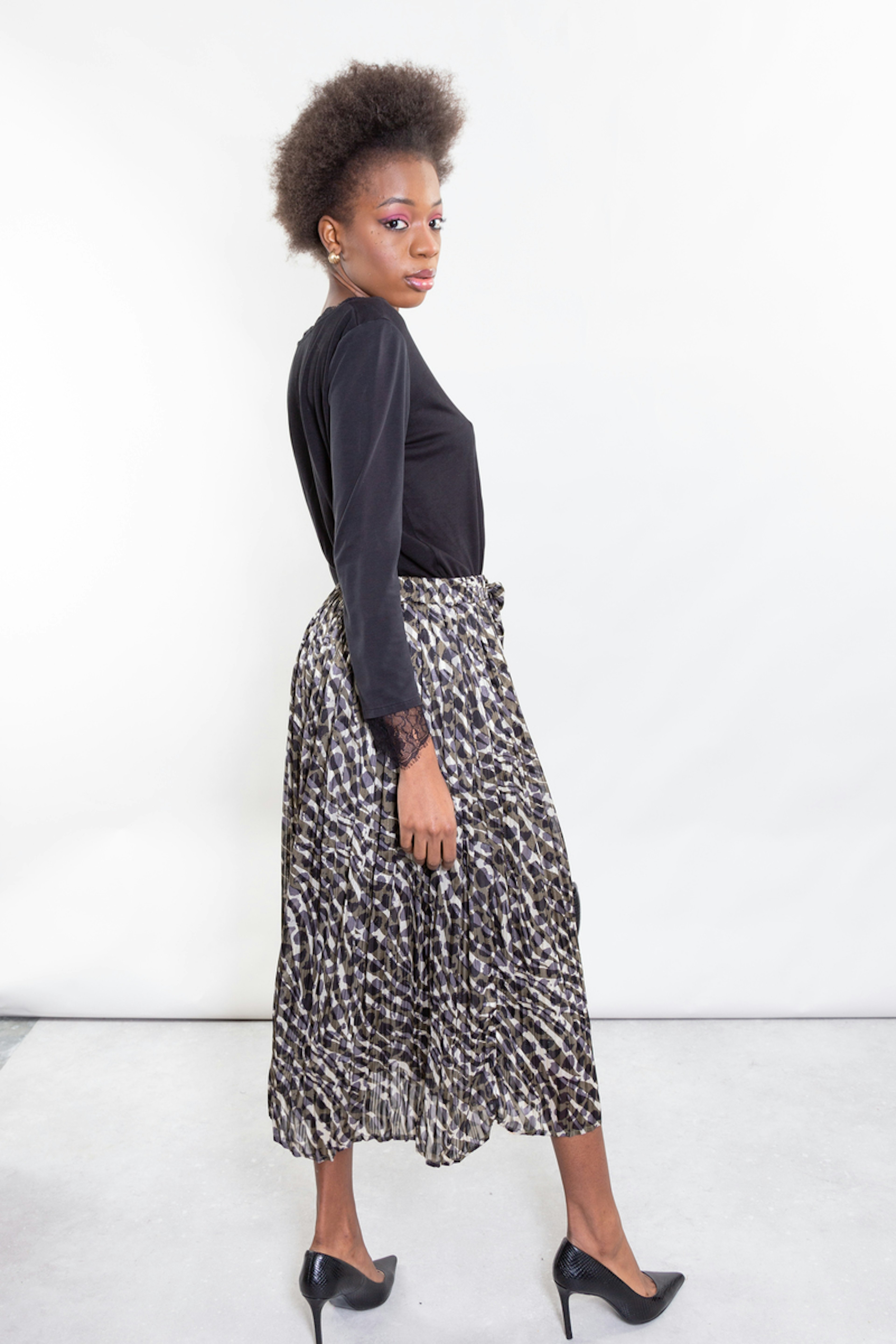 โข Jupe plisรฉe tempรชte โข Longueur midi โข Lien ร nouer ร la taille โข Imprimรฉ tendance