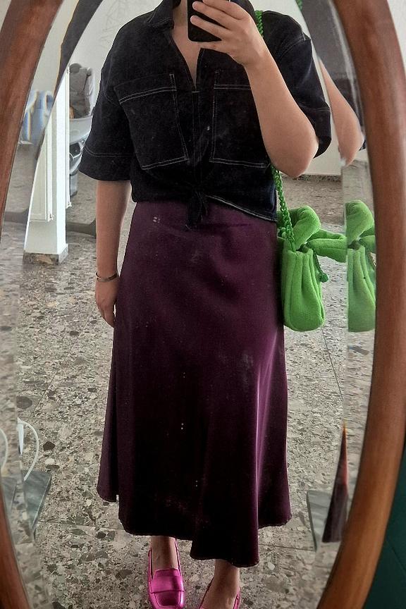 Ajoutez une touche de glamour avec un haut en satin ou un chemisier en soie, idéal pour les soirées estivales. • Jupe mi-longue satinée violette • Coupe fluide • Taille élastiquée • Tissu brillant • Fente latérale élégante