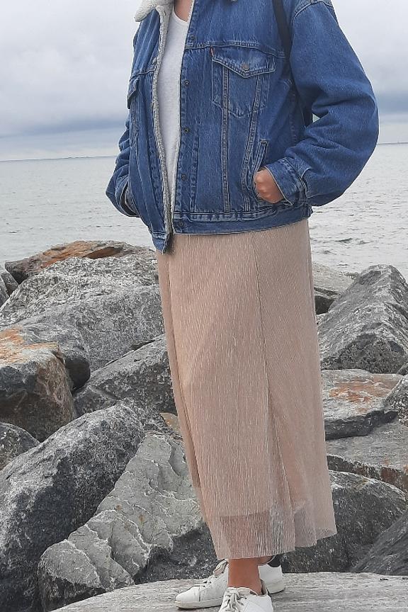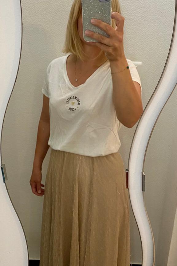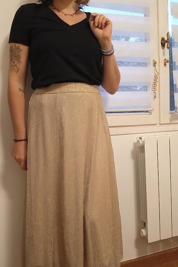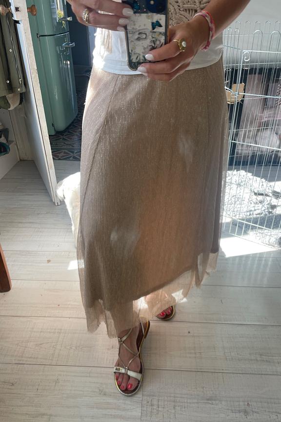 โข Jupe en tulle et doublure dorรฉ โข Finition brillante โข Coupe fluide โข Longueur midi