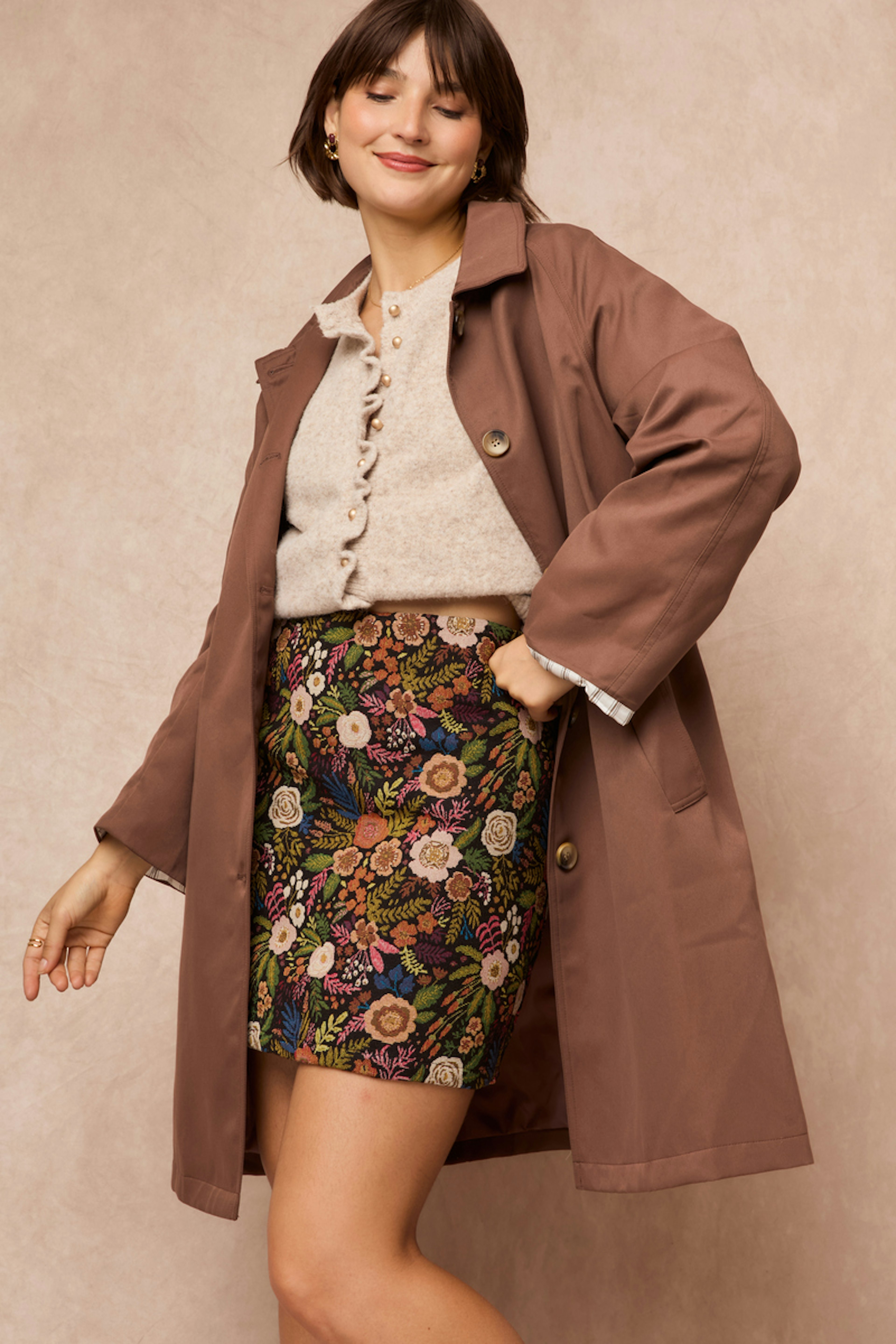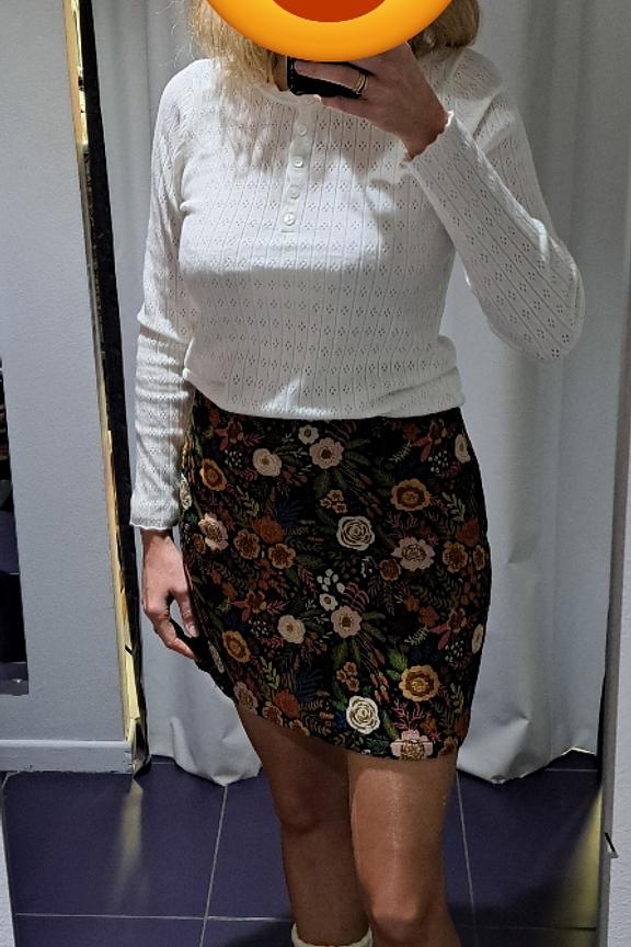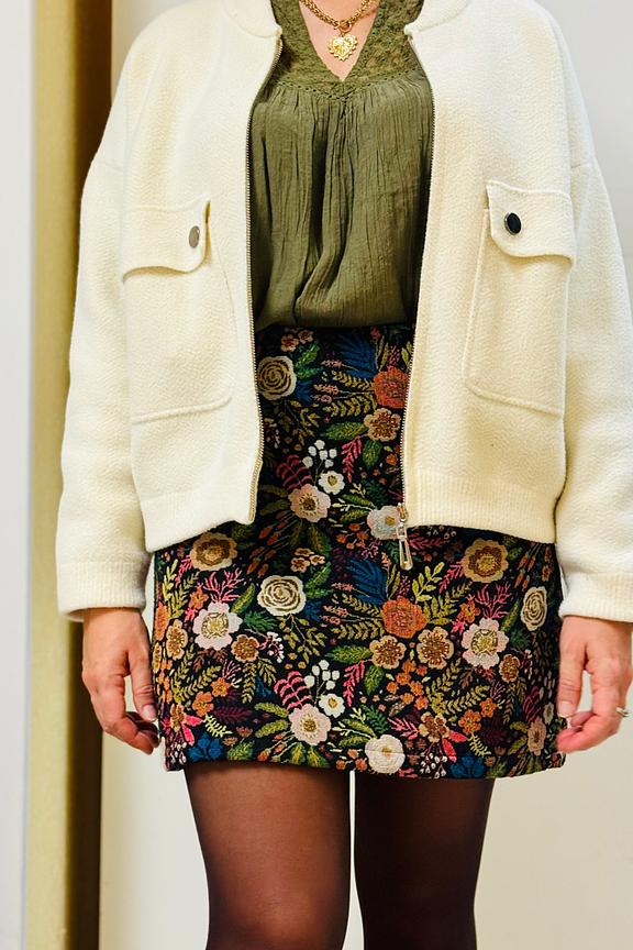 Associez cette jupe à un pull en maille crème et des bottines en daim pour un look hivernal chaleureux. • Jupe courte • Coupe ajustée • Imprimé floral • Taille haute • Texture jacquard élégante