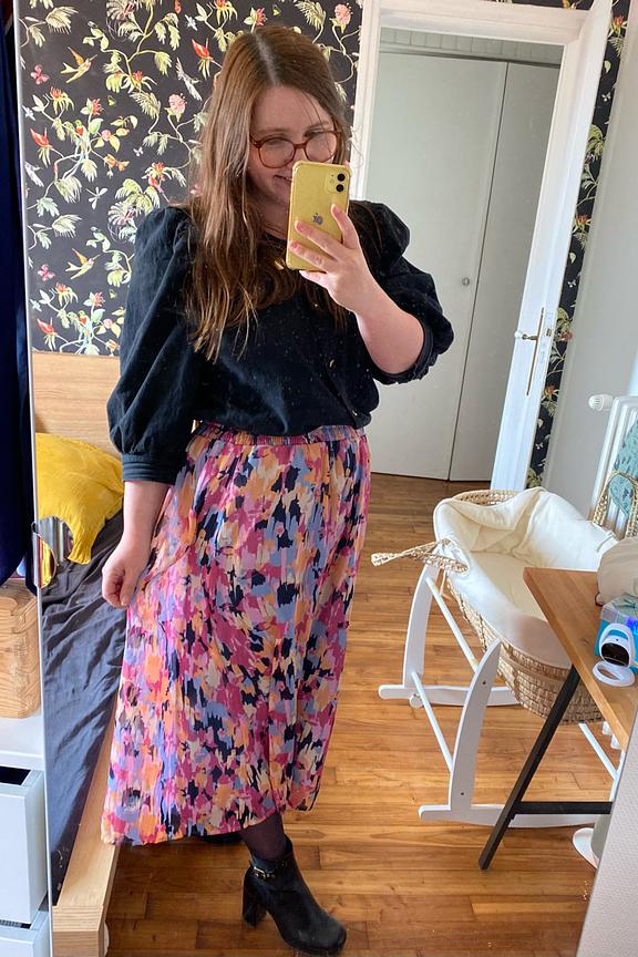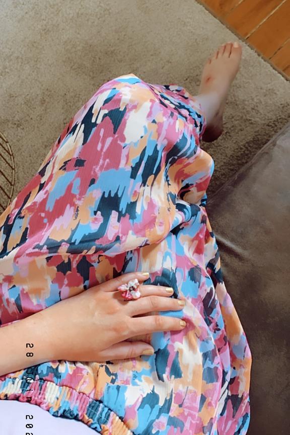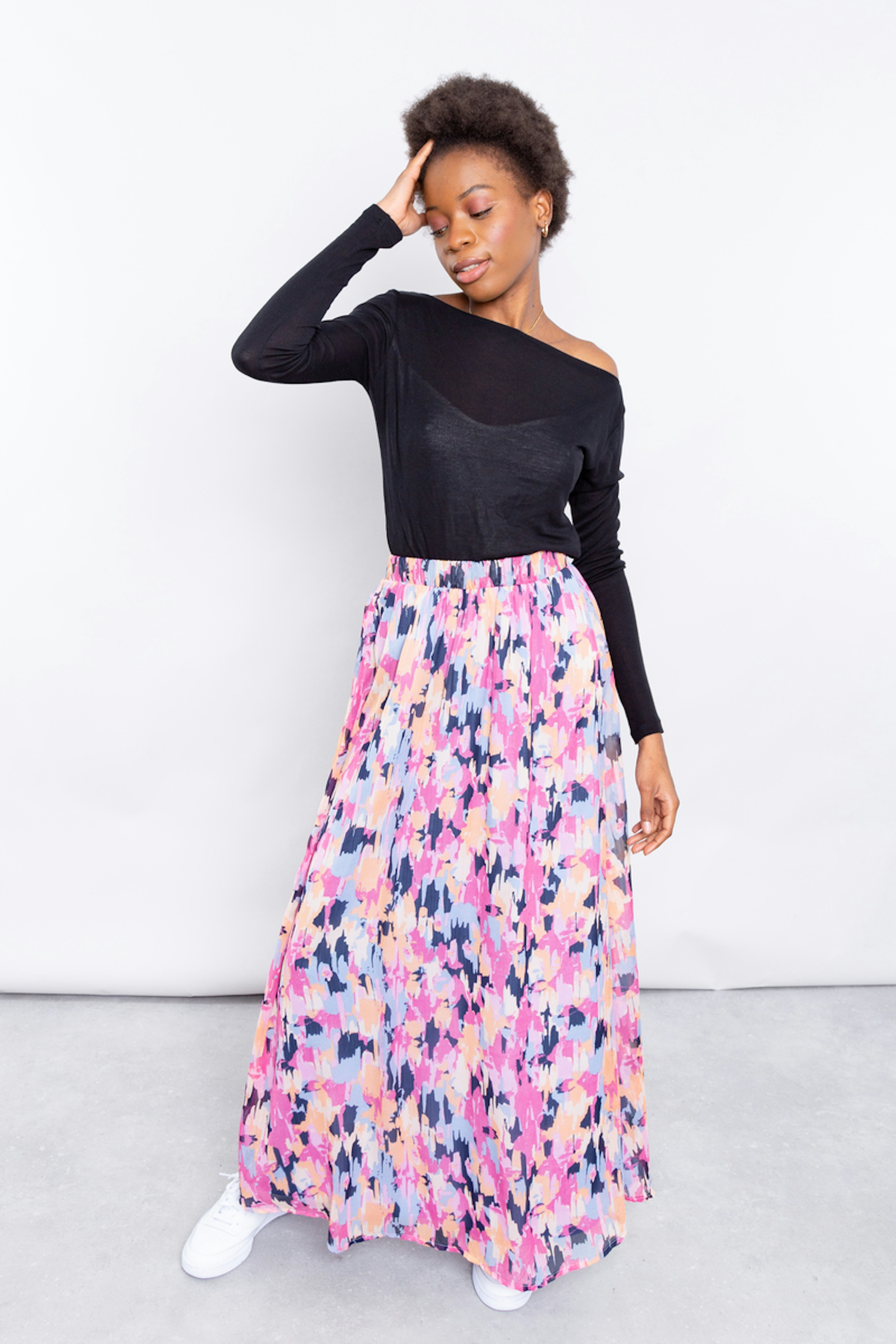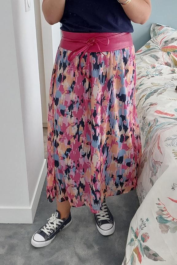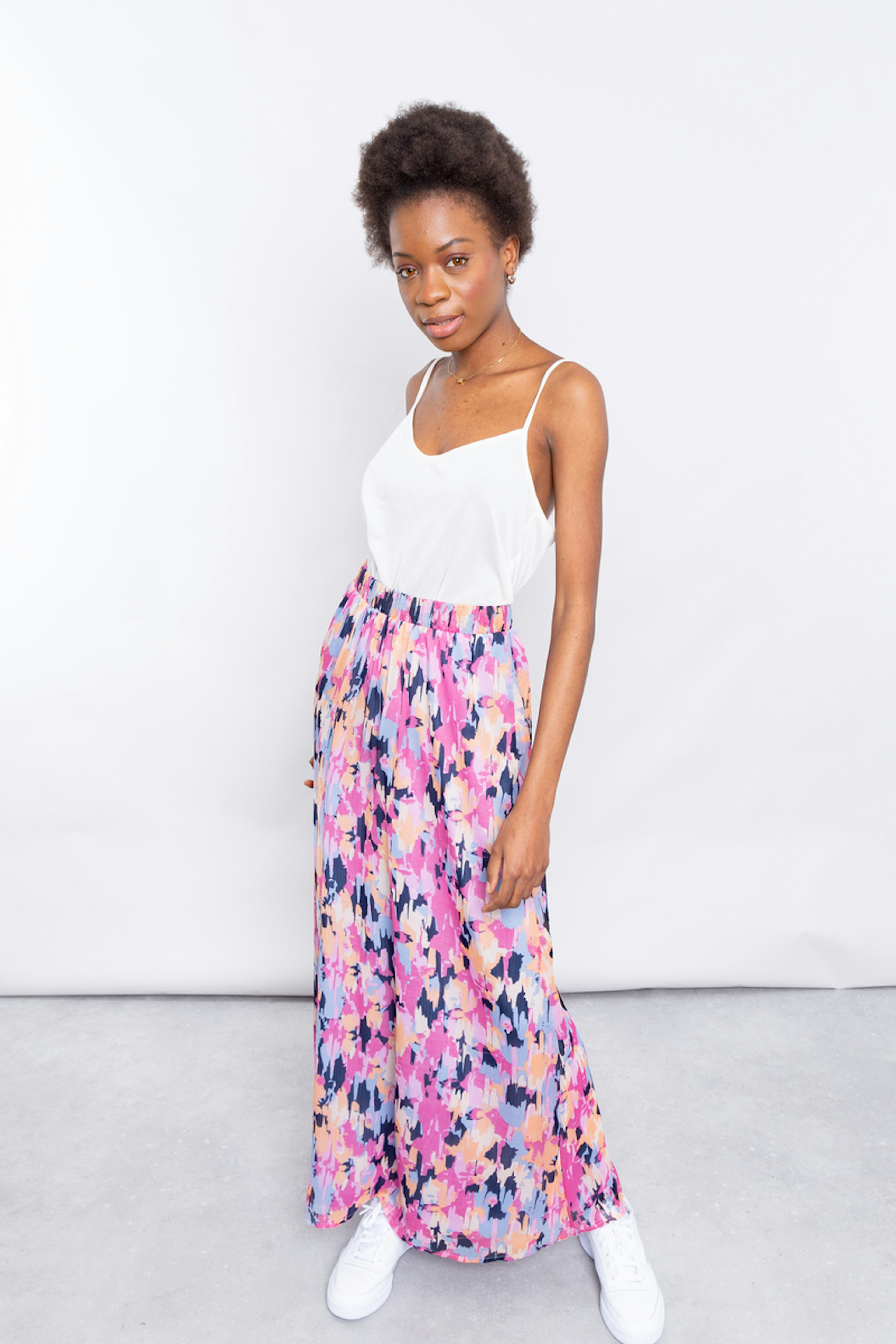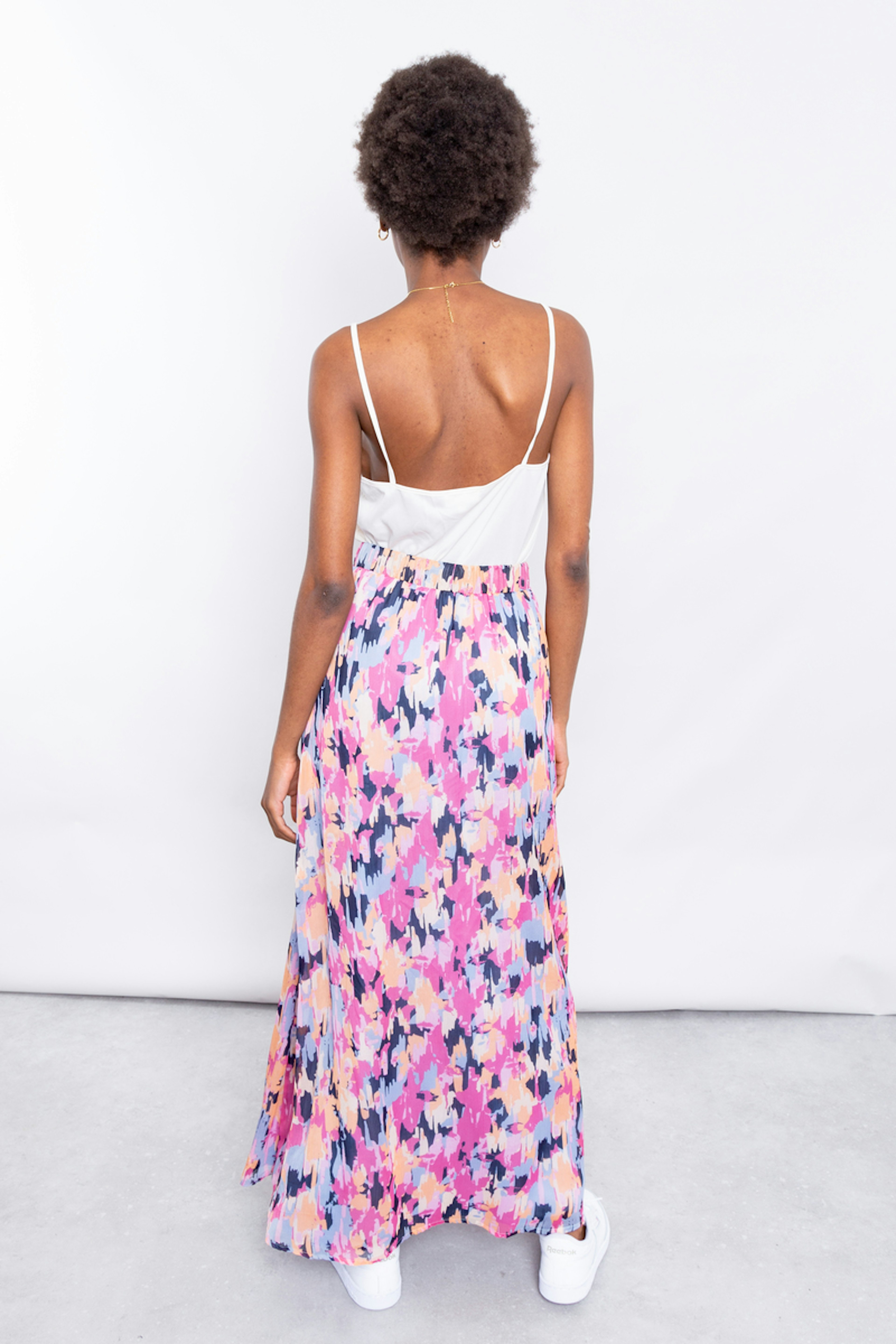 โข Jupe midi rose โข Imprimรฉ arty colorรฉ โข Tissu fluide โข Taille รฉlastiquรฉe โข Doublure