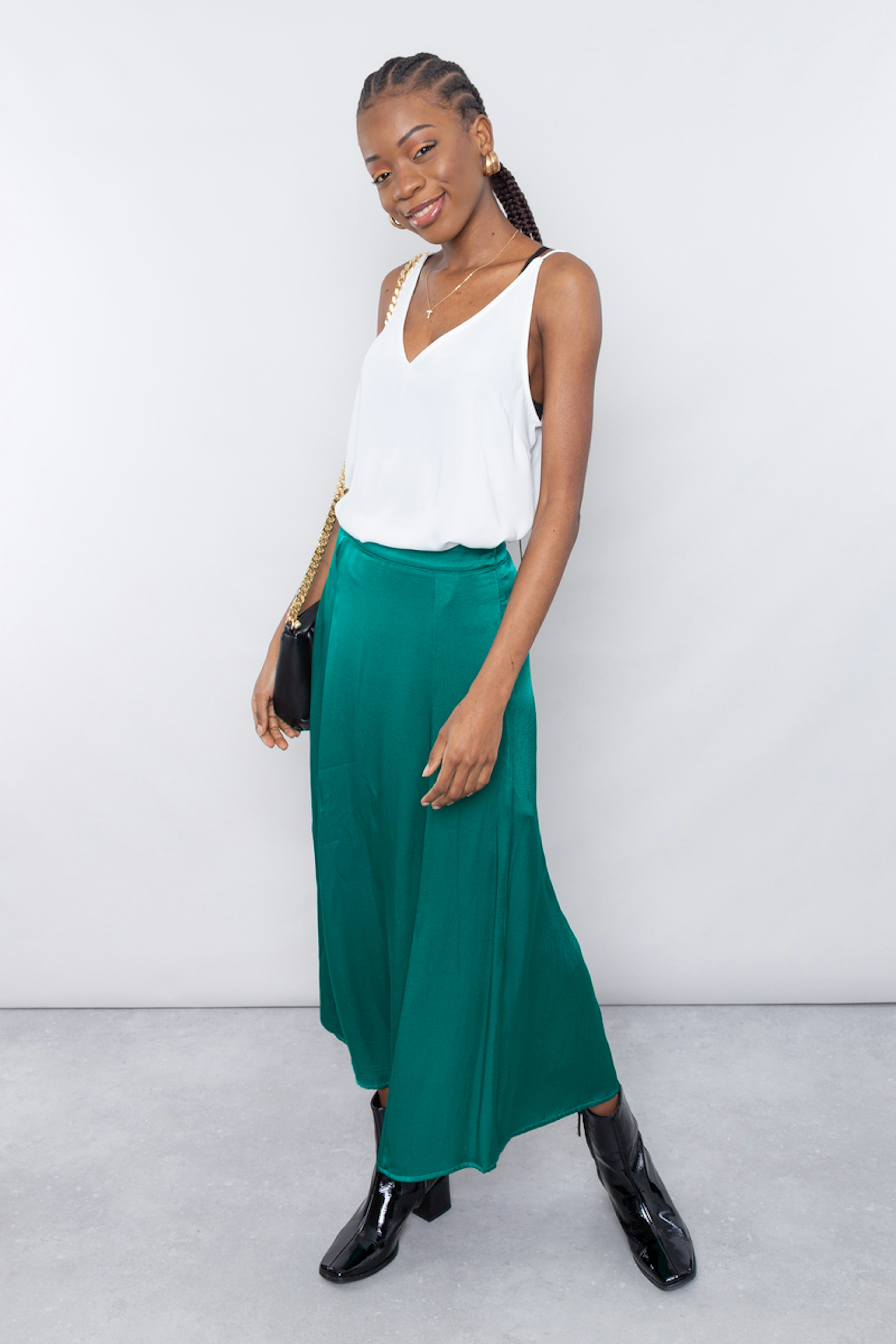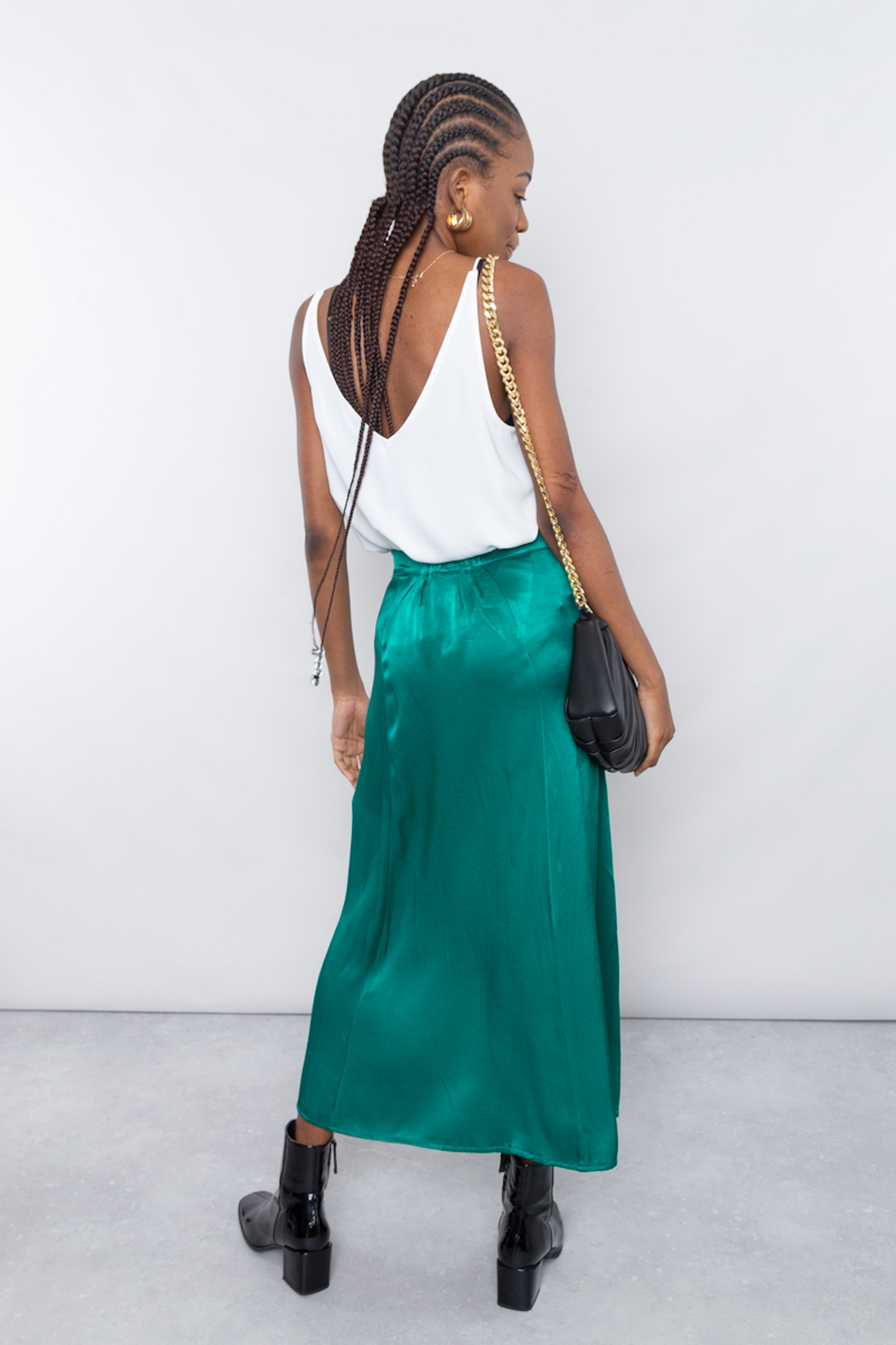 โข Jupe longue effet satinรฉ โข Coloris vert sapin โข Tissu en viscose certifiรฉe รฉcovero