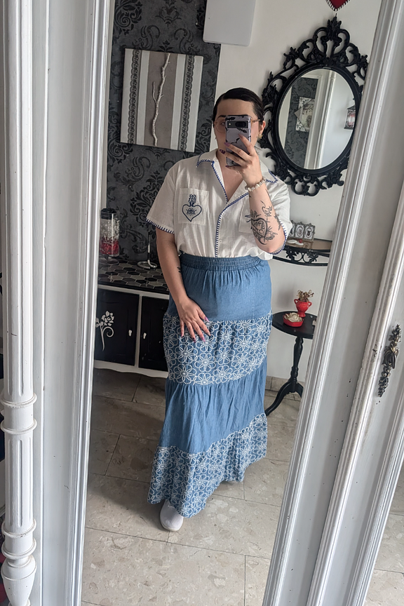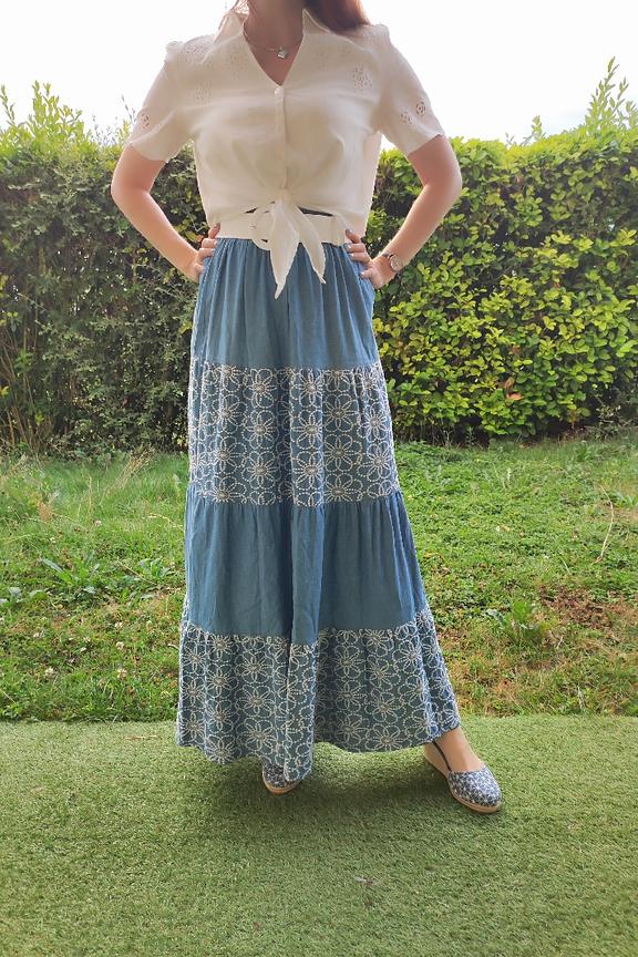 Associez cette jupe longue en coton avec un débardeur blanc ajusté pour une allure estivale chic, idéale pour les journées ensoleillées. • Jupe longue en coton • Coupe ample et fluide • Taille élastiquée • Motif imprimé floral • Idéale pour l'été