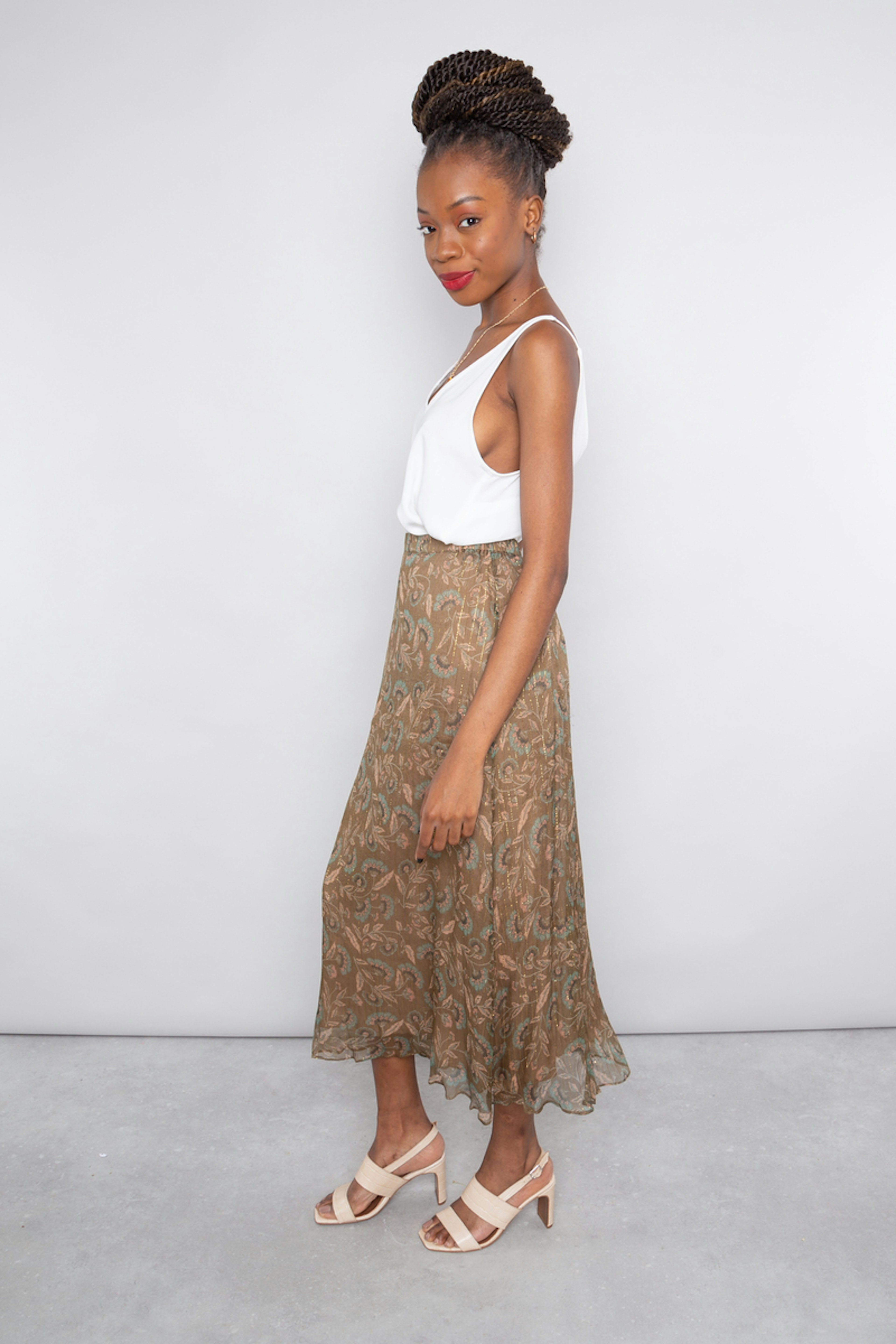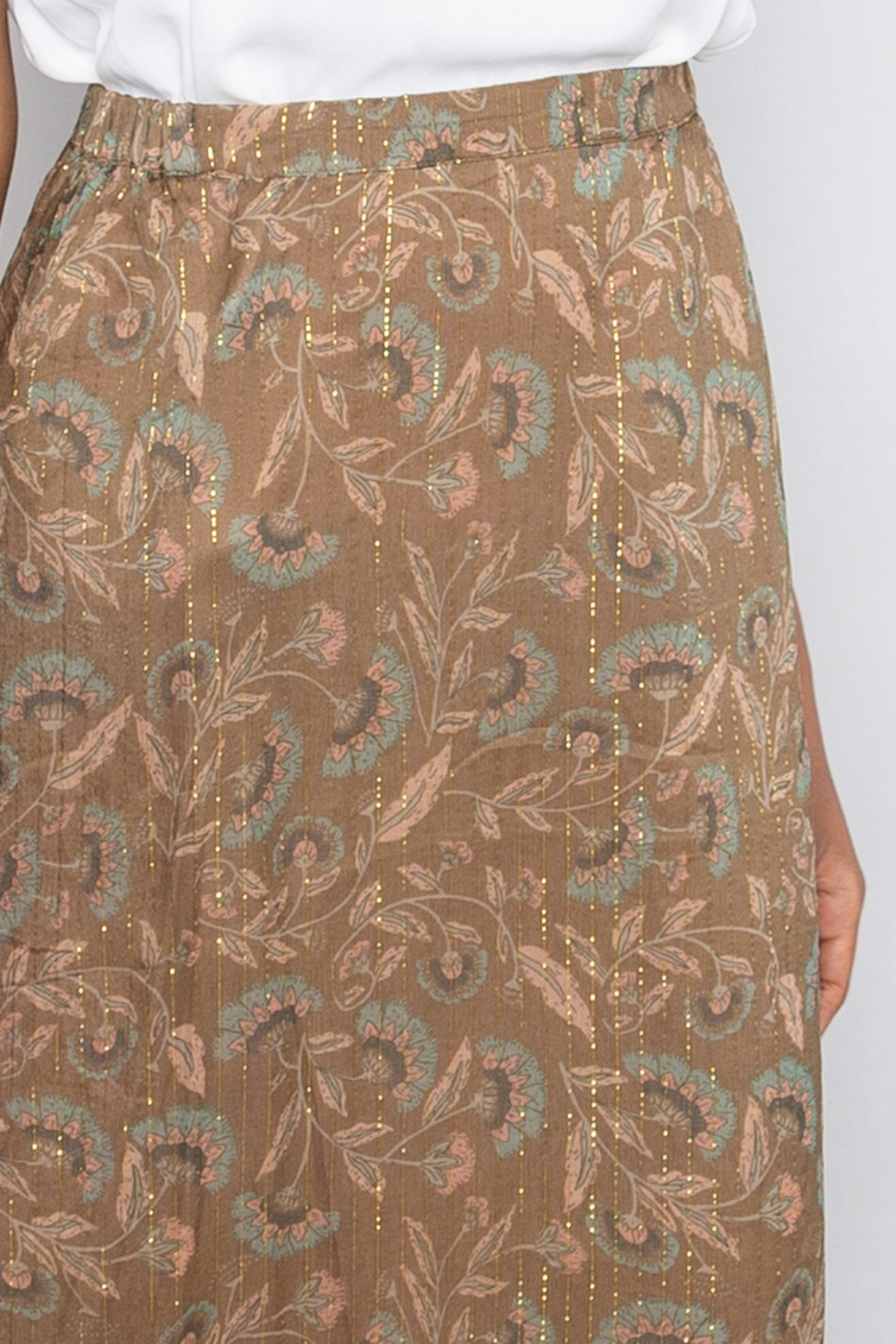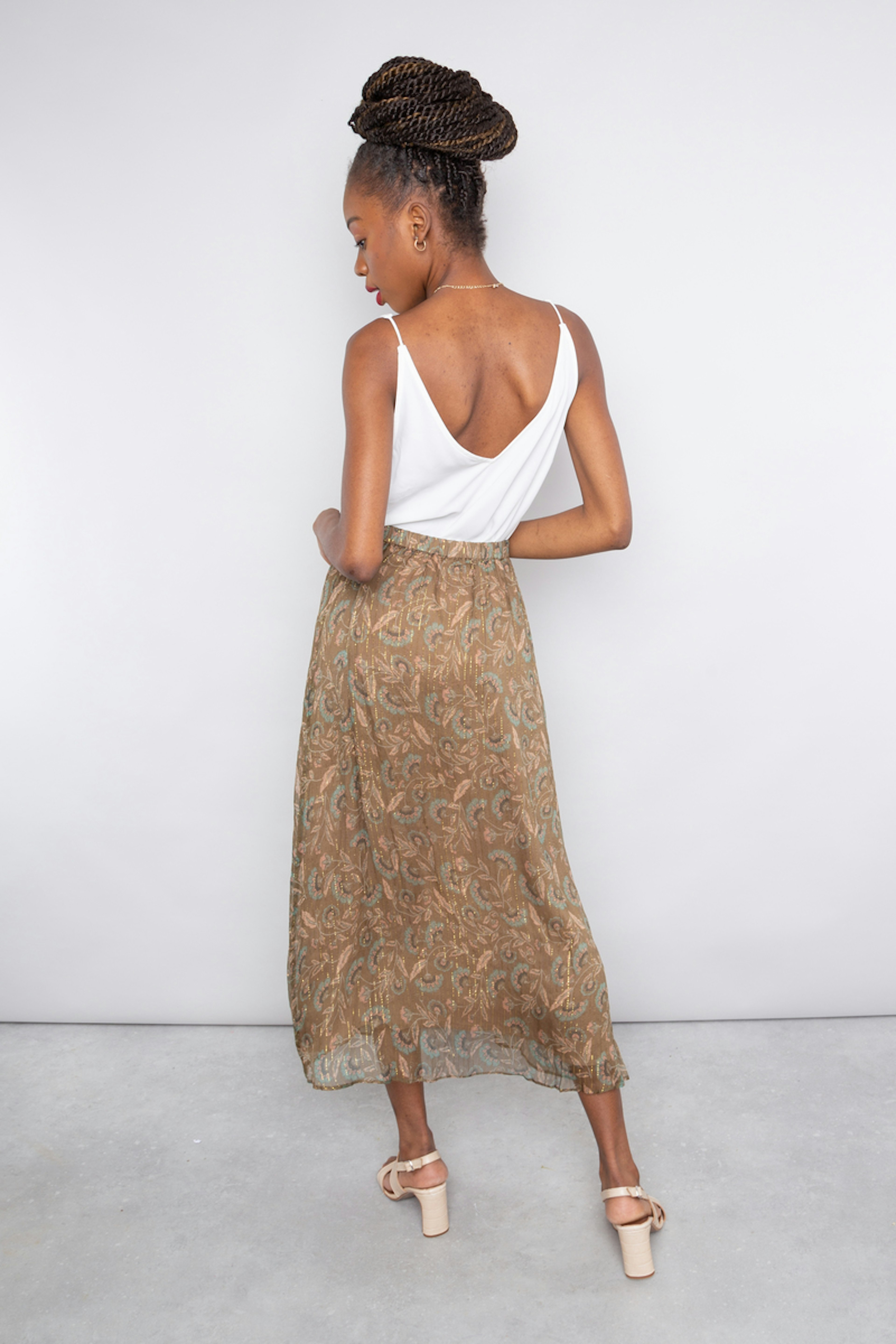 โ€ข Jupe longue bohรจme chic en voile de soie incrustรฉ de fils de lurex dorรฉs โ€ข Imprimรฉ floral โ€ข Taille รฉlastique โ€ข Le tissu de ce modรจle est fait avec de jolis fils lurex dorรฉs qui peuvent se fragiliser avec les frottements. Veuillez manipuler chaque piรจce avec prรฉcaution