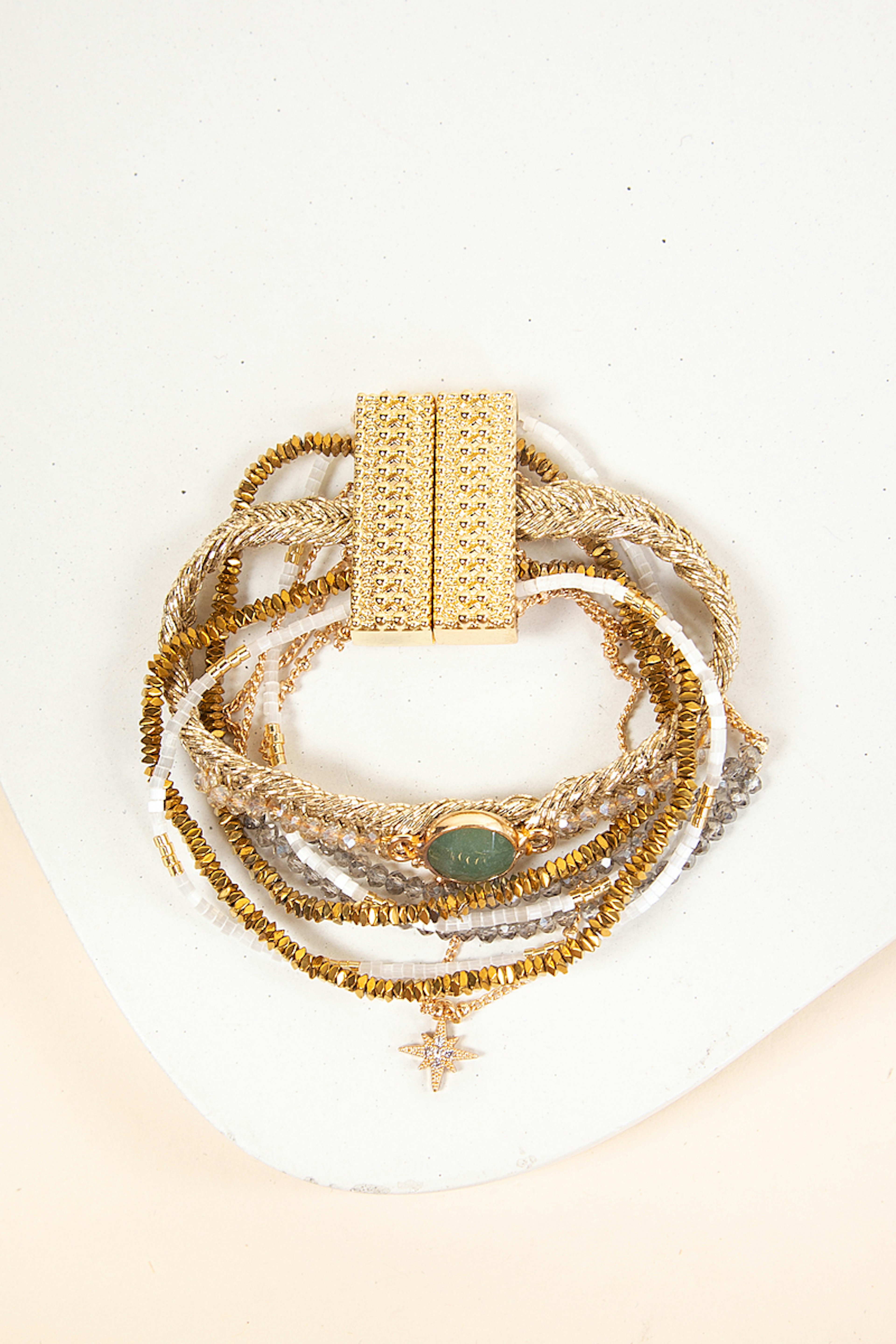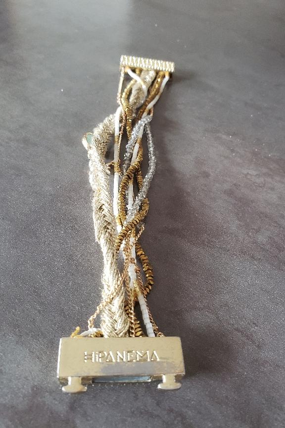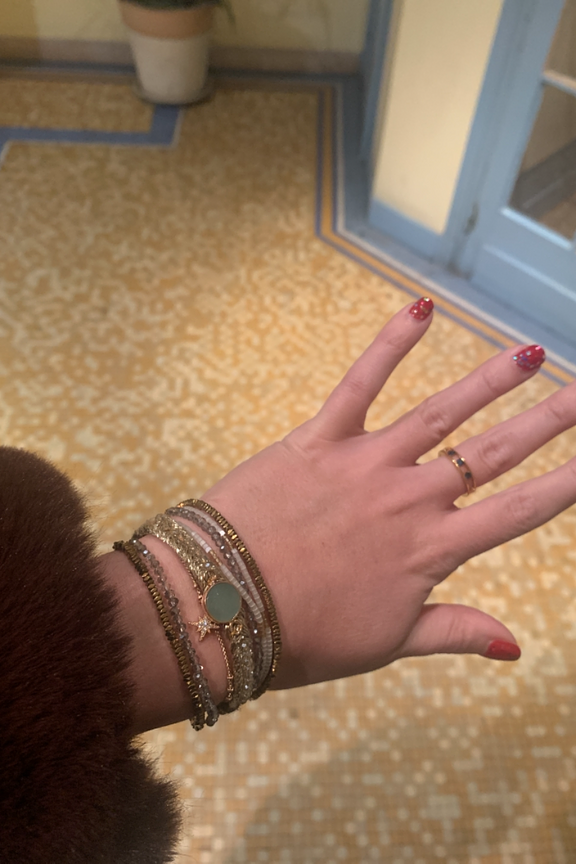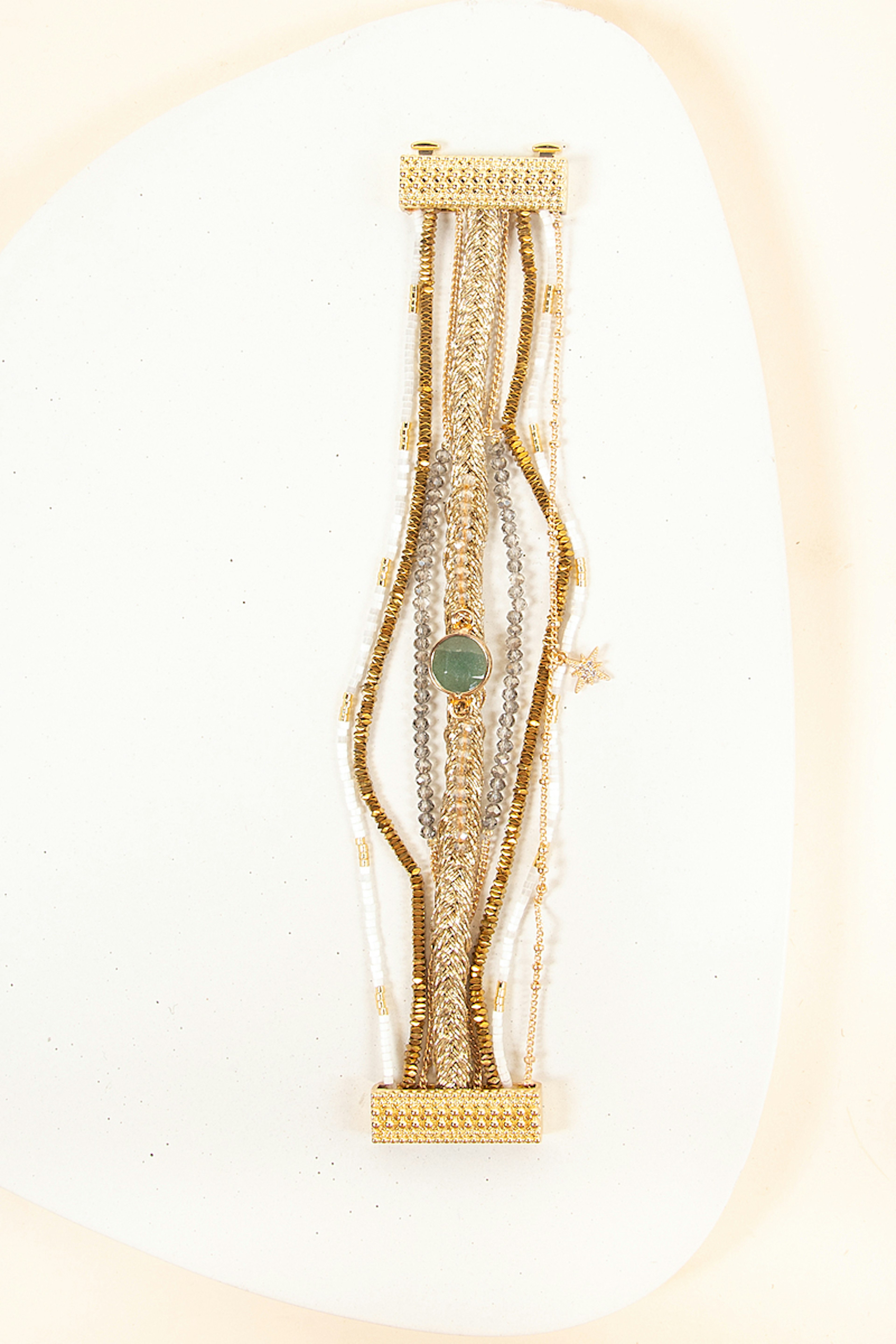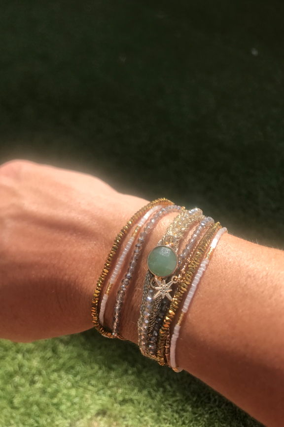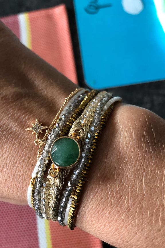 Manchette dorรฉe composรฉe de chaรฎnes fines, de petites pierres semi-prรฉcieuses dans les tons blancs et nude. Ce bracelet est ornรฉ d'une pierre centrale couleur jade, avec une breloque en forme d'รฉtoile pavรฉe de strass, le tout montรฉ sur un fermoir aimantรฉ dorรฉ. โ€ข Fermoir aimantรฉ dorรฉ 18x30 mm en alliage de mรฉtaux gravure Hipanema. โ€ข Chaines, pampilles, en laiton dorรฉ ร  lโ€™or fin 2 microns 14 carats. โ€ข Perles du Japon, pierres semies-prรฉcieuses, hรฉmatite, perles de verre, strass effet diamant. โ€ข Hauteur du bracelet: 2,5 cm โ€ข Taille du bracelet: 17,5cm โ€ข Entiรจrement fait ร  la main. Hipanema est connue pour ses bijoux au style brรฉsilien et aux couleurs flamboyantes. Elle est connue pour ses manchettes bohรจmes qui habillent votre poignรฉ et donnent du peps ร  vos tenues. On ne lรฉsine pas sur les accumulations et on ose porter des bagues, bracelets, colliers et boucles d'oreilles de la marque.
