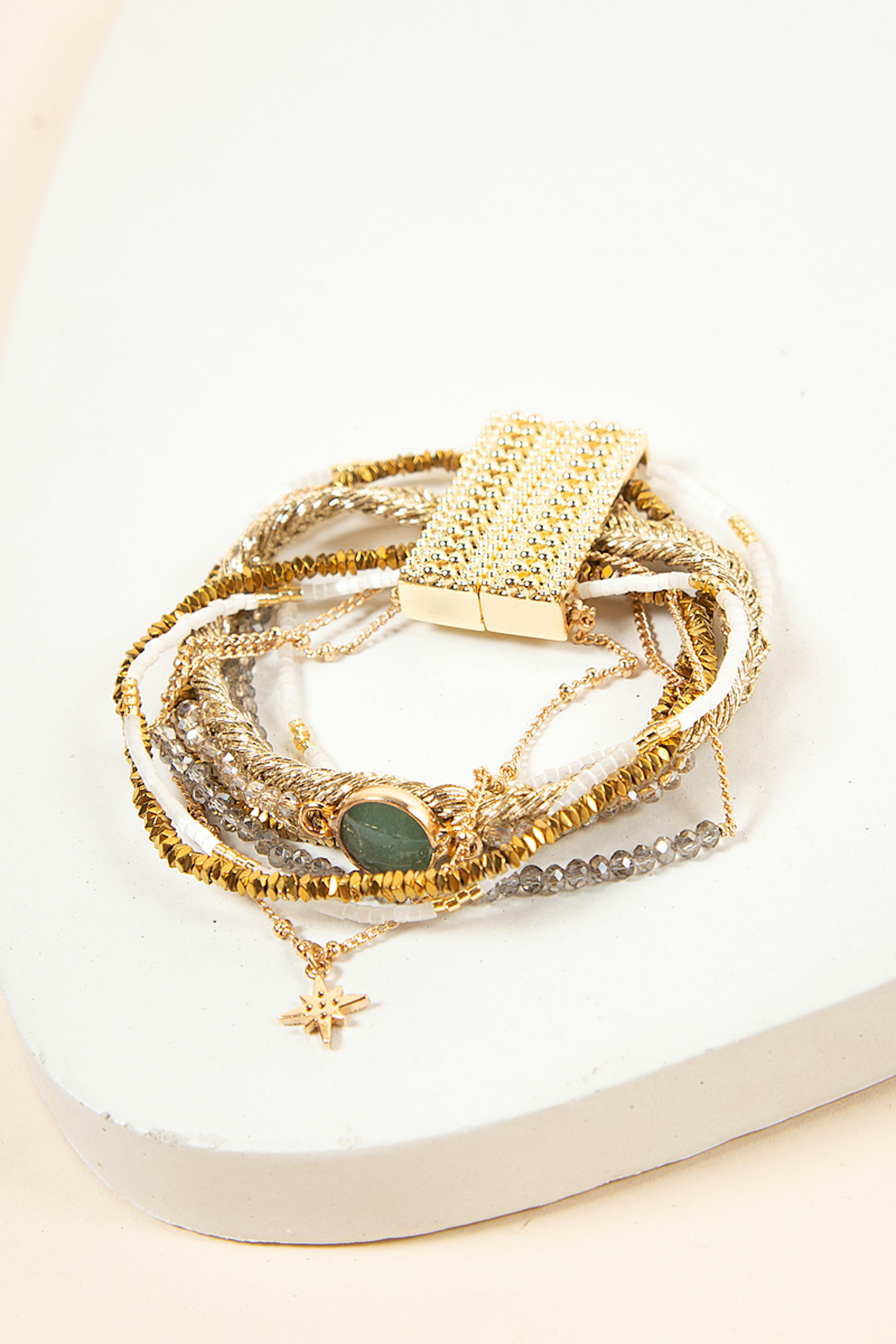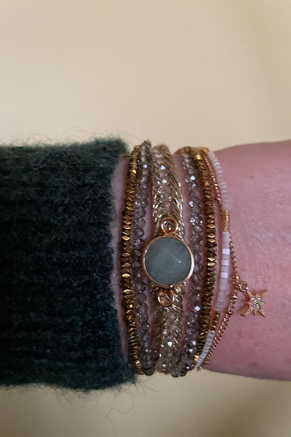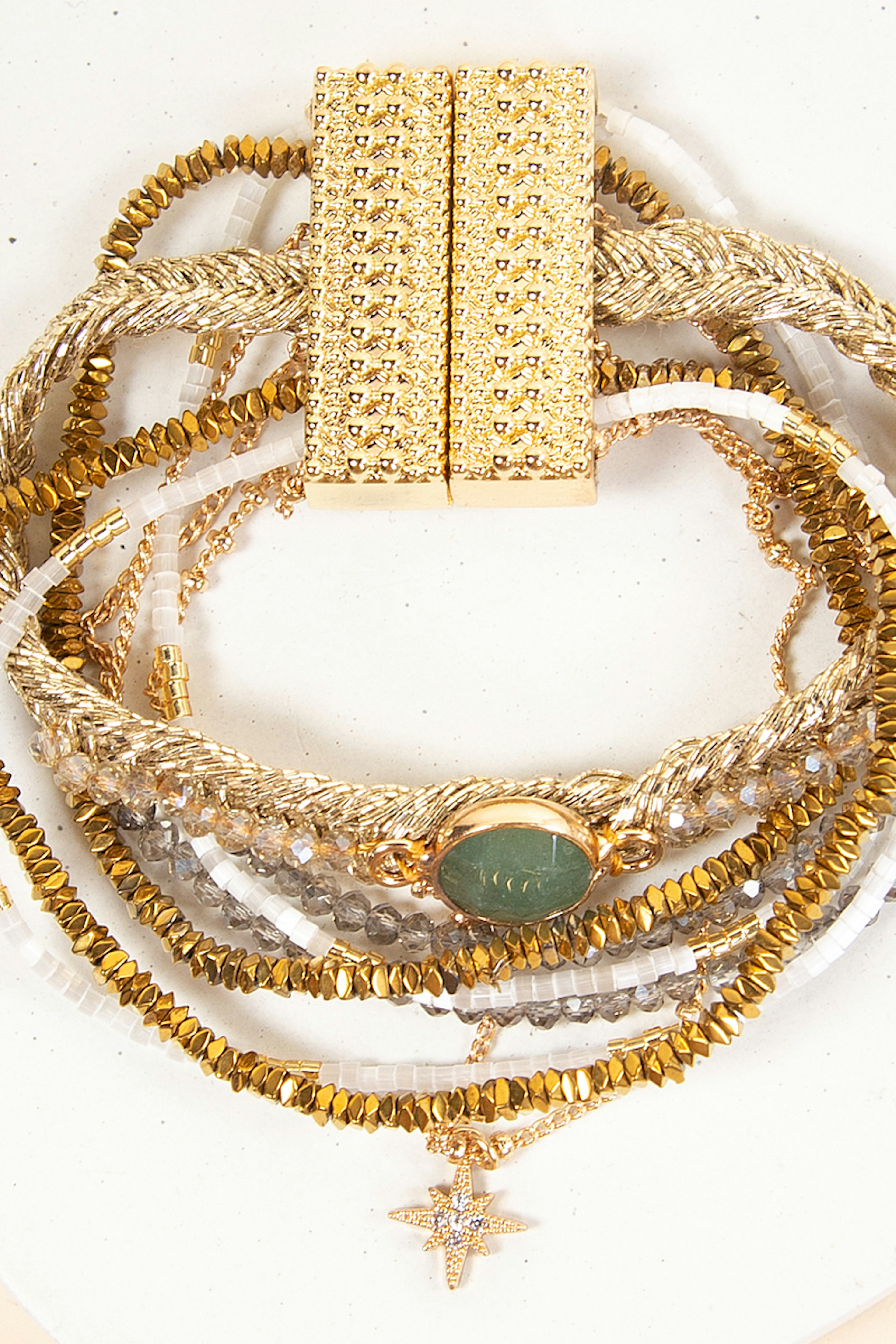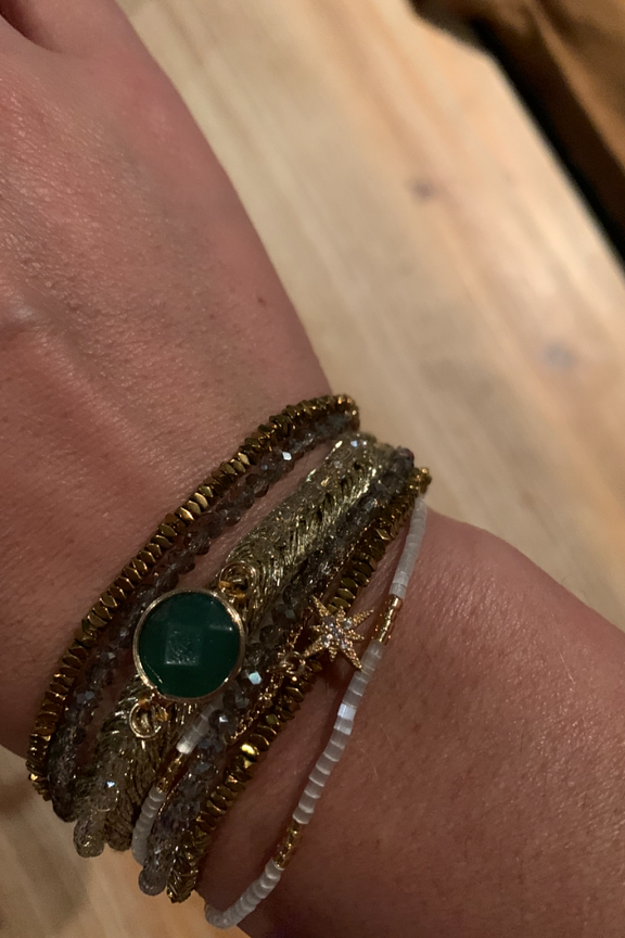 Manchette dorรฉe composรฉe de chaรฎnes fines, de petites pierres semi-prรฉcieuses dans les tons blancs et nude. Ce bracelet est ornรฉ d'une pierre centrale couleur jade, avec une breloque en forme d'รฉtoile pavรฉe de strass, le tout montรฉ sur un fermoir aimantรฉ dorรฉ. โ€ข Fermoir aimantรฉ dorรฉ 18x30 mm en alliage de mรฉtaux gravure Hipanema. โ€ข Chaines, pampilles, en laiton dorรฉ ร  lโ€™or fin 2 microns 14 carats. โ€ข Perles du Japon, pierres semies-prรฉcieuses, hรฉmatite, perles de verre, strass effet diamant. โ€ข Hauteur du bracelet: 2,5 cm โ€ข Taille du bracelet: 17,5cm โ€ข Entiรจrement fait ร  la main. Hipanema est connue pour ses bijoux au style brรฉsilien et aux couleurs flamboyantes. Elle est connue pour ses manchettes bohรจmes qui habillent votre poignรฉ et donnent du peps ร  vos tenues. On ne lรฉsine pas sur les accumulations et on ose porter des bagues, bracelets, colliers et boucles d'oreilles de la marque.