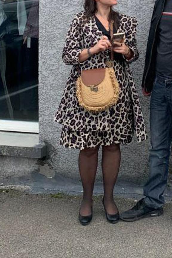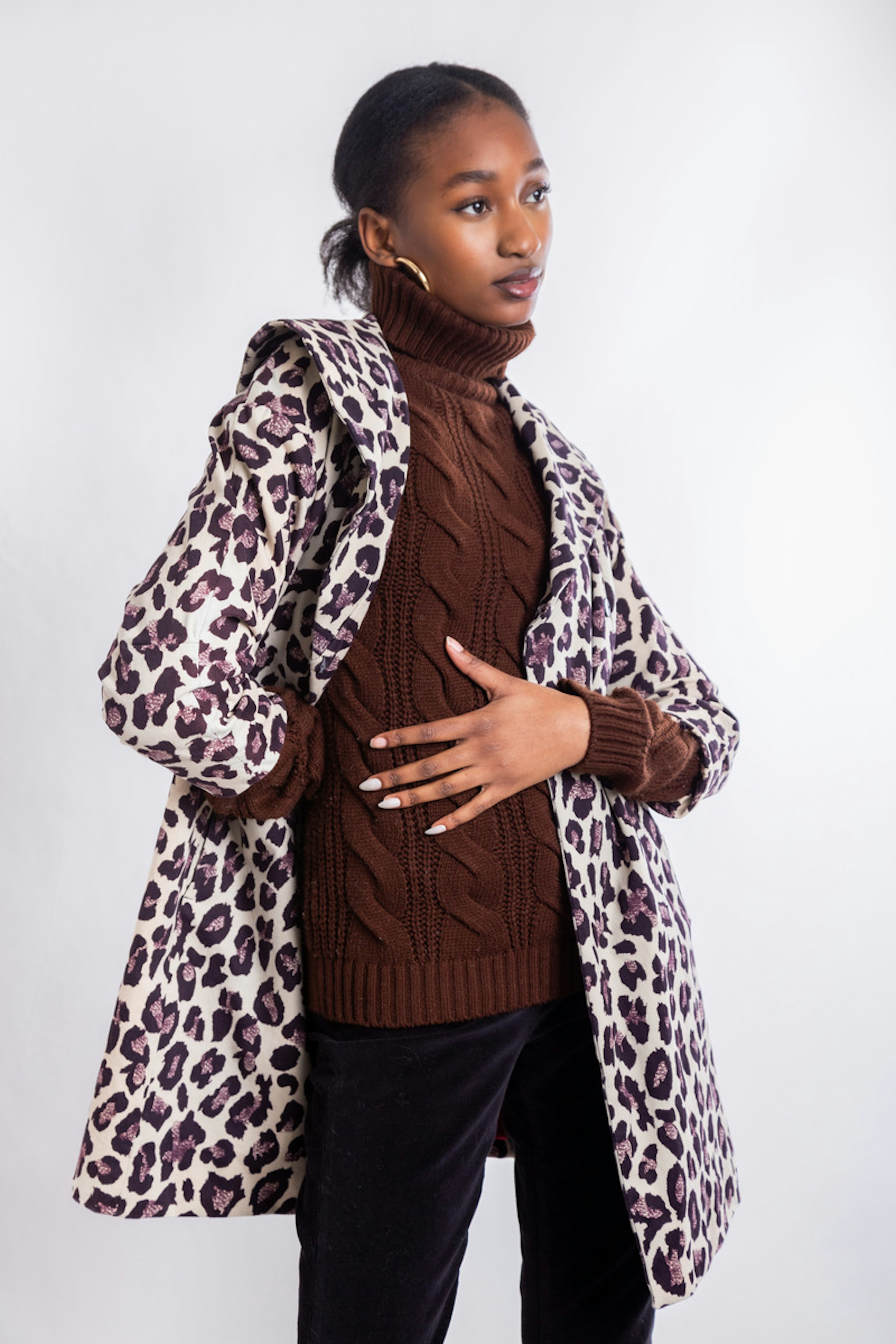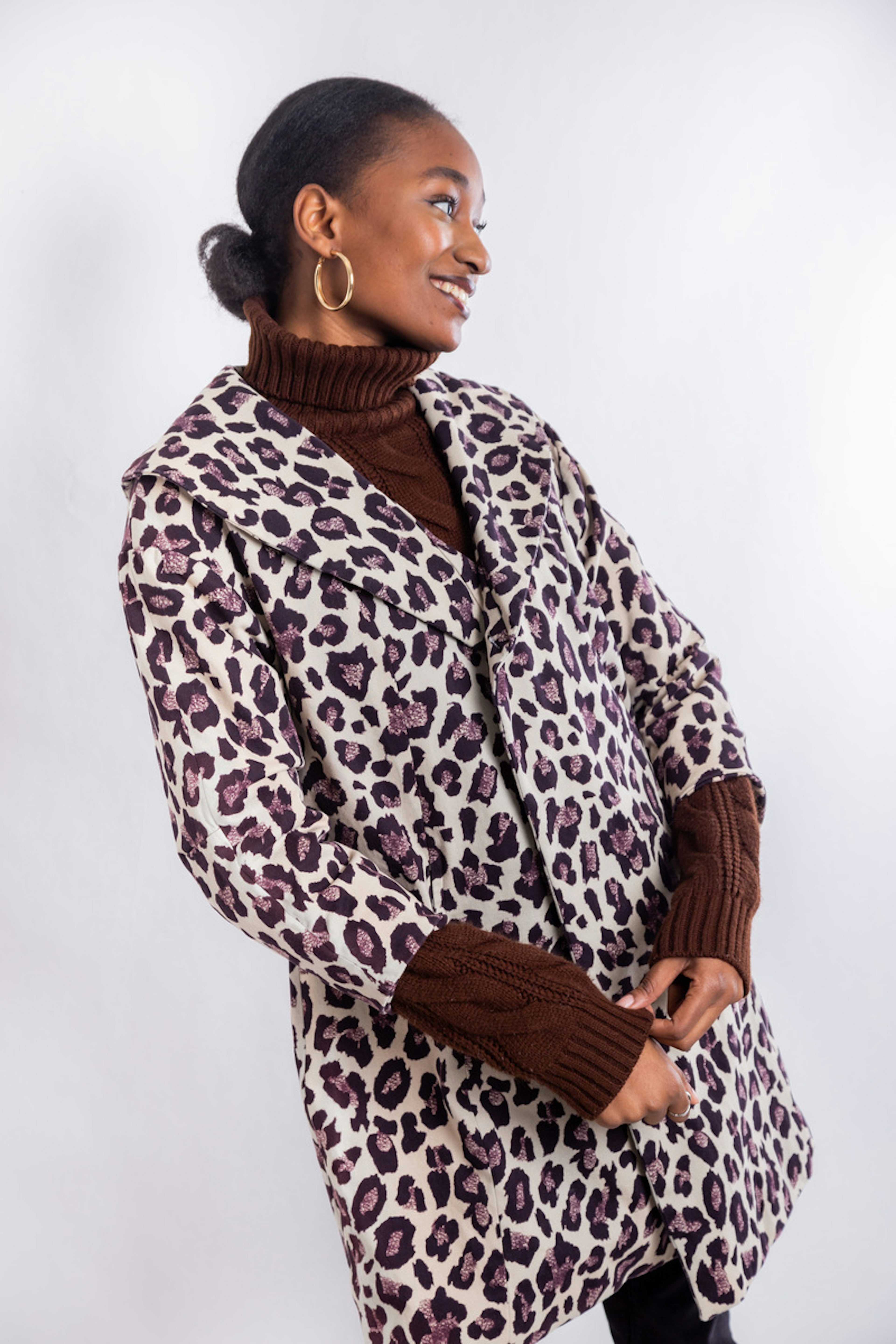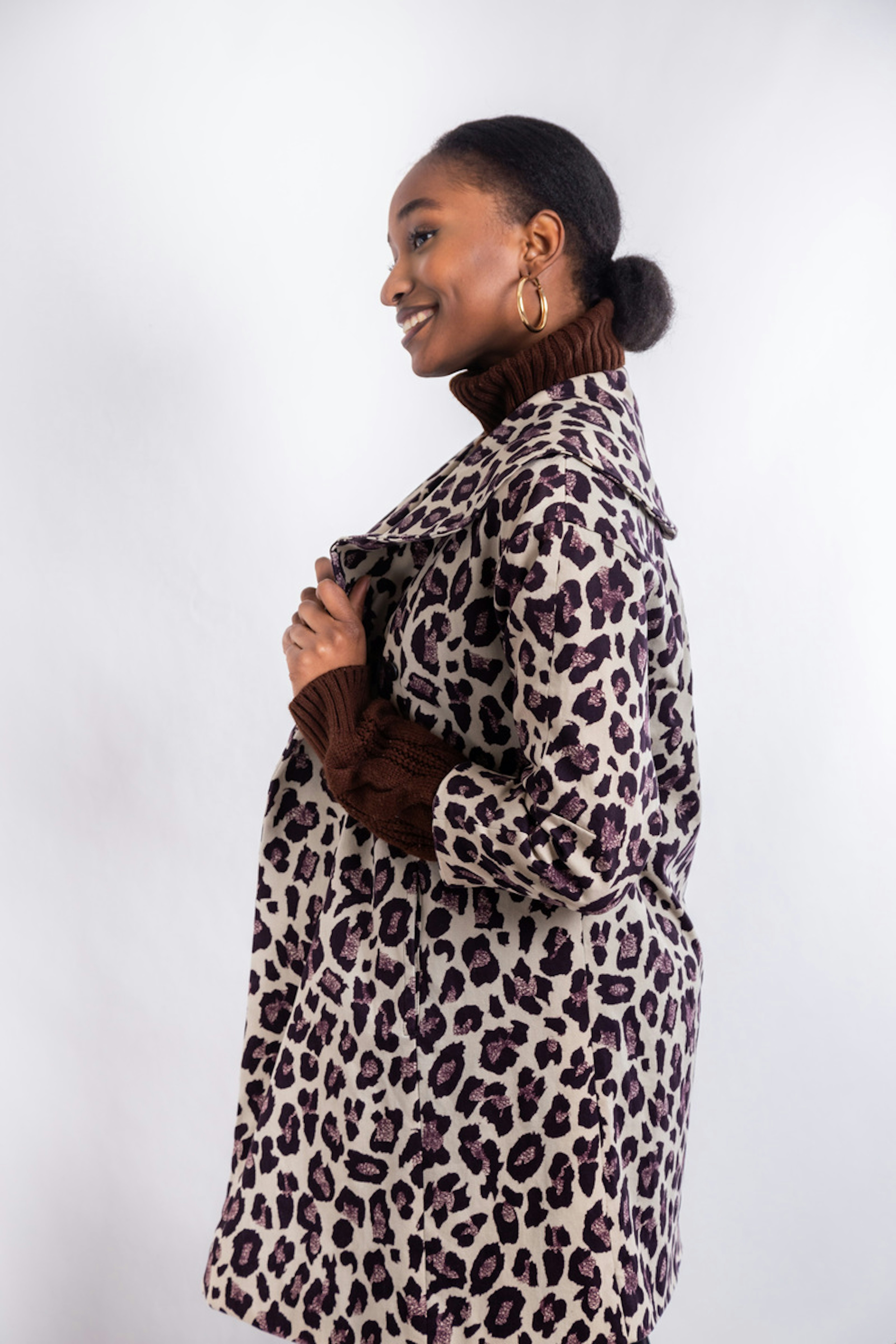 โข Manteau avec col "chรขle" โข Manches au dessus du poignet, style vintage, imprimรฉ lรฉopard โข Croisรฉ et fermรฉ par 2 boutons, longueur genou. โข Entiรจrement doublรฉ d'un tissu rayรฉ