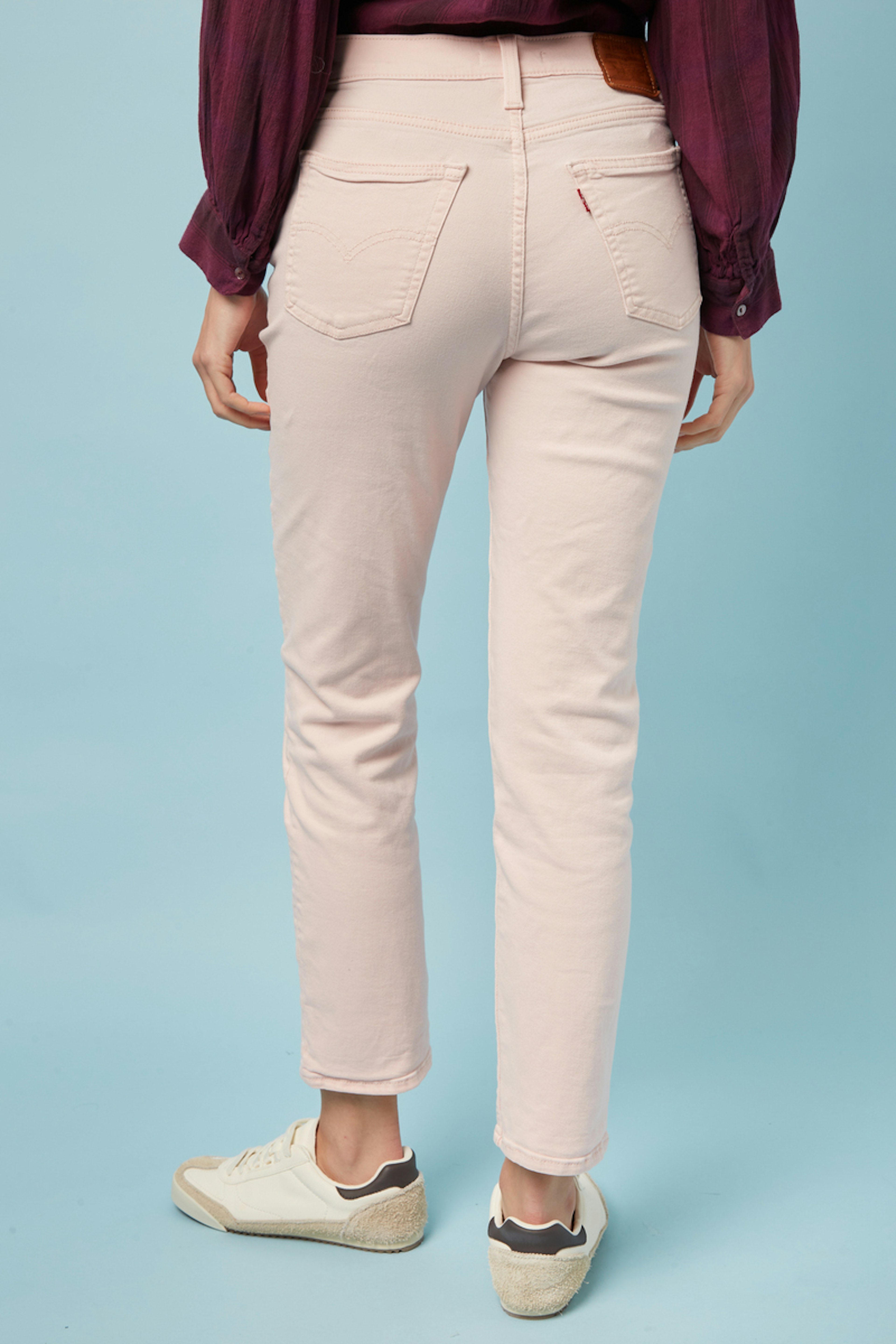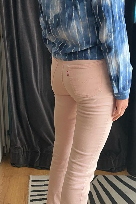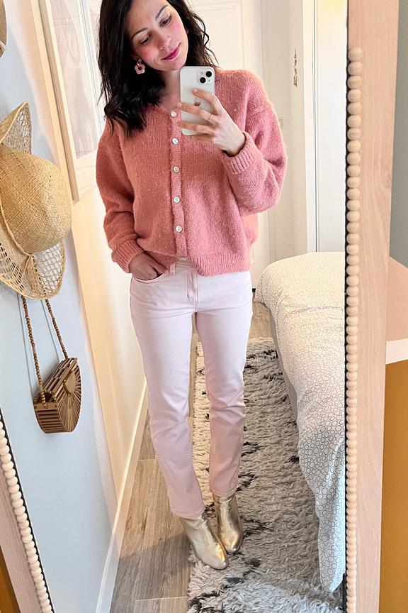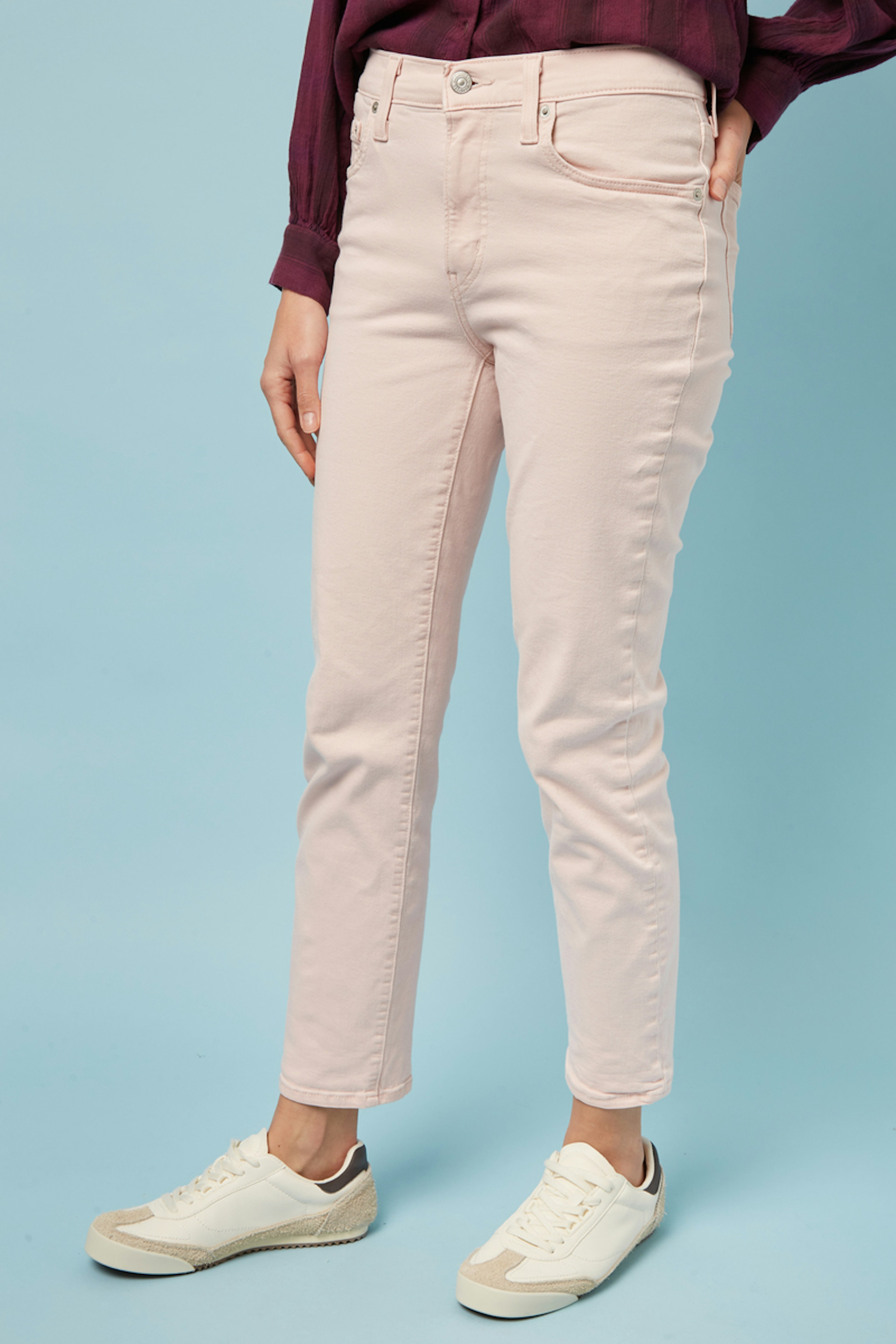 โข Jean femme โข Jambes droites โข Coupe slim des hanches aux cuisses โข Taille haute โข Fermeture zippรฉe โข Modรจle ร 5 poches โข Attention : couleur rose