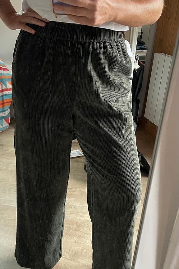 “Pantalon de qualité niveau matière velours, longueur parfaite mais l’effet escompté n’est pas super au niveau de la taille, taille haute élastique qui peut mettre en avant le ventre.”