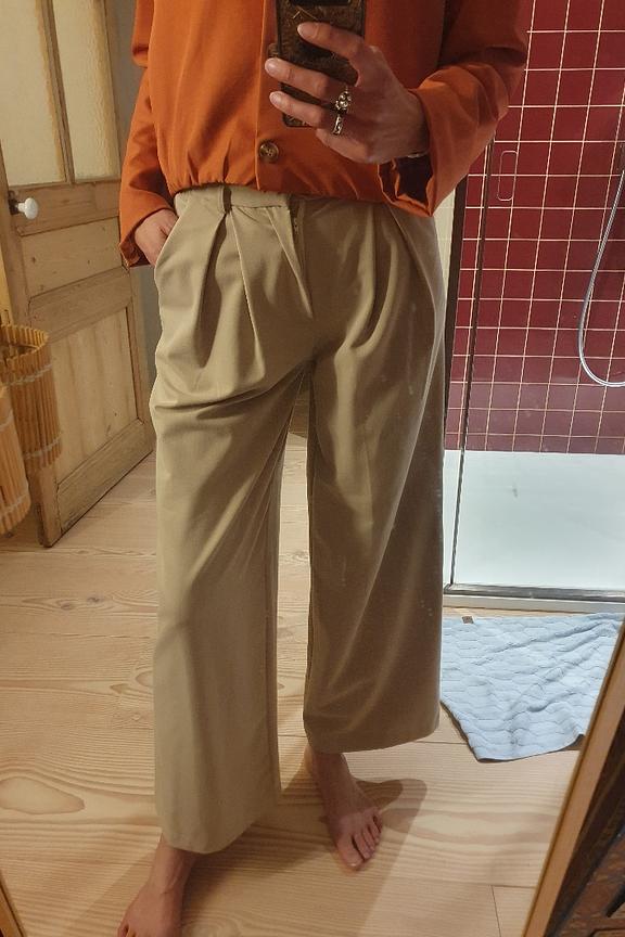 Associez ce pantalon large à un pull en cachemire et des baskets pour un look cosy et chic en hiver. • Pantalon large beige • Coupe ample et fluide • Taille haute flatteuse • Plis élégants à l'avant • Fermeture discrète à zip avant