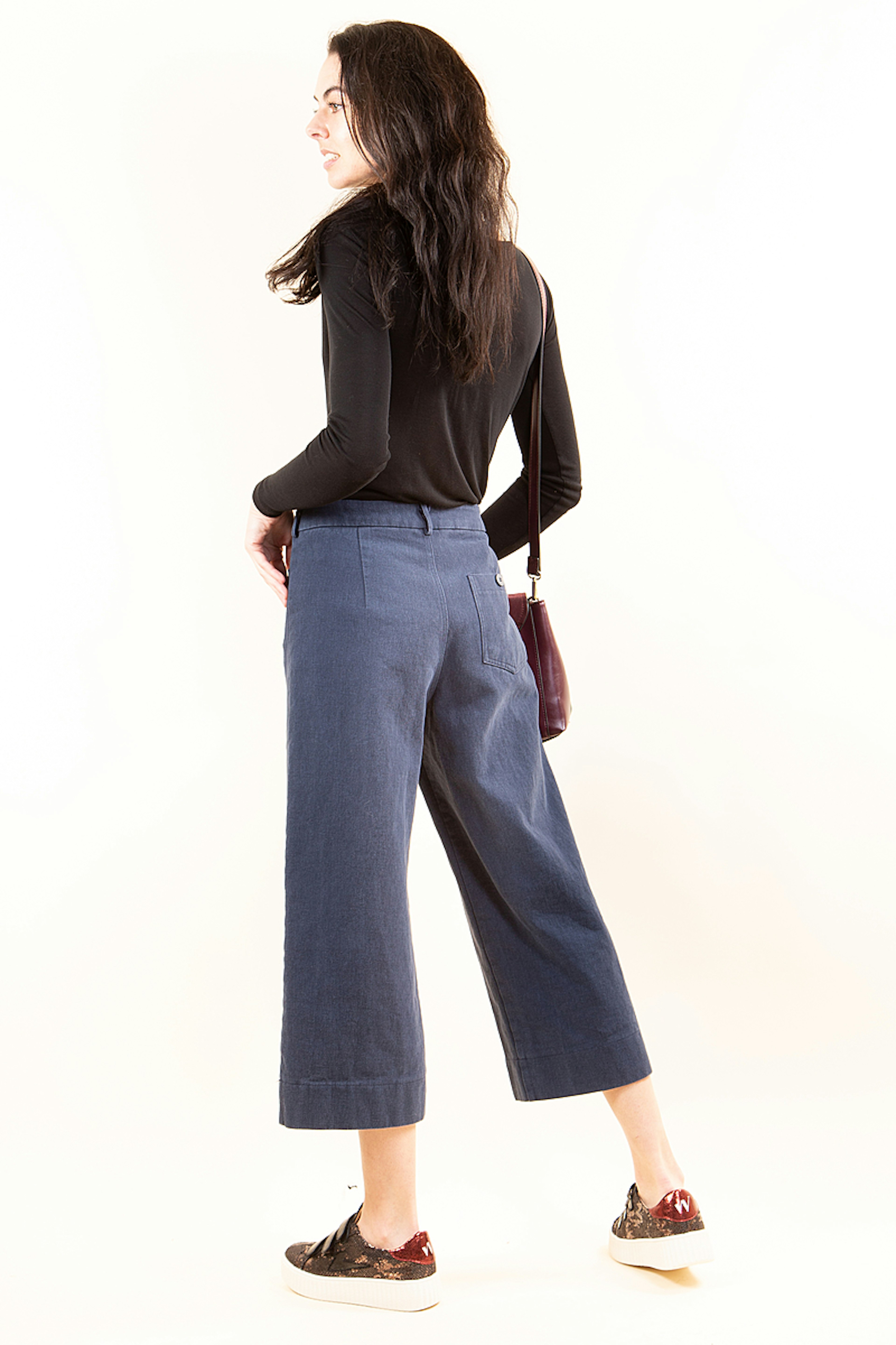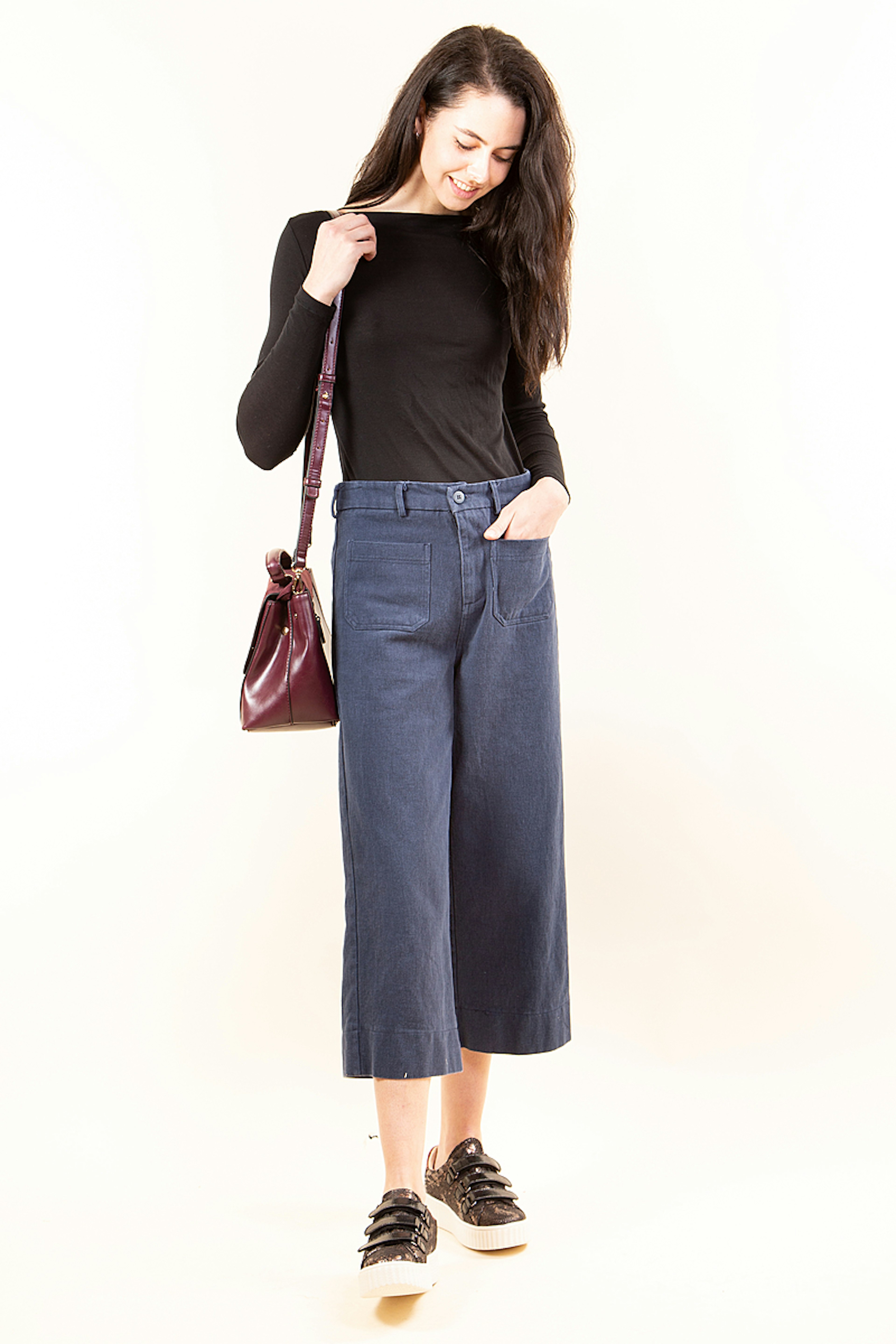 On aime Basile ce petit pantalon dรฉcontractรฉ en coton. Sa forme jupe culotte apporte de la nouveautรฉ dans votre garde-robe. Comme Elena, portez-le avec un tshirt en maille et des Converse blanches.