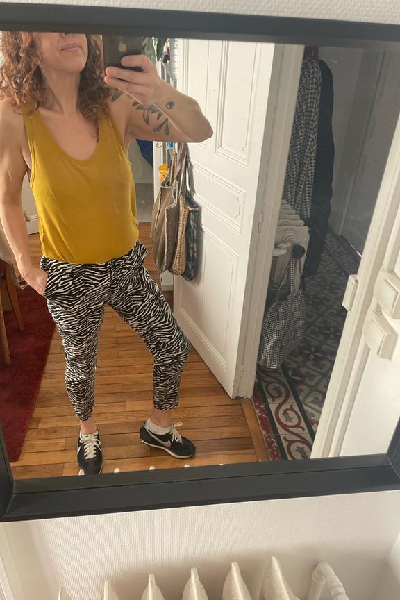 โAssez fin pour le printemps qui arrive , la coupe 7/8 fait un peu court sur moi mais jโai lโhabitude ๐คฃ Je vais le garder malgrรฉ la couleur qui est un peu passรฉe , l imprimรฉ fera son petit effet !โ