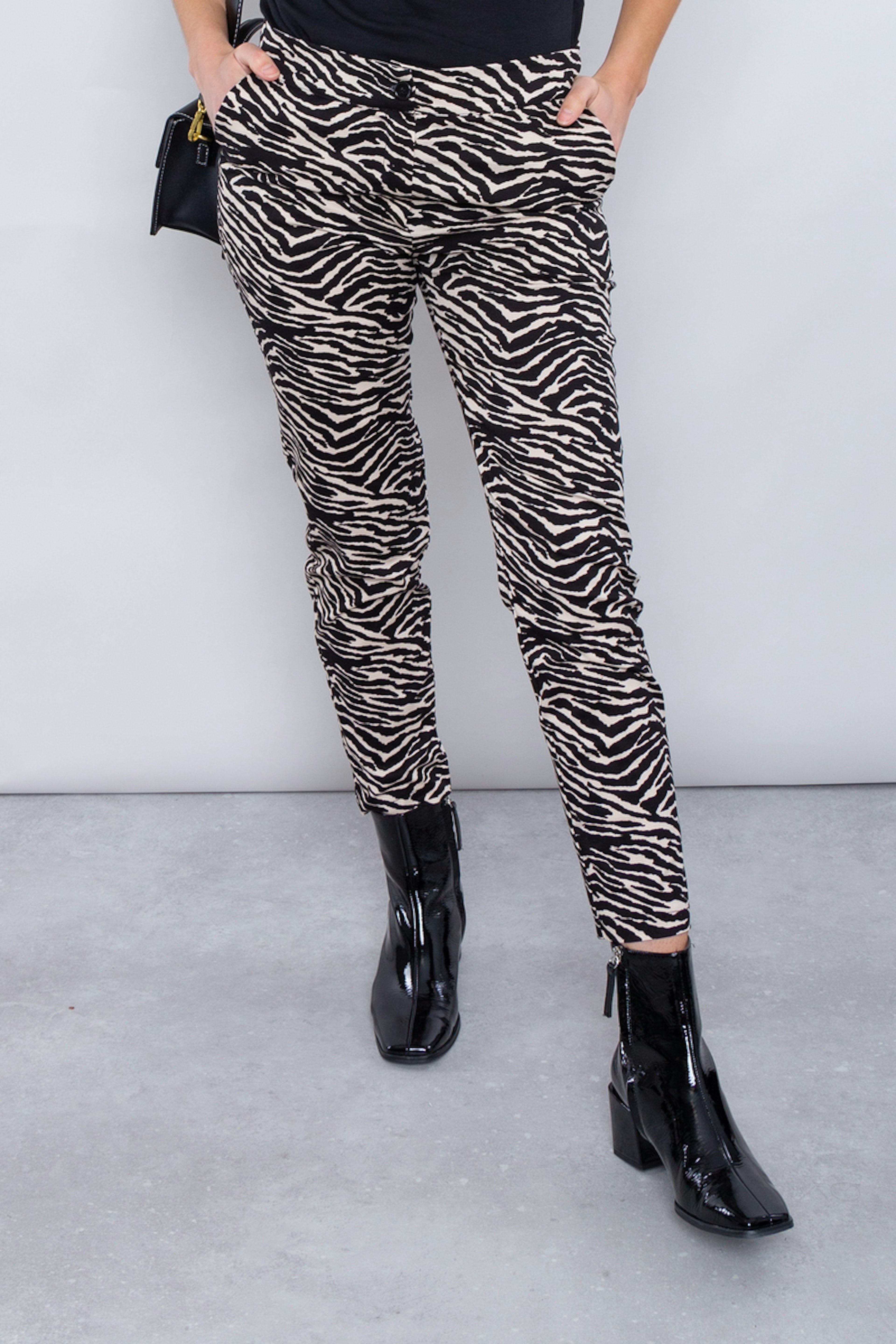 โข Pantalon cigarette en coton โข Imprimรฉ motif zรจbre โข Longueur 7/8e โข Ceinture montรฉe โข Braguette zip โข Poches italiennes (en biais sur les cรดtรฉs)