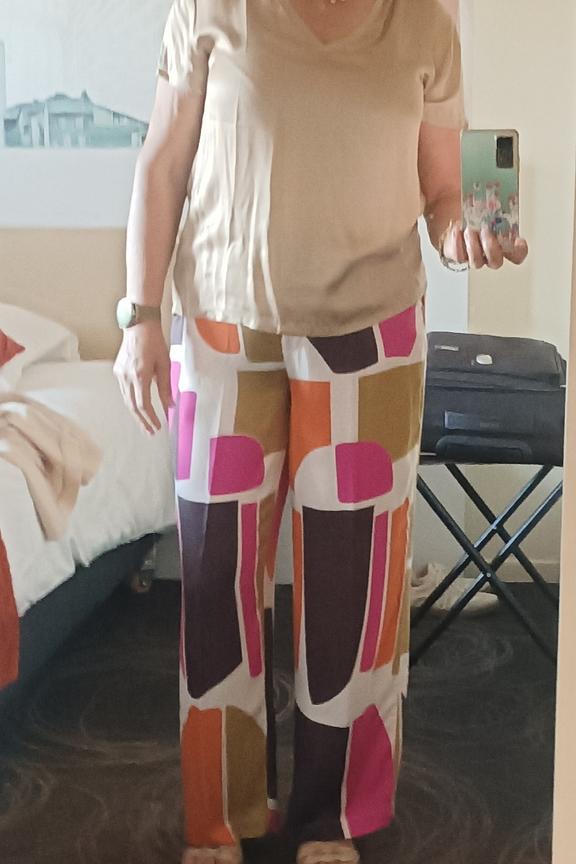 “Pantalon porté avec un haut crème doré, original, tissus fluide très agréable à porter”