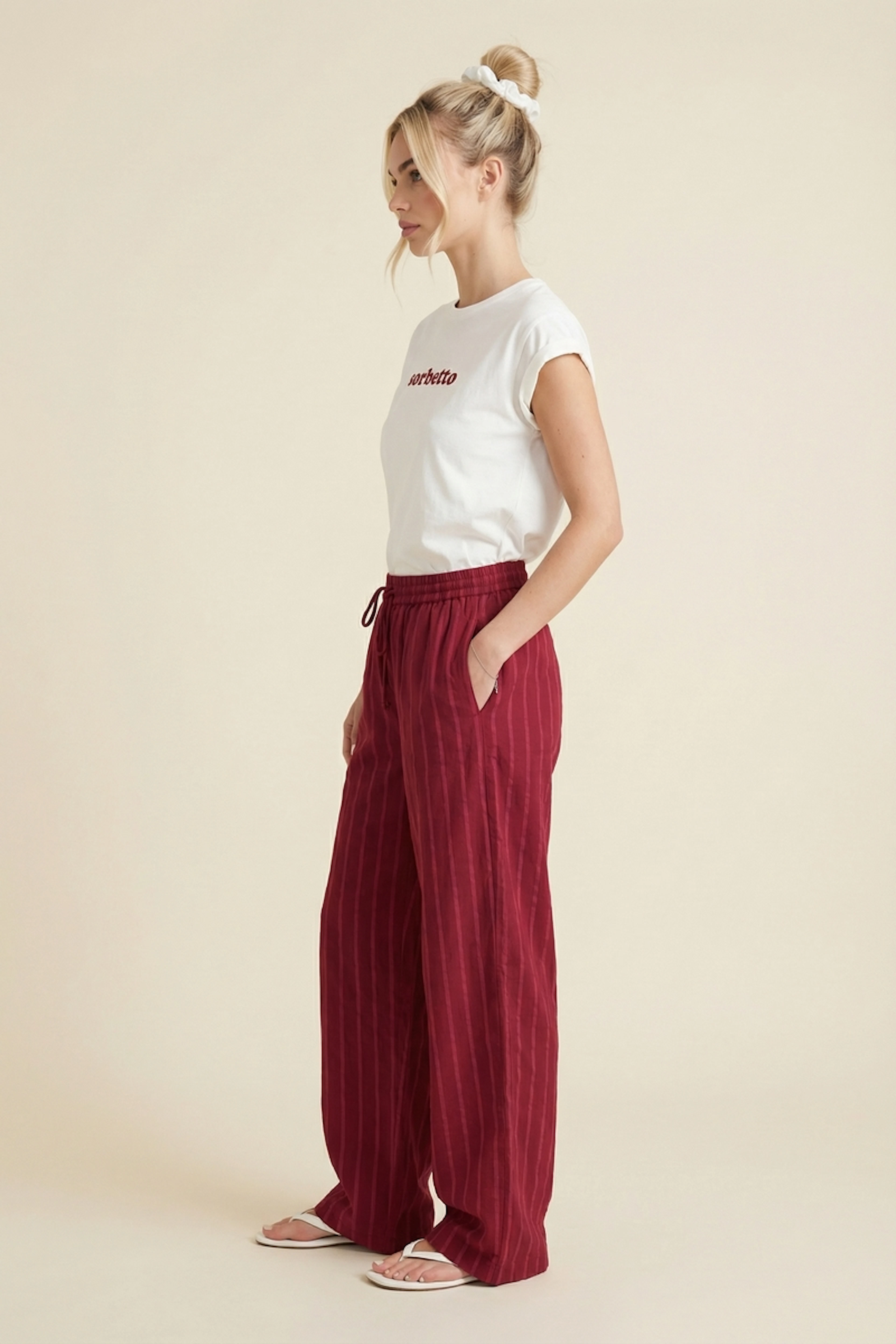 Associez ce pantalon avec un débardeur fluide et des sandales pour une allure décontractée et estivale. • Pantalon léger en coton et lin • Coupe ample et confortable • Taille élastique avec cordon • Longueur pleine • Motif rayures