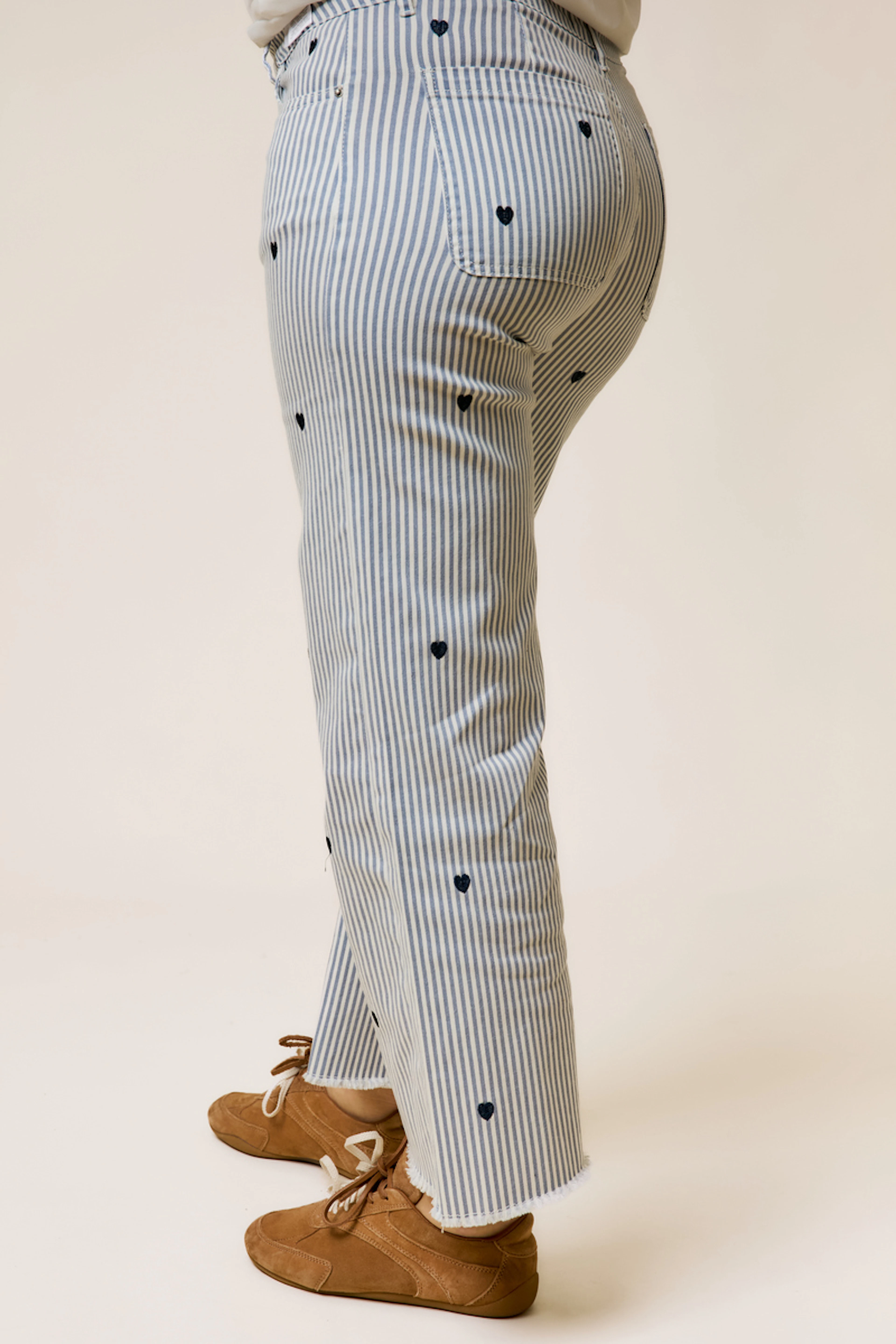Optez pour un look estival en associant ce pantalon à une blouse légère et des sandales minimalistes. Idéal pour les journées ensoleillées. • Pantalon en coton • Coupe décontractée • Taille mi-haute • Motif à rayures et fleurs discrètes • Longueur cheville