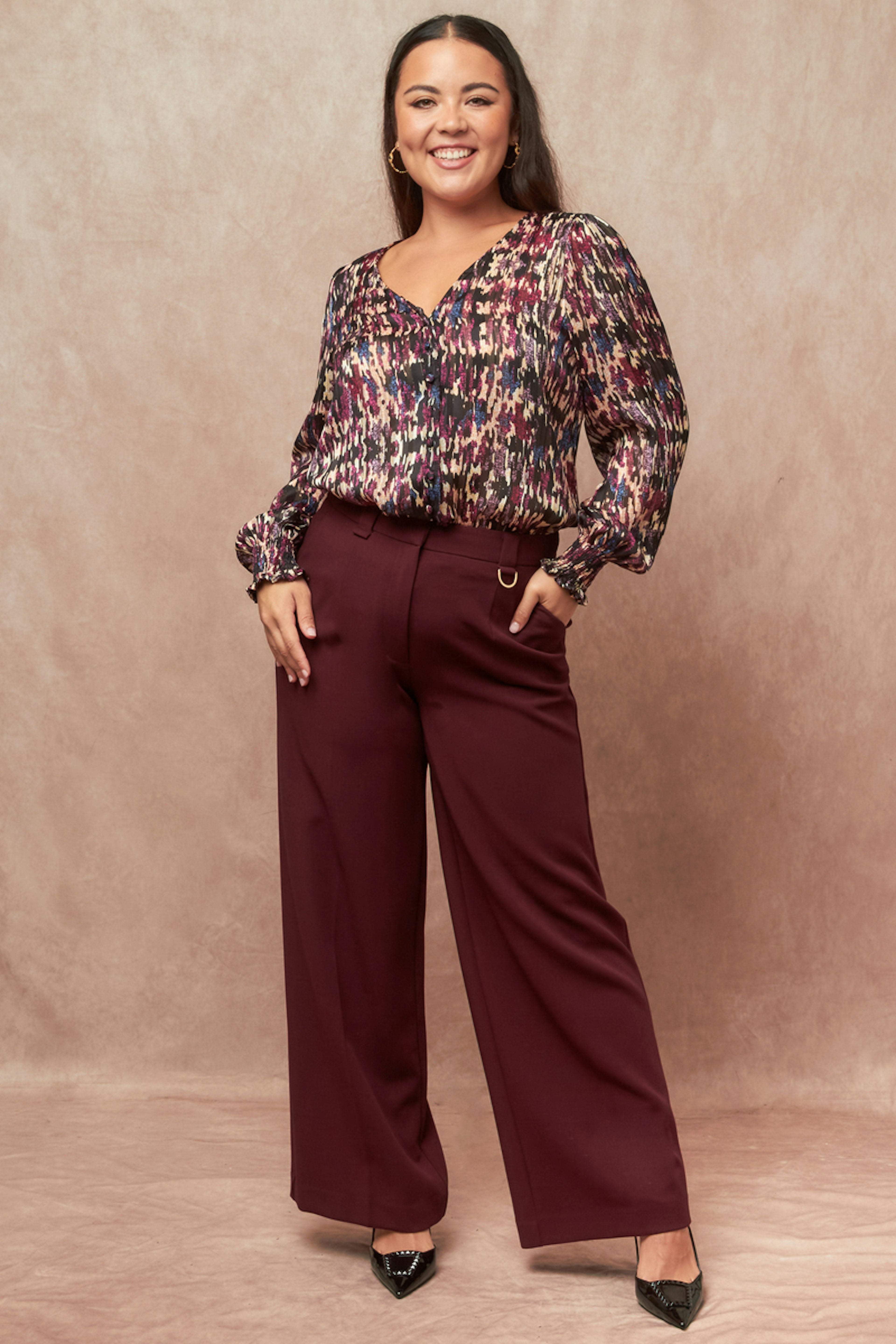 Associez ce pantalon à une chemise en soie et des talons pour une allure sophistiquée. • Pantalon large fluide • Taille haute flatteuse • Fermeture à glissière discrète • Détail de boucle dorée • Parfait en toute saison