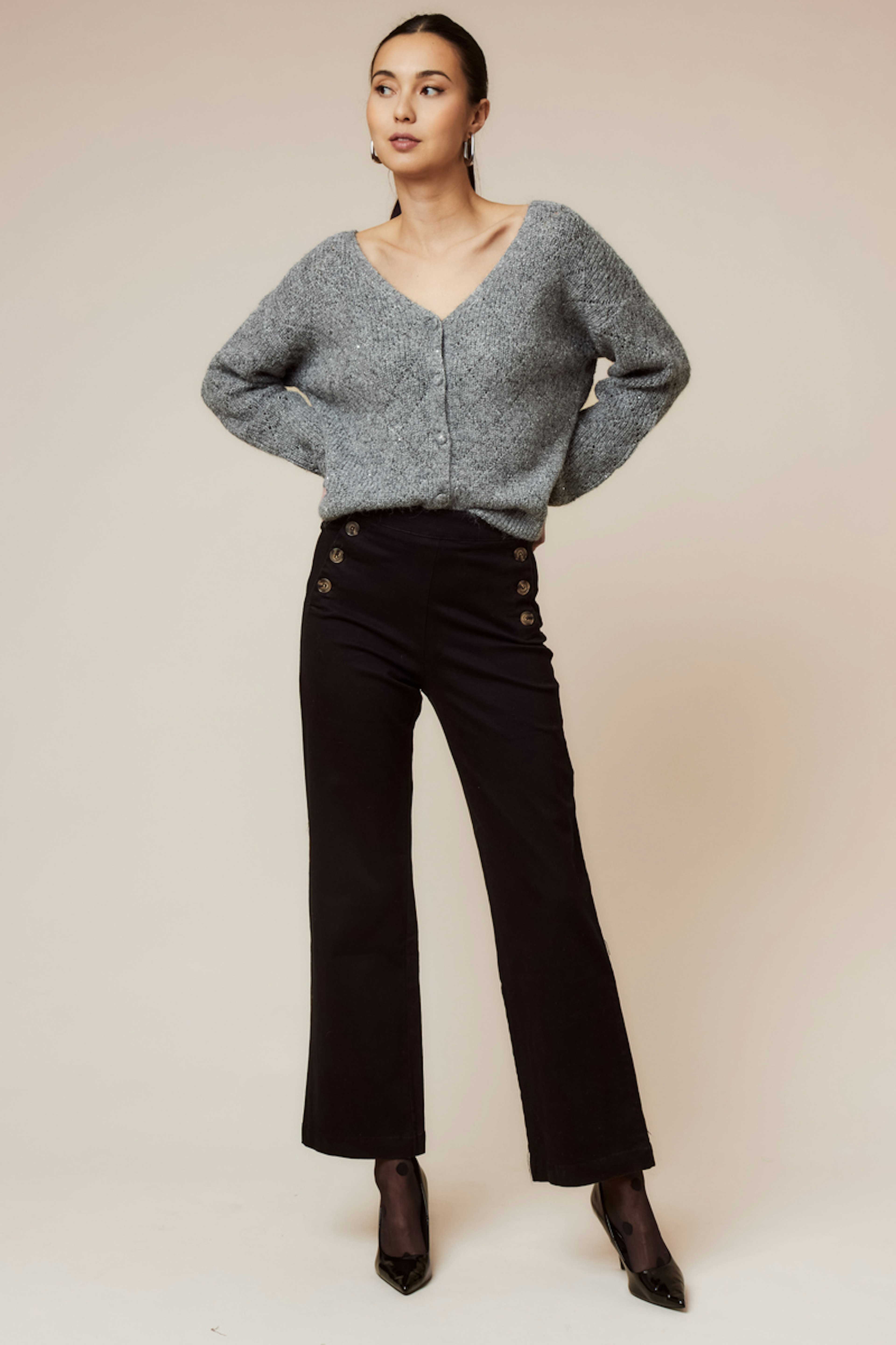 Optez pour une รฉlรฉgance intemporelle en associant ce pantalon ร  un chemisier fluide et des escarpins. Parfait en toute saison. โ€ข Pantalon large en coton โ€ข Taille haute flatteuse โ€ข Boutons dรฉcoratifs sur le cรดtรฉ โ€ข Coupe รฉvasรฉe chic โ€ข Couleur noire polyvalente