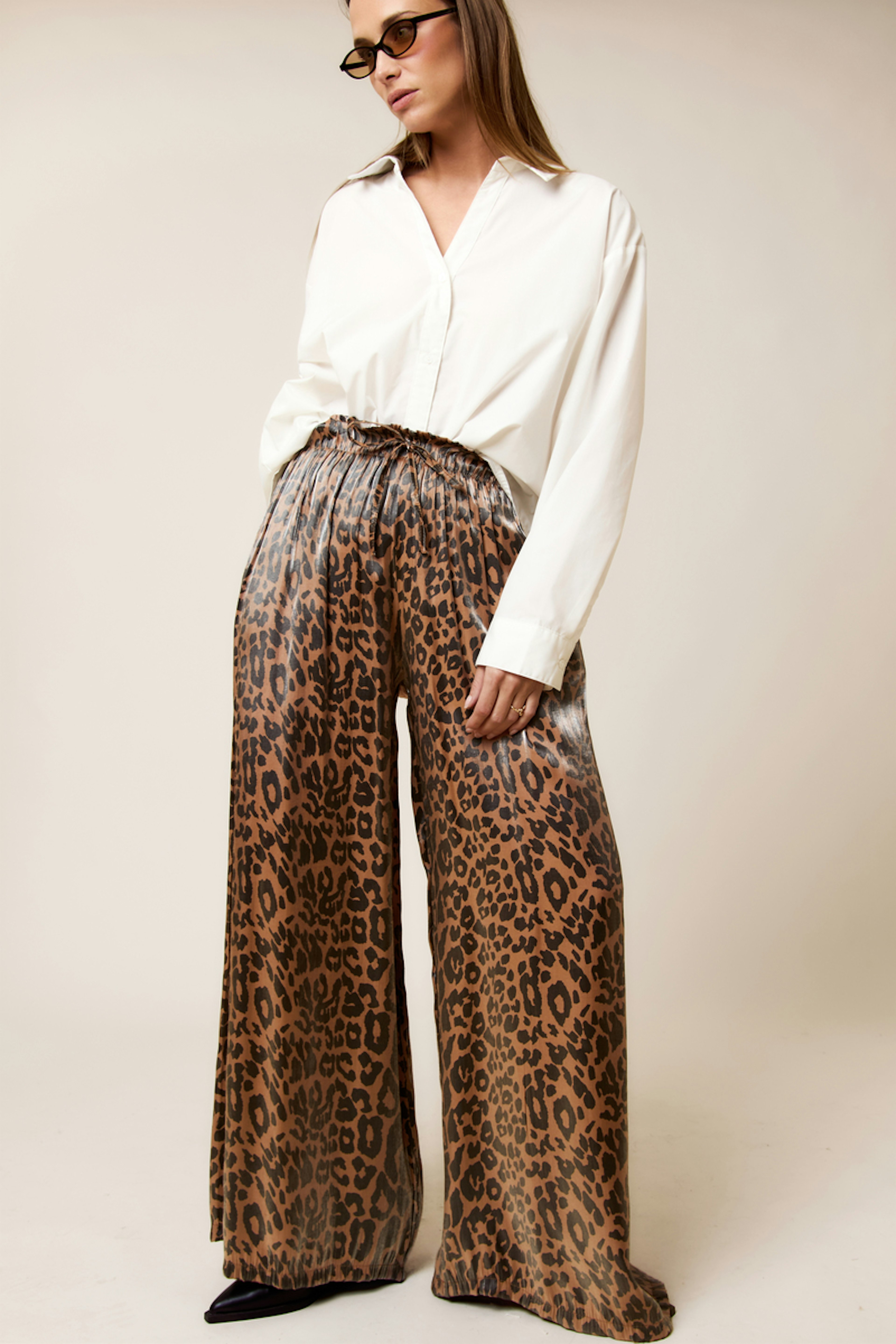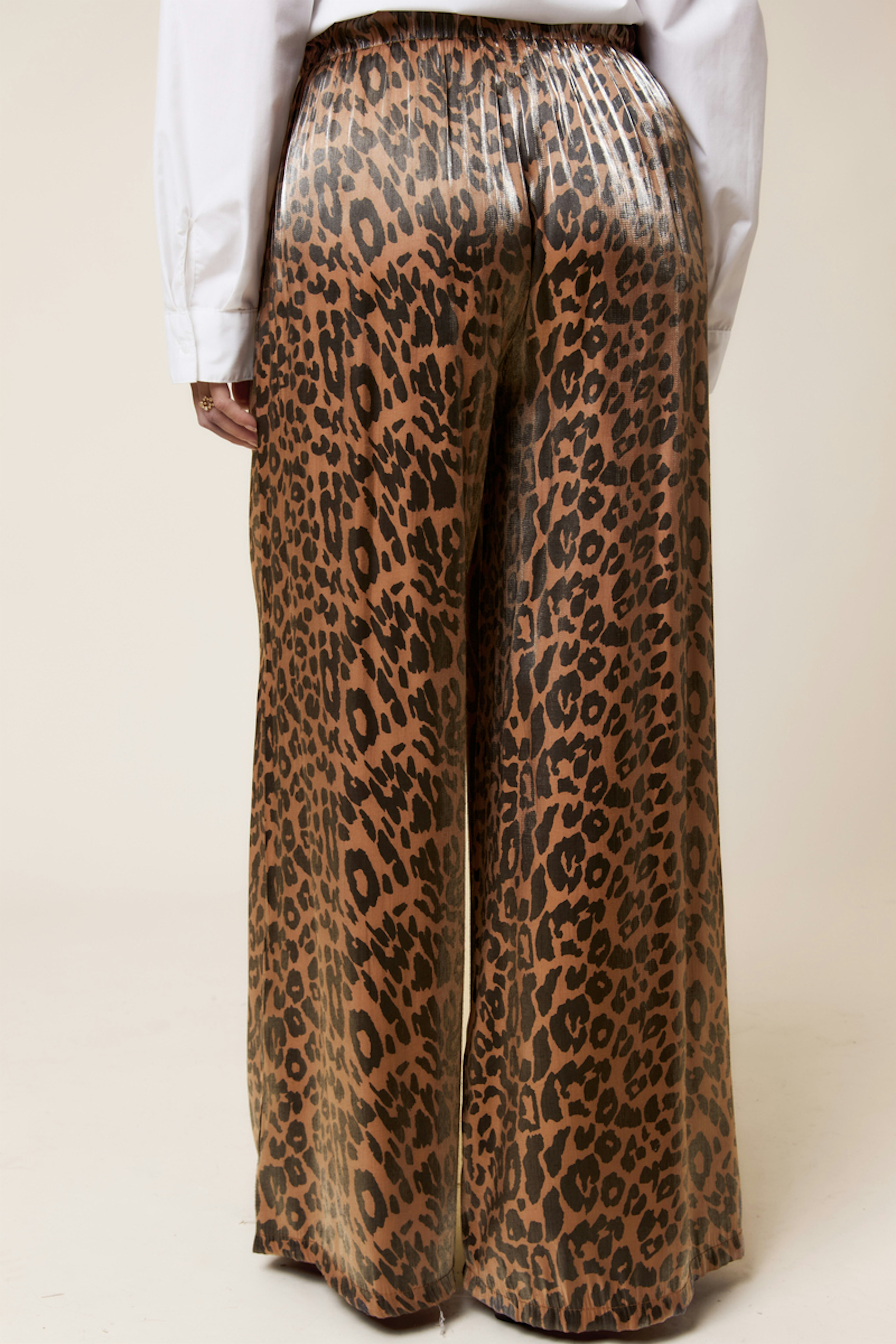 Ajoutez une touche de glamour sauvage à votre look avec ce pantalon imprimé léopard. Portez-le avec un haut uni et des baskets pour une allure décontractée et audacieuse. • Pantalon ample • Coupe large • Taille élastiquée • Imprimé léopard • Longueur complète
