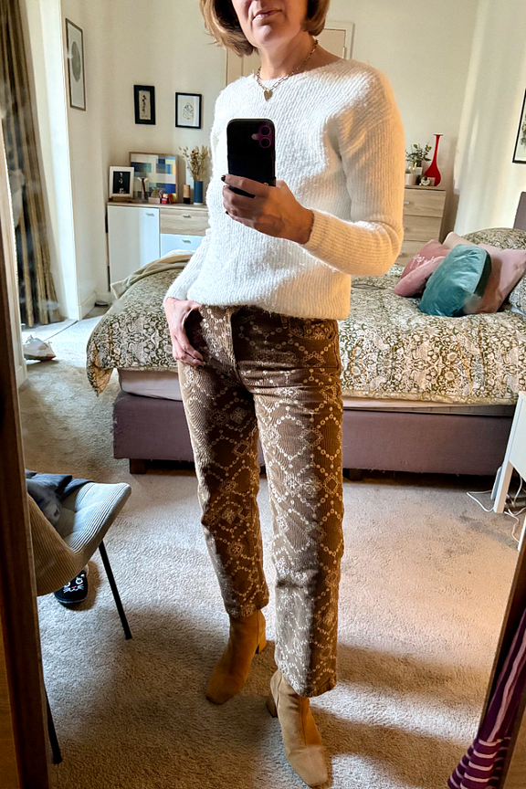 Associez ce pantalon avec un pull en laine crème et des bottines en daim pour un look hivernal chic. • Pantalon marron imprimé • Coupe droite • Taille mi-haute • Longueur cheville • Imprimé graphique