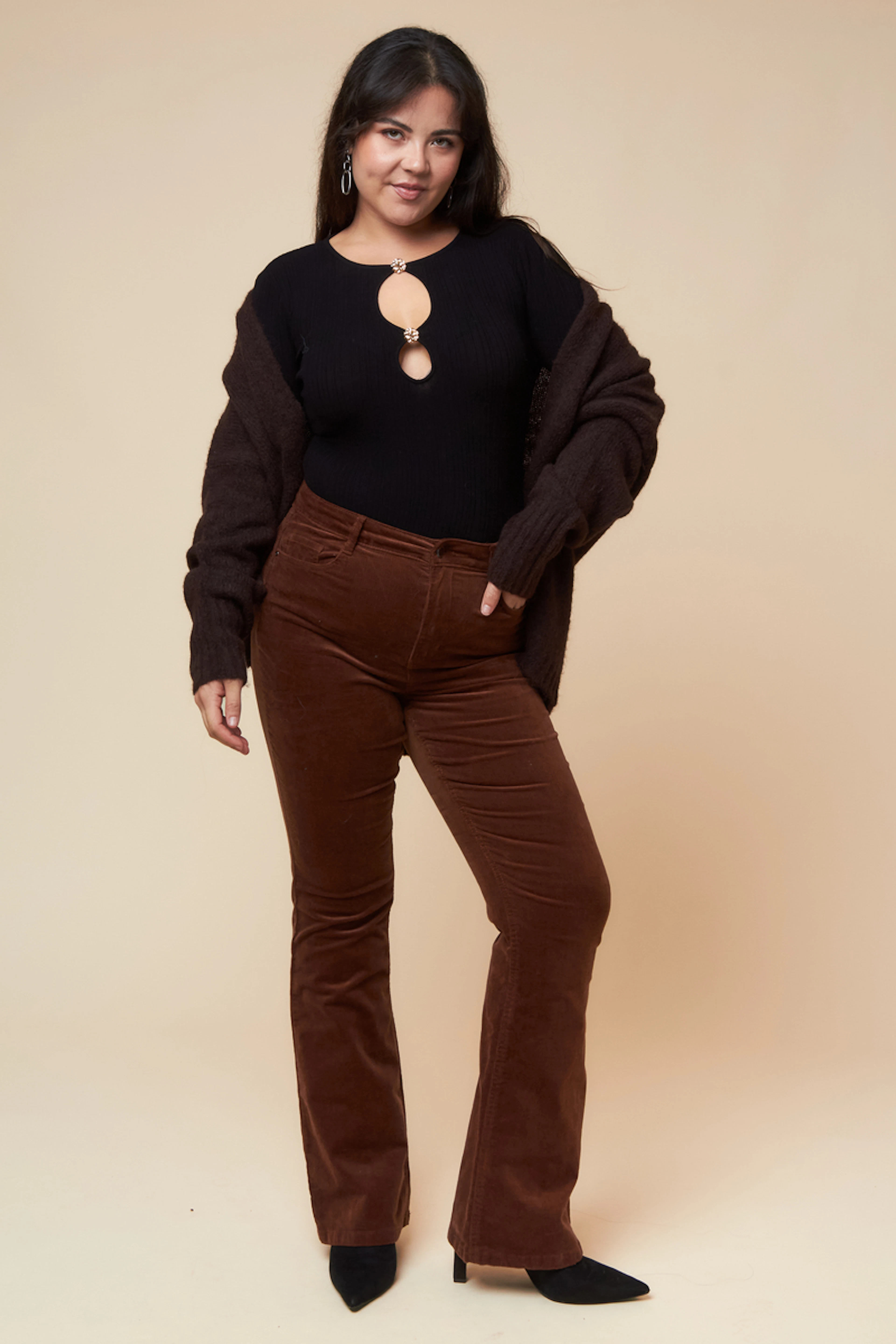 Associez ce pantalon avec un pull en laine beige et des bottes à talons. Ajoutez un foulard en soie pour plus de chic. Idéal pour l'hiver. • Pantalon en velours • Coupe flare • Taille haute • Fermeture éclair • Texture côtelée