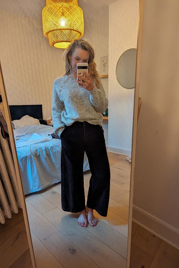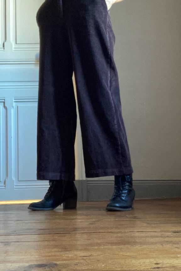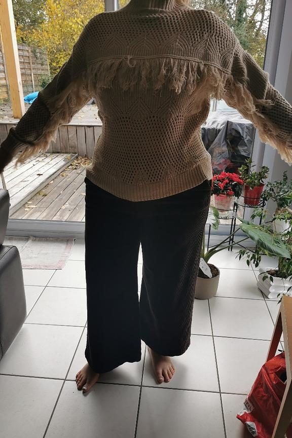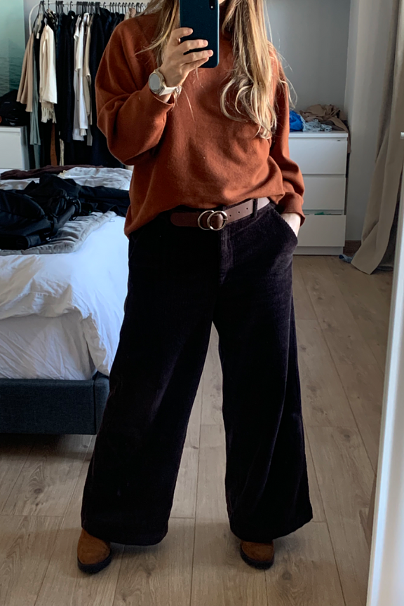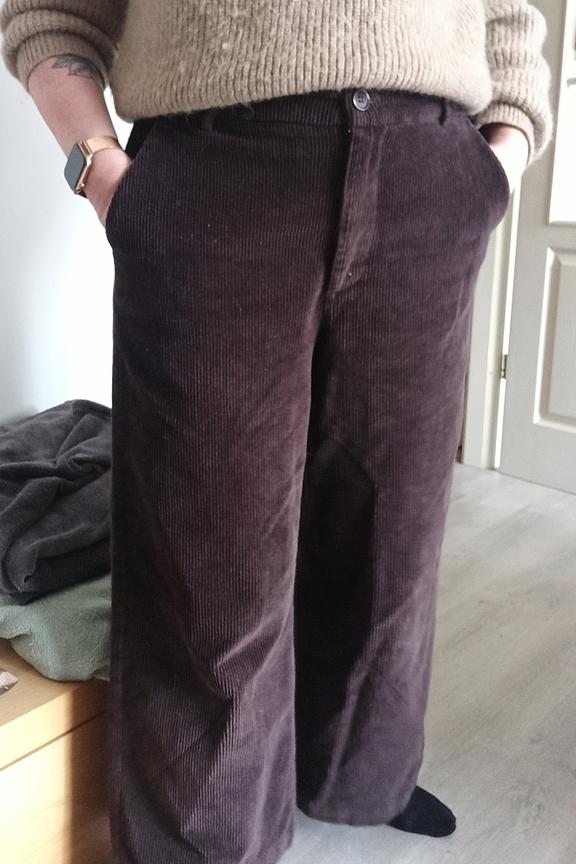 โข Pantalon marron โข Velours cรดtelรฉ โข Coupe large, taille haute โข Longueur 7/8รจme โข Fermeture par un zip et un bouton sur le devant โข Poches italiennes โข Passants de ceinture
