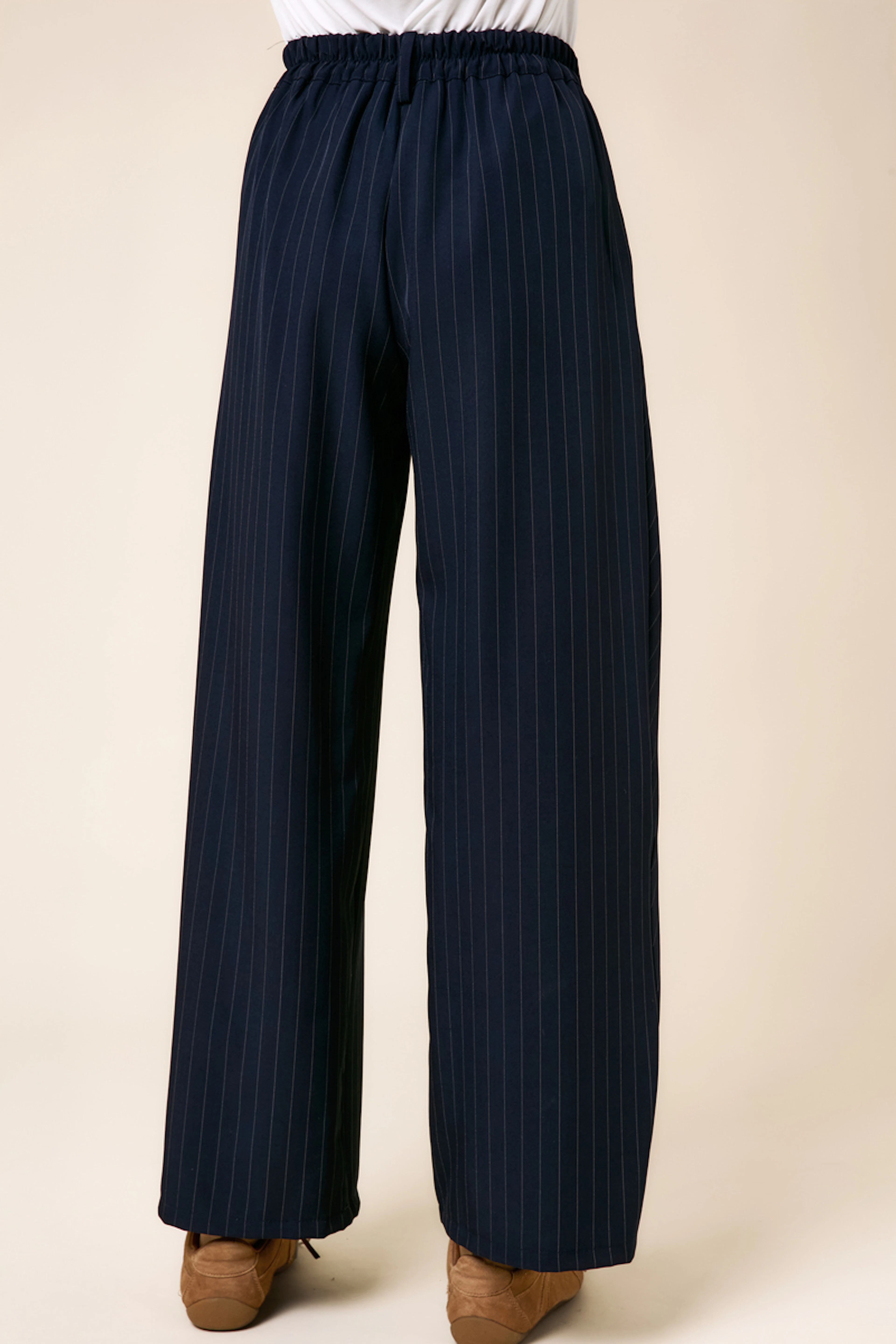 Optez pour un look moderne en associant ce pantalon avec un chemisier fluide et des mocassins. Parfait en toute saison. • Pantalon à rayures • Taille haute • Coupe ample • Fermeture à bouton visible • Poches latérales pratiques
