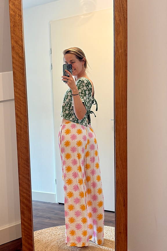 Portez ce pantalon avec un débardeur uni et des sandales dorées pour un look estival décontracté. • Pantalon fluide • Taille élastiquée • Imprimé graphique • Jambe large • Idéal pour les journées chaudes