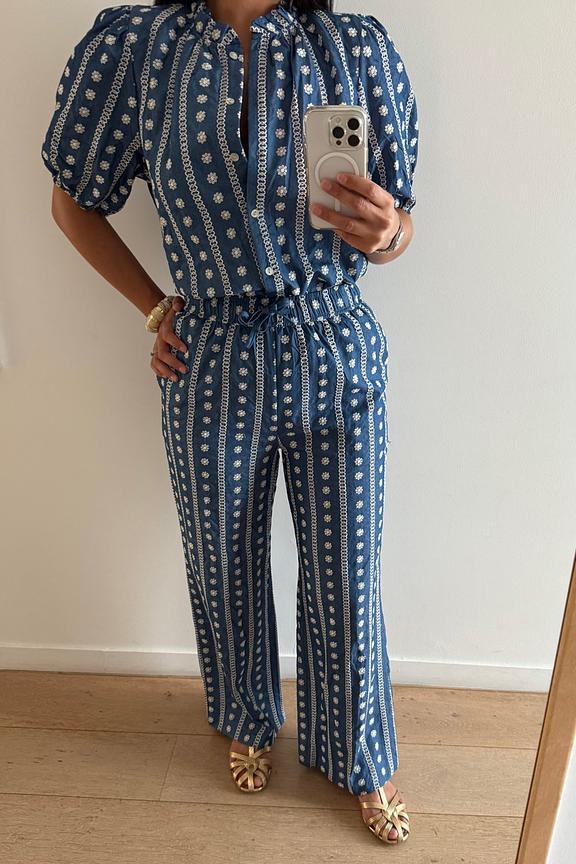 Associez ce pantalon avec un top uni et des sandales pour un look estival chic. Ajoutez un chapeau en paille pour une touche bohème. • Pantalon en coton • Taille élastique • Jambe large • Imprimé floral • Longueur pleine