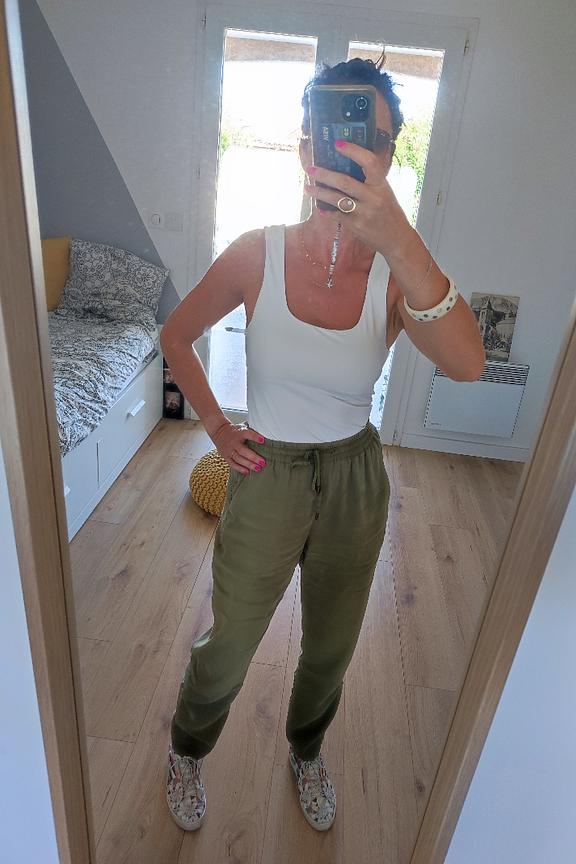 โMatiรจre trรจs agrรฉable pour l'รฉtรฉ mais se froisse rapidement. Lรฉgรจrement grand pour moi mais รงa passe avec le style du pantalonโ