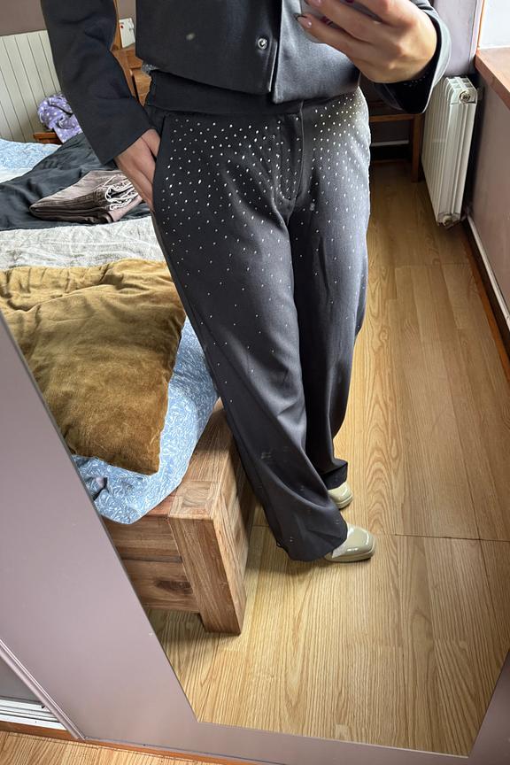 Associez ce pantalon avec un haut ajusté et des bottines argentées pour une allure urbaine chic, parfait pour illuminer l'hiver. • Pantalon large • Taille mi-haute • Coupe ample • Détails à clous • Tissu élégant et texturé