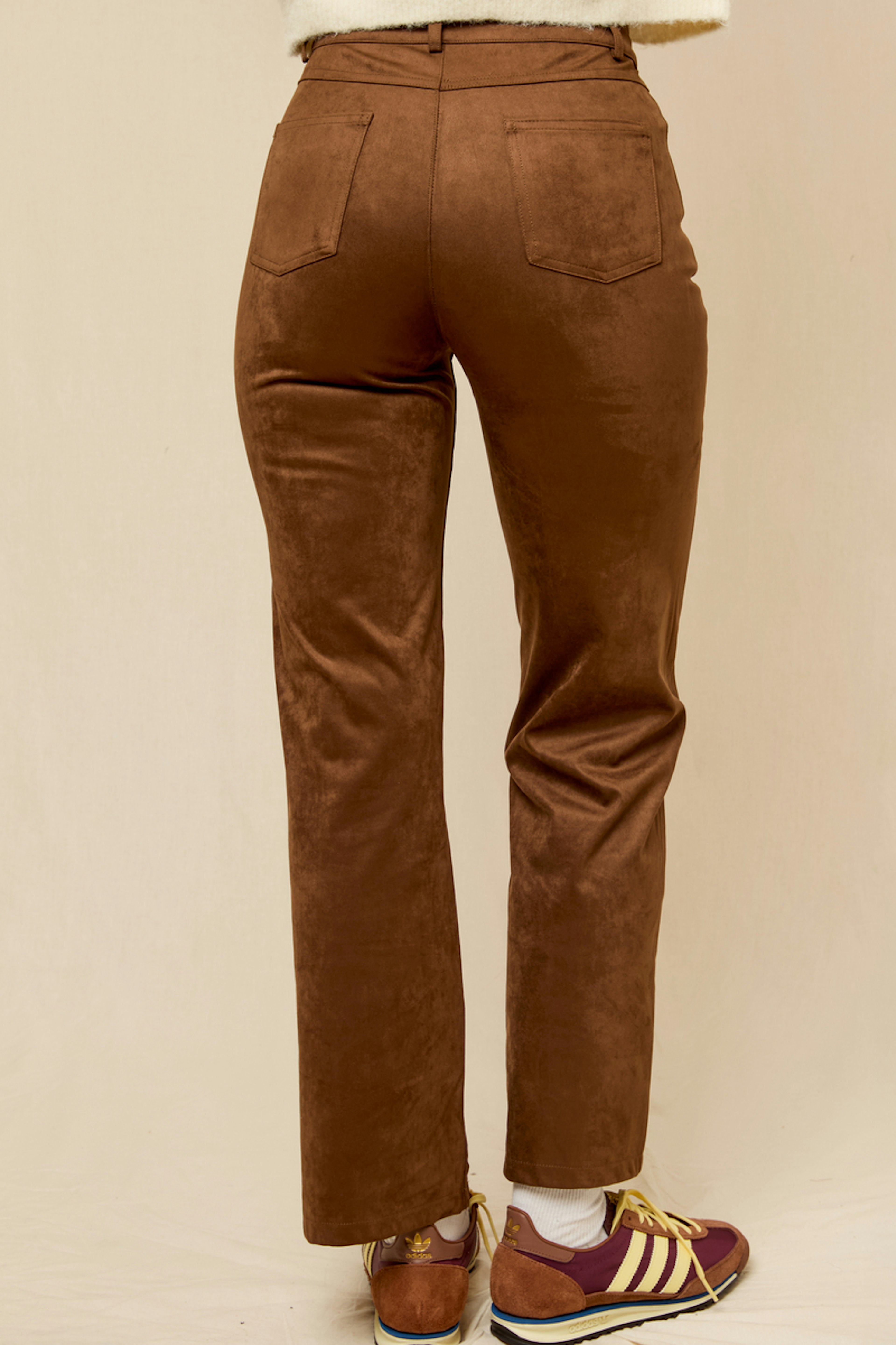 Associez ce pantalon avec un pull oversize et des bottines pour une allure chic et décontractée lors des journées fraîches. • Pantalon coupe droite • Taille mi-haute • Longueur standard • Texture veloutée • Couleur marron chaude